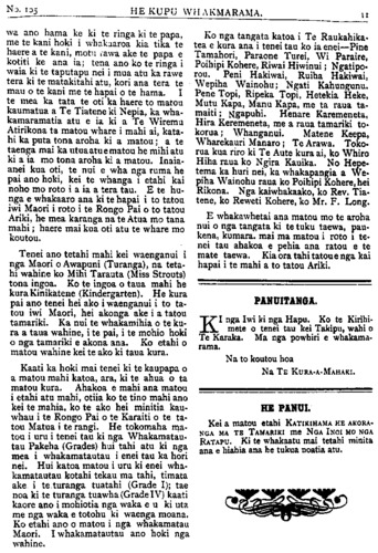 No. 105 HE KUPU WHAKAMARAMA. 11 wa ano hama ke ki te ringa ki te papa, me te kani hoki i whakaaroa kia tika te haere a te kani, motu rawa ake te papa e kotiti ke ana ia; tena ano ko te ringa i waia ki te taputapu nei i mua atu ka rawe tera ki te matakitahi atu, kori ana tera te mau o te kani me te hapai o te hama. I te mea ka tata te oti ka haere to matou kaumatua a Te Tiatene ki Nepia, ka wha- kamaramatia atu e ia ki a Te Wiremu Atirikona ta matou whare i mahi ai, kata- hi ka puta tona aroha ki a matou; a te taenga mai ka utua atu e matou he mihi atu ki a ia mo tona aroha ki a matou. Inaia- anei kua oti, te nui e wha nga ruma he pai ano hoki, kei te whanga i etahi kai noho mo roto i a ia a tera tau. E te hu- nga e whakaaro ana ki te hapai i to tatou iwi Maori i roto i te Rongo Pai o to tatou Ariki, he mea karanga na te Atua mo tana mahi; haere mai kua oti atu te whare mo koutou. Tenei ano tetahi mahi kei waenganui i nga Maori o Awapuni (Turanga), na teta- hi wahine ko Mihi Tarauta (Miss Strouts) tona ingoa. Ko te ingoa o taua mahi he kura Kinikatene (Kindergarten). He kura pai ano tenei hei ako i waenganui i to ta- tou iwi Maori, hei akonga ake i a tatou tamariki. Ka nui te whakamihia o te ku- ra a taua wahine, i te pai, i te mohio hoki o nga tamariki e akona ana. Ko etahi o matou wahine kei te ako ki taua kura. Kaati ka hoki mai tenei ki te kaupapa o a matou mahi katoa, ara, ki te ahua o ta matou kura. Ahakoa e mahi ana matou i etahi atu mahi, otiia ko te tino mahi ano kei te mahia, ko te ako hei minitia kau- whau i te Rongo Pai o te Karaiti o te ta- tou Matua i te rangi. He tokomaha ma- tou i uru i tenei tau ki nga Whakamatau- tau Pakeha (Grades) hui tahi atu ki nga mea i whakamatautau i enei tau ka hori nei. Hui katoa matou i uru ki enei wha- kamatautau kotahi tekau ma tahi, timata ake. i te turanga tuatahi (Grade 1); tae noa ki te turanga tuawha (Grade IV) kaati kaore ano i mohiotia nga waka e u ki uta me nga waka e totohu ki waenga moana. Ko etahi ano o matou i nga whakamatau Maori. I whakamatautau ano hoki nga wahine. Ko nga tangata katoa i Te Raukahika- tea e kura ana i tenei tau ko ia enei—Pine Tamahori, Paraone Turei, Wi Paraire, Poihipi Kohere, Riwai Hiwinui; Ngatipo- rou. Peni Hakiwai, Ruiha Hakiwai, Wepiha Wainohu; Ngati Kahungunu. Pene Topi, Ripeka Topi, Hetekia Heke. Mutu Kapa, Manu Kapa, me ta raua ta- maiti; Ngapuhi. Henare Karemeneta, Hira Karemeneta, me a raua tamariki to- korua; Whanganui. Matene Keepa, Wharekauri Manaro; Te Arawa. Toko- rua kua riro ki Te Aute kura ai, ko Whiro Hiha raua ko Ngira Kauika. No Hepe- tema ka huri nei, ka whakapangia a We- piha Wainohu raua ko Poihipi Kohere, hei Rikona. Nga kaiwhakaako, ko Rev. Tia- tene, ko Reweti Kohere, ko Mr. F. Long. E whakawhetai ana matou mo te aroha nui o nga tangata ki te tuku taewa, pau- kena, kumara mai ma matou i roto i te- nei tau ahakoa e pehia ana ratou e te mate taewa. Kia ora tahi tatou e nga kai hapai i te mahi a to tatou Ariki. PANUITANGA. KI nga Iwi ki nga Hapu. Ko te Kirihi- mete o tenei tau kei Takipu, wahi o Te Karaka. Ma nga powhiri e whakama- rama. Na to koutou hoa Na TE Kura a Mahaki.. HE PANUI. Kei a matou etahi KATIKIHAMA HE AKORA-. NGA MA TE TAMARIKI me NGA INOI MO NGA RATAPU. Ki te whakaatu mai tetahi minita ana e hiahia ana he tukua noatia atu.