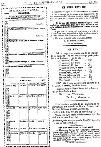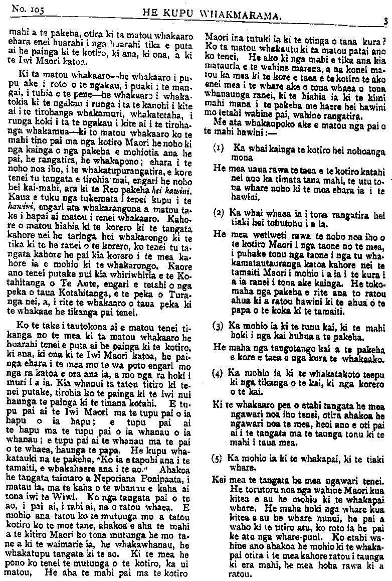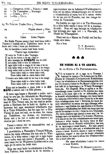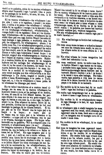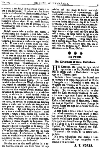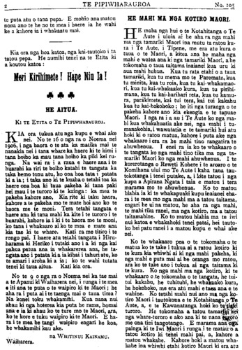 No. 105 o te tunu o ana kai, i te ma o tona whare o te ora o ana tamariki? E pehea ra ia ina haere mai te kotiro hawini kia kite hoki i tona whare? Ko enei nga take i mea ai matou he mea pai rawa te haere o nga kotiro ki nga pakeha rangatira noho ai ako ai ki nga mahi katoa a te wahine, kia rite ai ia mo te marena, mo te whakahaere i tona whare, mo te whakaako i ana tamariki. Kotahi ano te take e mohio ana matou e whakahuatia hei raupatu i enei take maha ara ko te mahi hawini he mahi na te pononga. E ki ana etahi tangata ki te mahi hawini te tangata e kore rawa e makere te ingoa hawini i a ia. E kore e nui a matou kupu hei wha- kautu i tenei korero a te tangata, waiho ma ratou ano e tuhituhi mai. He tika e ahua whakahaweatia ana te turanga hawini e te pakeha ano, otira ki ta matou whakaaro eha- ra. i te mea he tutua no te mahi i whakaha- weatia ai, engari no nga wahine pakeha ano pea e mahi hawini ana te tutua. Ki te mea na ta ratou mahi i whakahaweatia ai ratou, he aha hoki i kore ai e whakahaweatia nga wahine tiaki turoro he weriweri ke atu nei ta ratou mahi i ta te hawini? I whakahaweatia ai te hawini no te mea ko te tino nuinga o nga wahine pakeha e mahi hawini ana he hu nga kuare, tena ko te tiaki turoro e kore e whakaaetia nga wahine kuare. Ki te mahi hawini te tamahine a te Kingi, e kore ia e tu tua, engari ka tamahine tonu ano ma te Kingi, a, e marena ia ki tetahi Piriniha. E mohio. ana matou ki te wahine a tetahi minita i noho hawini ki te pakeha, kahore ia i te whakaha wetia, a ahakoa ia i mahi hawini i whai te minita ki a ia. Ko te tikanga o tenei kupu o te hawini he kaimahi, na konei he hawini ka toa tatou, he hawini he pononga nga tangata katoa e mahi ana ki tetahi atu tangata heoi ano pea te tangata, ehara i te hawini ko te e rorewaru. "Ko nga tangata whaiwhaka- aro e kore e whakahawea ki te kotiro i mahi hawini i runga i tona hiahia kia mohio ia, engari ko te kotiro e kore e tirohia e te ta- ngata whaiwhakaaro ko te kotiro mangere, whakahi, a i tona whakahi ka hakurara. Ka- hore he he o te mahi e whakahaweatia ai, ana ke te he ko te mangere ko te kuare. Ko nga kupu kei runga i te karauna o te Piriniha o Weri ko enei kupu "ich Dieu" ara ka mahi au—ka hawini. I te hiahia o te Karaiti kia mutu te whakahi o ana akonga horoia ana e ia o ratou waewae. E kiia ana nga hepara a te Karaiti he minita ara he hawini. He tika ano he kino etahi pakeha ki a ra- tou hawini, otira me ata titiro tonu ko nga pakeha pai me mahi te kotiro mo tetahi wa poto kia mohiotia ai te peheatanga. Ko etahi pakeha e tuku ana i a ratou hawini kia uru mai ki a ratou whanau, otira kei te ahua tonu o te kitiro te tikanga. He aha te pai o te uru o te kotiro kahore nei i tae ki te kura ki te whanau a te pakeha rangatira ira, tera taua ko- tiro e whakama, a, e hiahia oma ki te kitini. He tokomaha nga wahine rangatira o Inga rangi kua uru ki nga mahi kei raro rawa iho nei i a ratou, i to ratou mohio he pai ke atu te mahi i te mangere. I mea tetahi Rore ki te- tahi tangata rangatira, "Kua rongo ranei koe e marena ana a Rore Mea ki tetahi kotiro kaituhituhi?" Ka miharo tona hoa, ka ui mai, "Na wai te kotiro na?" Katahi ka wha- kahokia atu e te Rore, "Naku." HE PANUI. Hui Kirihimete ki Orete, Raukokore. HE Karanga atu tenei ki nga iwi, ki nga mana o te Tairawhiti kia hui mai ki Orete wahi o Raukokore i te 25 o nga ra o Tihema 1906. Te take o tenei karanga he hakari mo te taenga o te waea (tarepoono) ki Orete, i hangaia atu i Mataahu e tata ana ki Waipiro ma Waiapu ki Orete, te roa kua eke ki te 120 maero, na te Maori anake i hanga. Te rua o nga take, a ko te tino take he Kohi moni hei whakaea i te wahi e toe ana o nga moni i pau i te hanganga, hei kuku me atu kia tae te waea ki Te Kaha, a hei muri atu ki Maraenui, Torere tae noa ki Opotiki. Ko tona tikanga he i tuitui haere mo nga iwi o tenei wahi o te Tairawhiti. A tera hoki e puta i roto i taua hui nga tino whakamarama o nga mahi o tenei tau i roto i te Paremata, a tera e whakata- kotoria etahi kupu nunui mo nga whenua. E tae atu ana tenei karanga kia Ngatiawa, ki a Tuhoe ki a Te Whakatohea, haunga Ngaitai, Te Whanaua Apanui me Nga- tiporou, ko ratau te tangata whenua. Haramai; kia aroha ki ta tatou taon- ga hou. He mea whakahau mai maku e tuku atu mo te taha ki nga rangatira o te marae e tu ai te hui. A. T. NGATA.