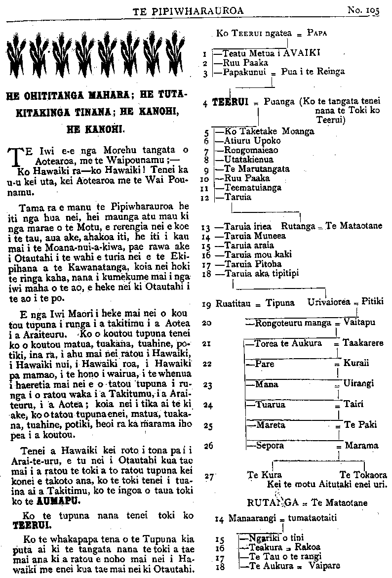 TE PIPIWHARAUROA HE OHITITANGA MAHARA; HE TUTA- KITAKINGA TINANA; HE KANOHI, HE KANOHI. TE Iwi e-e nga Morehu tangata o Aotearoa, me te Waipounamu;— Ko Hawaiki ra—ko Hawaiki! Tenei ka u-u kei uta, kei Aotearoa me te Wai Pou- namu. Tama ra e manu te Pipiwharauroa he iti nga hua nei, hei maunga atu mau ki nga marae o te Motu, e rerengia nei e koe i te tau, aua ake, ahakoa iti, he iti i kau mai i te Moana-nui-a-kiwa, pae rawa ake i Otautahi i te wahi e turia nei e te Eki- pihana a te Kawanatanga, koia nei hoki te ringa kaha, nana i kumekume mai i nga iwi maha o te ao, e heke nei ki Otautahi i te ao i te po. E nga Iwi Maori i heke mai nei o kou tou tupuna i runga i a takitimu i a Aotea i a Araiteuru. -Ko o koutou tupuna tenei ko o koutou matua, tuakaha, tuahine, po tiki, ina ra, i ahu mai hei ratou i Hawaiki, i Hawaiki nui, i Hawaiki roa, i Hawaiki pa mamao, i te hono i wairua, i te whenua i haeretia mai nei e o tatou tupuna i ru- nga i o ratou waka i a Takitimu, i a Arai- teuru, i a Aotea; koia nei i tika ai te ki ake, ko o tatou tupuna enei, matua, tuaka- na, tuahine, potiki, heoi ra ka marama iho pea i a koutou. Tenei a Hawaiki kei roto i tona pa i i Arai-te-uru, e tu nei i Otautahi kua tae mai i a ratou te toki a to ratou tupuna kei konei e takoto ana, ko te toki tenei i tua- ina ai a Takitimu, ko te ingoa o taua toki ko te AUMAPU. Ko te tupuna nana tenei toki ko TEERUI. Ko te whakapapa tena o te Tupuna kia puta ai ki te tangata nana te toki a tae mai ana ki a ratou e noho mai nei i Ha- waiki me enei kua tae mai nei ki Otautahi. Ko TEERUI ngatea = PAPA 1 —Teatu Metua i AVAIKI KI 2 —Ruu Paaka 3 —Papakunui = Pua i te Reinga 4 TEERUI = Puanga (Ko te tangata tenei nana te Toki ko \_\_\_\_\_\_ Teerui) 5 —Ko Taketake Moanga 6 —Atiuru Upoko 7-Rongomaieao 8 —Utatakienua 9 —Te Marutangata 10 —Ruu Paaka 11 —Teematuianga 12 —Tamia 13—Tamia mea Rutanga = Te Mataotane 14 —Taruia Muneea 15 —Tamia araia 16 —Tamia mou kaki 17 —Tamia Pitoha 18 —Tamia aka tipitipi 19 Ruatitau 19 =19\_ Ruatitau= Tipuna Urivaiorea = Pitiki 20 —Rongoteuro manga = Vaitapu • 21 —Torea te Aukura= Taakarere i 22 —Pare = Kuraii • 23 —Mana = Uirangi • I i. 24 —Tuarua = Tairi 25 —Mareta = Te Paki • 26 —Sepora = Marama ———————————————— 27 Te Kura Te Tokaora Kei te motu Aitutaki enei uri. RUTANGA = Te Mataotane 14 Manaarangi tumataotaiti 15 —Ngariki o tini 16 —Teakura = Rakoa 17 —Te Tau o te rangi 18 —Te Aukura = Vaipare