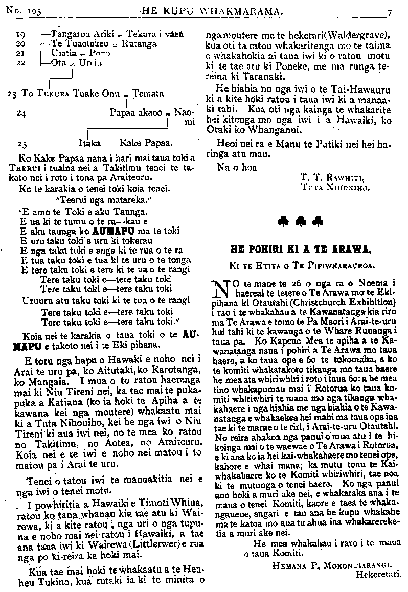 HE KUPU 19 —Tangaroa Ariki = Tekura i vaea 20 —Te Tuaotekeu Rutanga 21 —Uiatia = Pono 22 —Ota = Ureia 23 To TEKURA Tuake Onu = Temata 24 Papaa akaoo = Naomi 25 haka Kake Papaa. Ko Kake Papaa nana i hari mai taua toki a TEERUI i tuaroa nei a Takitimu tenei te ta- koto nei i roto i tona pa Araiteuru. Ko te karakia o tenei toki koia tenei. "Teerui nga matareka." "E amo te Toki e aku Taunga. E ua ki te tumu o te ra—kau e E aku taunga ko AUMAPU ma te toki E uru taku toki e uru ki tokerau E nga taku toki e anga ki te rua o te ra E tua taku toki e tua ki te uru o te tonga E tere taku toki e tere ki te ua o te rangi Tere taku toki e—tere taku toki Tere taku toki e—tere taku toki Uruuru atu taku toki ki te tua o te rangi Tere taku toki e—tere taku toki Tere taku toki e—tere taku toki." Koia nei te karakia o taua toki o te AU- MAPU e takoto nei i te Eki pihana. E toru nga hapu o Hawaki e noho nei i Arai te uru pa, ko Aitutaki, ko Rarotonga, ko Mangaia. I mua o to ratou haerenga mai ki Niu Tireni nei, ka tae mai te puka- puka a Katiana (ko ia hoki te Apiha a te kawana kei nga moutere) whakaatu mai ki a Tuta Nihoniho, kei he nga iwi o Niu Tireni ki aua iwi nei, no te mea ko ratou no Takitimu, no Aotea, no Araiteuru. Koia nei e te iwi e noho nei matou i to matou pa i Arai te uru. Tenei o tatou iwi te manaakitia nei e nga iwi o tenei motu. I powhiritia a Hawaiki e Timoti Whiua, ratou ko tana whanau kia tae atu ki Wai- rewa, ki a kite ratou i nga uri o nga tupu- na e noho mai nei ratou i Hawaiki, a tae ana taua iwi ki Wairewa (Littlerwer) e rua nga po ki reira ka hoki mai. Kua tae mai hoki te whakaatu a te Heu- heu Tukino, kua tutaki ia ki te minita o nga moutere me te heketari (Waldergrave), kua oti ta ratou whakaritenga mo te taima = whakahokia ai taua iwi ki o ratou motu ki te tae atu ki Poneke, me ma runga te- reina ki Taranaki. He hiahia no nga iwi o te Tai Hawauru ki a kite hoki ratou i taua iwi ki a manaa- ki tahi. Kua oti nga kainga te whakarite hei kitenga mo nga iwi i a Hawaiki, ko Otaki ko Whanganui. Heoi nei ra e Manu te Putiki nei hei ha. ringa atu mau. Na o hoa T. T. RAWHITI, TUTA NIHONIHO. HE POHIRI KI A TE ARAWA. Ki TE ETITA O TE PIPIWHARAUROA. NO te mane te 26 o nga ra o Noema i haerea i te tetere o Te Arawa mo te Eki- pihana ki Otautahi (Christchurch Exhibition) i rao i te whakahau a te Kawanatanga kia riro ma Te Arawa e tomo te Pa Maori i Arai -te •uru hui tahi ki te kawanga 6 te Whare Runanga i taua pa. Ko Kapene Mea te apiha a te Ka- wanatanga nana i pohiri a Te Arawa mo taua haere, a ko taua ope e 60 te tokomaha, a ko te komiti whakatakoto tikanga mo taua haere he mea ata whiriwhiri i roto i taua 60: a he mea tino whakapumau mai i Rotorua ko taua ko- miti whiriwhiri te mana mo nga tikanga wha- kahaere i nga hiahia me nga hiahia o te Kawa natanga e whakaekea hei mahi ma taua ope ina tae ki te marae o te riri, i Arai •te-uru Otautahi. No reira ahakoa nga panui o mua atu i te hi koinga mai o te waewae o Te Arawa i Rotorua, e ki ana ko ia hei kaiwhakahaere mo tenei ope, kahore e whai mana; ka mutu tonu te Kai whakahaere ko te Komiti whiriwhiri, tae noa ki te mutunga o tenei haere. Ko nga panui ano hoki a muri ake nei, e whakataka ana i te mana o tenei Komiti, kaore e taea te whaka- ngaueue, engari e tau ana he kupu whakahe mate katoa mo auatu ahua ina whakarereke- tia a muri ake nei. He mea whakahau i raro i te mana o taua Komiti. HEMANAP. MOKONUIARANGI. Hekeretari.