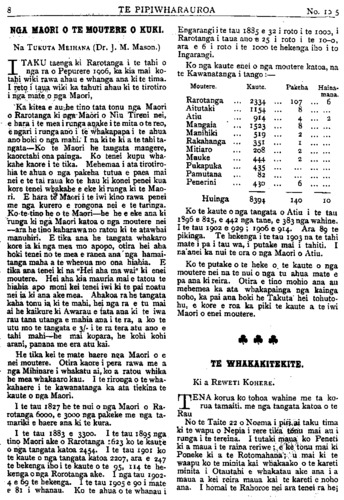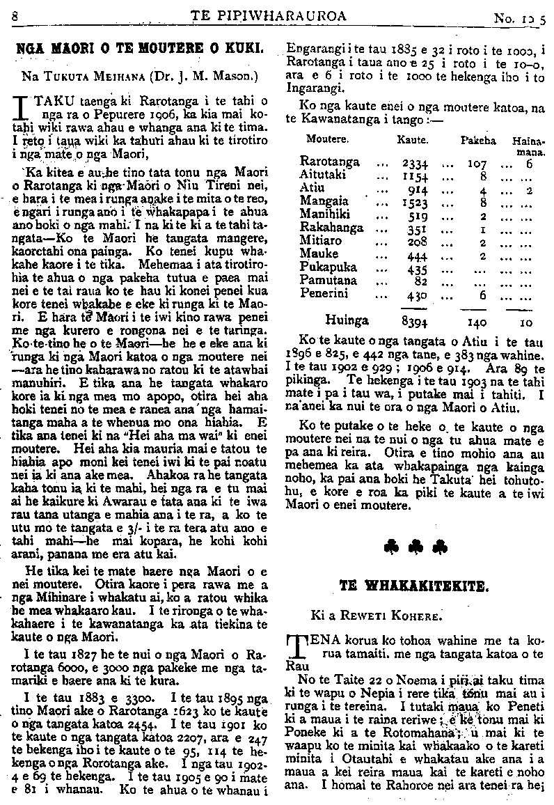 8 TE PIPIWHARAUROA No. 105 NGA MAORI O TE MOUTERE O KUKI. Na TUKUTA MEIHANA (Dr. J.M.Mason.) I TAKU taenga ki Rarotanga i te tahi o nga ra o Pepurere 1906, ka kia mai ko- tahi wiki rawa ahau e whanga ana ki te tima. I reto i taua wiki ka tahuti ahau ki te tirotiro i nga mate o nga Maori, Ka kitea e au he tino tata tonu nga Maori o Rarotanga ki nga Maori o Niu Tireni nei, e hara i te mea i runga anake i te mita o te reo, e ngari i runga ano i te whakapapa i te ahua ano hoki o nga mahi: I na ki te ki a te tahi ta- ngata—Ko te Maori he tangata mangere, kaoretahi ona painga. Ko tenei kupu wha- kahe kaore i te tika. Mehemaa i ata tirotiro- hia te ahua o nga pakeha tutua e paea mai nei e te tai raua ko te hau ki konei penei kua kore tenei whakahe e eke ki runga ki te Mao- ri. E hara te Maori i te iwi kino rawa penei me nga korero e rongona nei e te taringa. Ko te tino he o te Maori—he he e eke ana ki runga ki nga Maori katoa o nga moutere nei —ara he tino kaha rawa no ratou ki te atawhai manuhiri. E tika ana he tangata whakaro kore ia ki nga mea mo apopo, otira hei aha hoki tenei no te mea e ranea ana nga hamai- tanga maha a te whenua mo ona hiahia. E tika ana tenei ki na "Hei aha ma wai" ki enei moutere. Hei aha kia mauria mai e tatou te hiahia apo moni kei tenei iwi ki te pai noatu nei ia ki ana ake mea. Ahakoa ra he tangata kaha tonu ia ki te mahi, hei nga ra e tu mai ai he kaikure ki Awarau e tata ana ki te iwa rau tana utanga e mahia ana i te ra, a ko te utu mo te tangata e 3/ - i te ra tera atu ano e tahi mahi—he mai kopara, he kohi kohi arani, panana me era atu kai. He tika kei te mate haere nga Maori o e nei moutere. Otira kaore i pera rawa me a nga Mihinare i whakatu ai, ko a ratou whika he mea whakaaro kau. I te rironga o te wha- kahaere i te kawanatanga ka ata tiakina te kaute o nga Maori. I te tau 1827 he te nui o nga Maori o Ra- rotanga 6000, e 3000 nga pakeke me nga ta- mariki e haere ana ki te kura. I te tau 1883 e 3300. I te tau 1895 nga tino Maori ake o Rarotanga 1623 ko te kaute o nga tangata katoa 2454 I te tau 1895 nga te kaute o nga tangata katoa 2207, ara e 247 te hekenga iho i te kaute o te 95 114 te he- kenga onga Rorotanga ake. I nga tau 1902 4 e 69 te hekenga. I te tau 1905 e 90 i mate e 81 i whanau. Ko te ahua o te whanau i Engarangi i te tau 1885 e 32 i roto i te 1000, i Rarotanga i taua ano e 25 i roto i te 10-0, ara e 6 i roto i te 1000 te hekenga iho i to Ingarangi. Ko nga kaute enei o nga moutere katoa, na te Kawanatanga i tango;— Moutere. Rarotanga Ai tutaki Atiu Mangaia Manihiki Rakahanga Mitiaro Mauke Pukapuka Pamutana Penerini Huinga 8394 140 10 Ko te kaute o nga tangata o Atiu i te tau 1896 e 825, e 442 nga tane, e 383 nga wahine. I te tau 1902 e 929; I1906 e 914 Ara 89 te pikinga. Te hekenga i te tau 1903 na te tahi mate i pa i tau wa, i putake mai i tahiti. I na anei ka nui te ora o nga Maori o Atiu. Ko te putake o te heke o. te kaute o nga moutere nei na te nui o nga tu ahua mate e pa ana ki reira. Otira e tino mohio ana au mehemea ka ata whakapainga nga kainga noho, ka pai ana hoki he Takuta hei tohuto- hu, e kore e roa ka piki te kaute a te iwi Maori o enei moutere. TE WHAKAKITEKITE. Ki a REWETI KOHERE. TENA korua ko tohoa wahine me ta ko- rua tamaiti me nga tangata katoa o te Rau No te Taite 22 o Noema i piri ai taku tima ki te wapu o Nepia i rere tika tonu mai au i runga i te tereina. I tutaki maua. ko Peneti ki a maua i te raina reriwe; e ke tonu mai ki Poneke ki a te Rotomahana u mai ki te waapu ko te minita kai whakaako o te kareti minita i Otautahi e whakatau ake ana i a maua a kei reira maua kai te kareti e noho ana. I homai te Rahoroe nei ara tenei ra hei