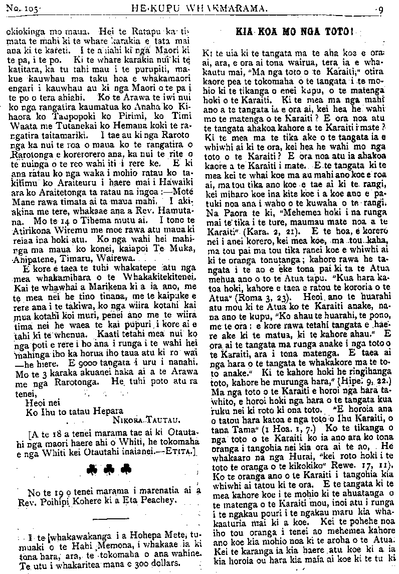 No. 105 okiokinga mo maua. Hei te Ratapu ka ti mata te mahi ki te whare karakia e tata mai ana ki te kareti. I te ahiahi ki nga Maori ki te pa, i te po. Ki te whare karakia nui ki te katitara, ka tu tahi mau i te purupiti, ma- kue kauwhau ma taku hoa e whakamaori engari i kauwhau au ki nga Maori o te pa i te po o tera ahiahi. Ko te Arawa te iwi nui ko nga rangatira kaumatua ko Anaha ko Ki- haora ko Taupopoki ko Pirimi, ko Timi Waata me Tutanekai ko Hemana koki te ra- ngatira taitamariki. I tae au ki nga Raroto nga ka nui te roa o maua ko te rangatira o Rarotonga e korerorero ana, ka nui te rite o te nuinga o te reo wahi iti i rere ke. E ki ana ratau ko nga waka i mohio ratau ko ta- kitimu ko Araiteuru i haere mai i Hawaiki ara ko Araitetonga ta ratau na ingoa:—Mote Mane rawa timata ai ta maua mahi. I aki- akina me tere, whakaae ana a Rev. Hamuta- na. Mo te 14 o Tihema mutu ai. I tono te Atirikona Wiremu me moe rawa atu maua ki reiaa ina hoki atu. Konga wahi hei mahi- nga ma maua ko konei, kaiapoi Te Muka, Ahipatene, Timaru, Wairewa. E kore e taea te tuhi whakatepe atu nga mea whakamihara o te Whakakitekitenei. Kai te whawhai a Marikena ki a ia ano, me te mea nei he tino tinana, me te kaipuke e rere ana i te takiwa, ko nga wiira kotahi kai mua kotahi koi muri, penei ano me te wiira tiroa nei he waea te kai pupuri i kore ai e tahi ki te whenua. Kaati tetahi mea nui ko nga poti e rere i ho ana i runga i te wahi hei mahinga iho ka horua iho taua atu ki ro wai he hiere. E 9000 tangata -i uru i nanahi. Mo te 3 karaka akuanei haka ai a te Arawa me nga Rarotonga. He. tuhi poto atu ra tenei, Heoi nei Ko Ihu to tatau Hepara NIKORA TAUTAU [A te 18 a tenei marama tae ai ki Otauta- hi nga maori haere ahi o Whiti, he tokomaha e nga Whiti kei Otautahi inaianei.—ETITA.] No te 19 o tenei marama i marenatia ai a Rev. Poihipi Kohere ki a Eta Peachey. I te [whakawakanga i a Hohepa Mete, tu- muaki o te Hahi Memona, i whakaae ia ki tona hara, ara, te tokomaha o ana wahine. Te utu i whakaritea mana e 300 dollars. KIA KOA MO NGA TOTOI Ki te wa ki te tangata ma te aha koe e ora ai, ara, e ora ai tona wairua, tera ia e wha- kautu mai, "Ma nga toto o te Karaiti," otira kaore pea te tokomaha 6 te tangata i te mo- hio ki te tikanga o enei kupu, o te matenga hoki o te Karaiti. Ki te mea ma nga mahi ano a te tangata ia e ora ai, kei hea he wahi mo te matenga o te Karaiti? E ora noa atu te tangata ahakoa kahore a te Karaiti i mate? Ki te mea ma te tika ake o te tangata ia e whiwhi ai ki te ora, kei hea he wahi mo nga toto o te Karaiti? E ora noa atu ia ahakoa kaore a te Karaiti i mate. E te tangata ki te mea kei te whai koe ma au mahi ano koe e roa ai, matou tika ano koe e tae ai ki te. rangi, kei miharo koe ina kite koe i a koe ano e pa tuki noa ana i waho o te kuwaha o te rangi. Na Paora te ki, "Mehemea hoki i na runga mai te tika i te ture, maumau mate noa a te Karaiti" (Kara. 2, 21). E te hoa, e korero nei i anei korero, kei mea koe, ma .tou kaha, ma tou pai ma tou tika ranei koe e whiwhi ai ki te oranga tonutanga; kahore rawa he ta- ngata i te ao e eke tona pai ki ta te Atua mehua ano o to te Atua tapu. "Kua hara ka- toa hoki, kahore e taea e ratou te kororia o te Atua" (Roma 3, 23). Heoi. ano te huarahi atu mou ki te Atua ko te Karaiti anake, na- na ano te kupu, "Ko ahau te huarahi, te pono, me te ora: e kore rawa tetahi tangata e hae re ake ki te matua, ki te kahore ahau." E ora ai te tangata ma runga anake i nga toto o te karaiti, ara i tona matenga. E taea ai nga hara o te tangata te whakakore ma te to- to anake." Ki te kahore hoki he ringihanga toto, kahore he murunga hara," (Hipe. 9, 22.) Ma nga toto o te Karaiti e horoi nga hara ta- whito, e horoi hoki nga hara o te tangata kua ruku nei ki roto ki ona toto. "E horoia ana o tatou hara katoa e nga toto o Ihu Karaiti, o tana Tama" (1 Hoa. 1, 7.) Ko te tikanga o nga toto o te Karaiti ko ia ano ara ko tona oranga i tangohia nei kia ora ai te ao, He whakaaro na nga Hurai, "kei roto hoki i te toto te oranga o te kikokiko" Rewe. 17, 11). Ko te oranga ano o te Karaiti i tangohia kia whiwhi ai tatou ki te ora. E te tangata ki te mea kahore koe i te mohio ki te ahuatanga o te matenga o te Karaiti mou, inoi atu i runga i te ngakau pouri i te ngakau maru kia wha- kaaturia mai ki a koe. Kei te pohehe noa iho tou oranga i tenei ao mehemea kahore ano koe kia mohio noa ki te aroha o te Atua. Kei te karanga ia kia haere atu koe ki a ia kia horoia ou hara kia maia ai koe ki te tu ki