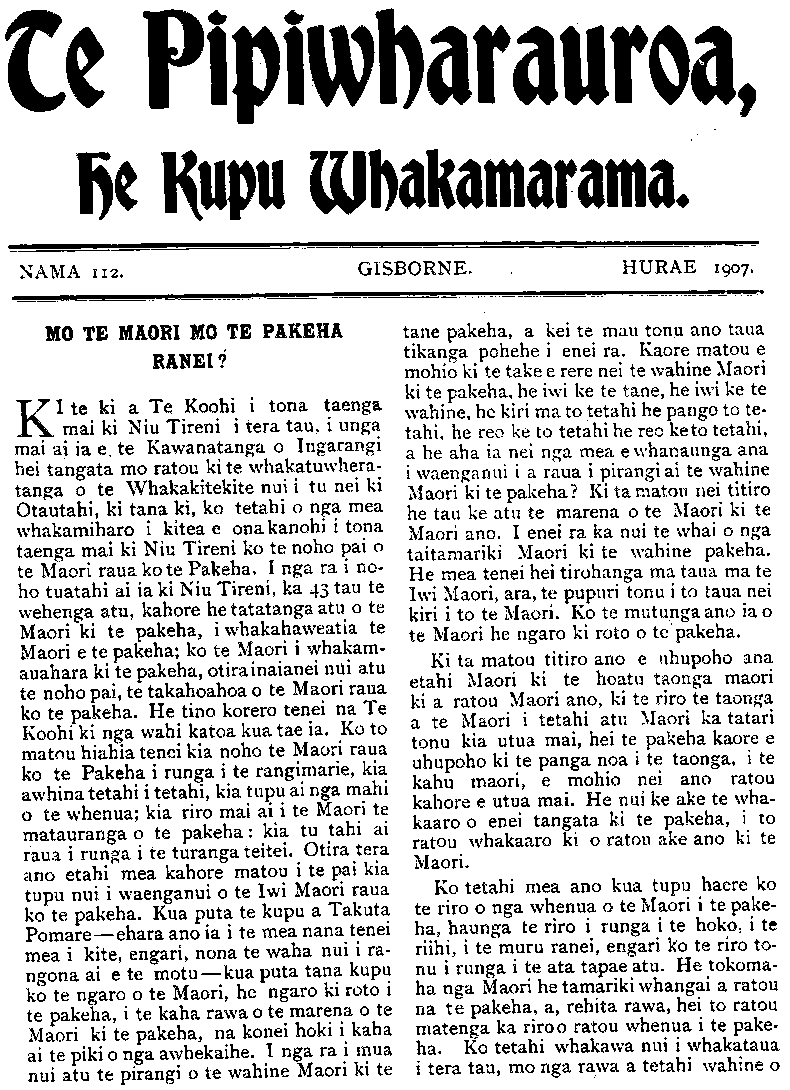 Te Pipiwharauroa, He Kupu Whakamarama. Nama 112 GISBORNE Hurae 1907 MO TE MAORI MO TE PAKEHA RANEI? KI te ki a Te Koohi i tona taenga mai ki Niu Tireni i tera tau, i unga mai ai ia e. te Kawanatanga o Ingarangi hei tangata mo ratou ki te whakatuwhera- tanga o te Whakakitekite nui i tu nei ki Otautahi, ki tana ki, ko tetahi o nga mea whakamiharo i kitea e ona kanohi i tona taenga mai ki Niu Tireni ko te noho pai o te Maori raua kote Pakeha. I nga ra i no- ho tuatahi ai ia ki Niu Tireni, ka 43 tau te wehenga atu, kahore he tatatanga atu o te Maori ki te pakeha, i whakahaweatia te Maori e te pakeha; ko te Maori i whakama- auahara ki te pakeha, otira inaianei nui atu te noho pai, te takahoahoa o te Maori raua ko te pakeha. He tino korero tenei na Te Koohi ki nga wahi katoa kua tae ia. Ko to matou hiahia tenei kia noho te Maori raua ko te Pakeha i runga i te rangimarie, kia awhina tetahi i tetahi, kia tupu ai nga mahi o te whenua; kia riro mai ai i te Maori te matauranga o te pakeha: kia tu tahi ai raua i runga i te turanga teitei. Otira tera ano etahi mea kahore matou i te pai kia tupu nui i waenganui o te Iwi Maori raua ko te pakeha. Kua puta te kupu a Takuta Pomare—ehara ano ia i te mea nana tenei mea i kite, engari, nona te waha nui i ra- ngona ai e te motu—kua puta tana kupu ko te ngaro o te Maori, he ngaro ki roto i te pakeha, i te kaha rawa o te marena o te Maori ki te pakeha, na konei hoki i kaha ai te piki o nga awhekaihe. I nga ra i mua nui atu te pirangi o te wahine Maori ki te tane pakeha, a kei te mau tonu ano taua tikanga pohehe i enei ra. Kaore matou e mohio ki te take e rere nei te wahine Maori ki te pakeha, he iwi ke te tane, he iwi ke te wahine, he kiri ma to tetahi he pango to te- tahi, he reo ke to tetahi he reo keto tetahi, a he aha ia nei nga mea e whanaunga ana i waenganui i a raua i pirangi ai te wahine Maori ki te pakeha? Ki ta matou nei titiro he tau ke atu te marena o te Maori ki te Maori ano. I enei ra ka nui te whai o nga taitamariki Maori ki te wahine pakeha. He mea tenei hei tirohanga ma taua ma te Iwi Maori, ara, te pupuri tonu i to taua nei kiri i to te Maori. Ko te mutunga ano ia o te Maori he ngaro ki roto o te pakeha. Ki ta matou titiro ano e uhupoho ana etahi Maori ki te hoatu taonga maori ki a ratou Maori ano, ki te riro te taonga a te Maori i tetahi atu Maori ka tatari tonu kia utua mai, hei te pakeha kaore e uhupoho ki te panga noa i te taonga, i te kahu maori, e mohio nei ano ratou kahore e utua mai. He nui ke ake te wha- kaaro o enei tangata ki te pakeha, i to ratou whakaaro ki o ratou ake ano ki te Maori. Ko tetahi mea ano kua tupu haere ko te riro o nga whenua o te Maori i te pake- ha, haunga te riro i runga i te hoko, i te nihi, i te muru ranei, engari ko te riro to- nu i runga i te ata tapae atu. He tokoma- ha nga Maori he tamariki whangai a ratou na te pakeha, a, rehita rawa, hei to ratou matenga ka riro o ratou whenua i te pake- ha. Ko tetahi whakawa nui i whakataua i tera tau, mo nga rawa a tetahi wahine o