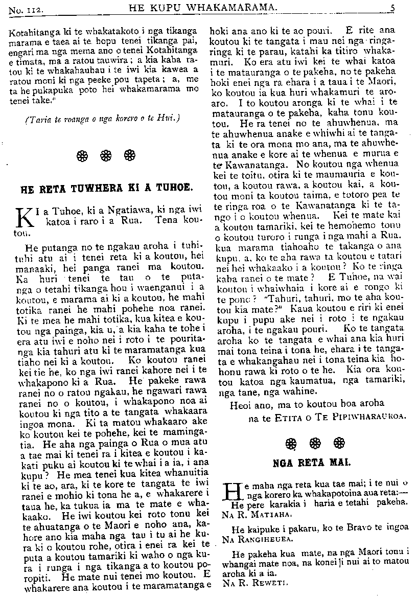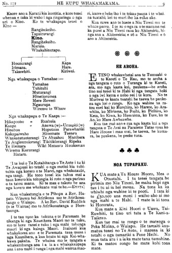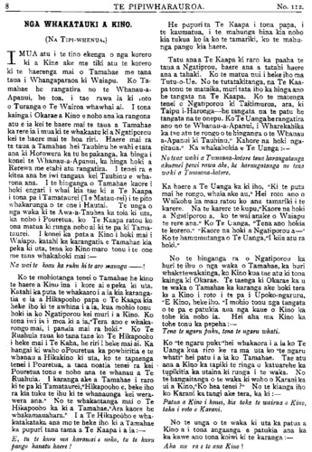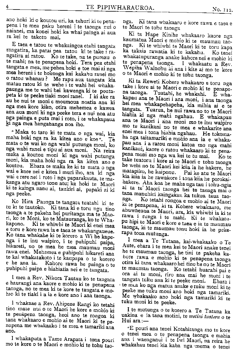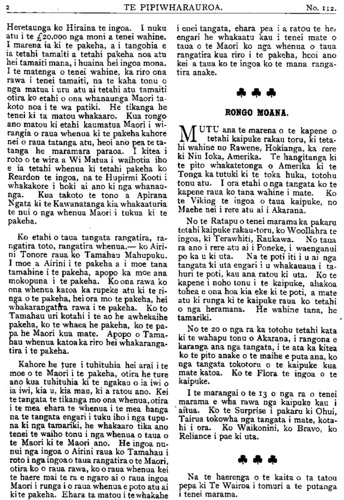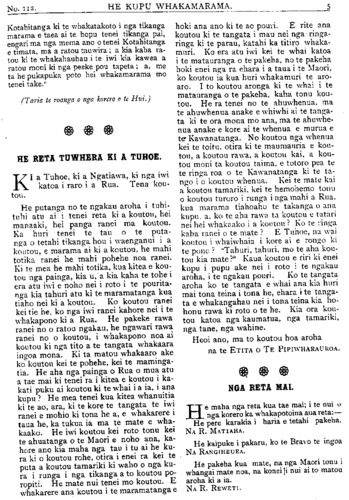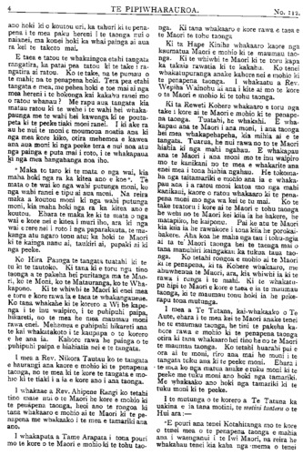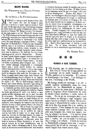TE PIPIWHARAUROA. MATE MAORI. HE WHAKAHOKI KI A TAKUTA TUTERE Wi REPA. Ki TE ETITA O TE PIPIWHARAUROA. MAHAU e uta atu enei kupu e whai ake nei i raro iho nei ki runga o nga parirau o te oha a o tatau tipuna mana e hari ki nga iwi ki nga reo ki nga huihuinga tangata ki reira tioro atu ai, he whakahoki naku i nga korero a Tutere Wi Repa i te hui i Te Awapu- ni mo nga mate o te iwi Maori. E korero ana i Te Pipiwharauroa he mea hanga noa iho e te mahunga tangata aua mate,te makutu te mate kehua. Me ata tirotiro te haerenga o te Ariki ratou ko ana akonga i waenga moana i runga kaipuke ki Kerekehini. Tokorua nga tangata e nohoia ana e te rewera a whaikupu mai ano ki a ia i peia nga kehua o aua tangata a ora ana. Ko Haora tetahi tangata i puta whaka- rere mai te wairua o Te Karaiti ki a ia i tona haerenga ai ki raro ki Ramahiku. Ehara i te mea i puta tinana engari wairua me penei e au ka haere a Haora i roto i te mana me te kaha hoki o te Wairua Tapu ehara i te mea i te kaha o te kehua patu tangata nei. I a ia me tetahi akonga taitamariki e whakaako haere ana i reira tetahi kotiro he wairua whiro tona ka korero haere i roto o nga mano tangata, penei te aronga o nga kupu. "He pono he tangata tika enei; he pononga na te Atua o runga rawa pena tonu ana korero ko te whaikuputanga tenei a Paora ki te kehua o taua kotiro penei te kupu. Puta mai hoki koe ki waho i ia. Ko te mahuetanga tenei o te kotiro nei i tona kehua, ka mutu nga ahua ke i a ia ka tangata ora tona ahua kaati e hika Tu- e i mahara au kua mutunga matepera, ara hua i ta te Karaiti peinga ina hoki ra i haere ke hoki nga kehua ki roto o te kahui o nga poaka te tino rerenga tera ra te pari ka rere ki te moana. No reira au i ki kaha ai inaianei he mate pono aua mate, te mate kehua me te mate makutu, me titiro hoki e koe a Haimona makutu, tera tangata he makutu ma hau e ata tirotiro te roa o enei korero ehara i te mea no taua nei rangi nei. Mo te kupu mo nga tohu nga maori me nga takutatanga hoki kao te tenei ahua e taea e au te korero ko wai te ora ko wai hoki te mate no te mea hoki he mate he ora kei te tohunga maori, he mate he ora kei takuta pena i a koe na, Mo to kupu i ahu ki te whakapono e tika ana tena ina hoki te korero a Hemi Apotoro, e ki ana, ka ora te turoro ki te inoi whakapono, ma te Ariki ano hoki e whakaara ake a ki te whai- hara ia ka murua ona he katoa me uiui koutou i o koutou he katoa tetahi ki tetahi a ka ora te turoro i te inoi kaha a te tika. E hika Tutere ko te marama tenei ki au o to kupu i ahu atu ra ki te whakapono. Ehara aku kupu i te peehi i te whakapono ki raro engari e tautoko atu ana i te whakapono ki runga a mehemea ka kainga pea e te turoro to rongoa a ka ora ka ki taua turoro na te rongoa a Tutere au i ora ai, mutu tonu te ngakau whakapono o te tangata ki te Atua engari nui ke kia koe ka heke te ahua o te whakapono ki raro i tena ahua. Tetahi tangata i rui i tana maara ki te purapura pai, tupu tahi ana te witi me era atu taru kino katoa te kupu a nga kai mahi me huhuti nga taru kino te kupu a te rangatira tukua kia tipu tahi a taea noatia te kotinga. ko reira nga taru paiheretia ai ka tahuna ki te ahi. Kati e kore pea e taea to hiahia e mea nei koe. Ta te Atua whakaaro hoki kia kotahi te wa e tataritia ai nga mea katoa. Kia ora. Na KAREPA TAUA. RONGO O NIU TIRENI. ITE muinga mo te pakarutanga o te Kia Ora ki Tirau ka ki nga pahihi he he haurangi no te mete tuatahi no de Wolfe i pakaru ai te kaipuke. E 7 maero te kotititanga o te tima. I te muinga ki- tea ana i haurangi a (de Wolfe. He hanga aroha te weranga i te ahi o tetahi wahine awhekaihe raua ko tana tamaiti iti, ko Haberfield te ingoa. I haere atu ratou ko tana tane i Moeraki ka noho ki Koputai (Port Chalmers) ki roto ki tetahi whare tawhito, i noho ratou ki runga. No te po ka werangia ake a raro o te whare, te ohonga o nga tangata kua ngaro katoa te whare i te mura. Ko te rere- nga tenei o Haberfield ki waho o te whare me te ki iho kia panga iho e te wahine ta raua tamaiti. Tona taenga ki raro, kahore tana wahine i panga iho i te tamaiti, ka piki ano tangata nei, otira kua ngaro ka- toa te whare i te mura. I te ata ka kitea a Haberfield raua ko tana taokete e takoto ana i waho, he nui te mate i te rerenga iho i runga o te whare. I kitea te wahine a Haberfield e tapapa tonu ana i runga i tana potiki he iti nei te weranga o te ta- maiti engari kua mate katoa raua.