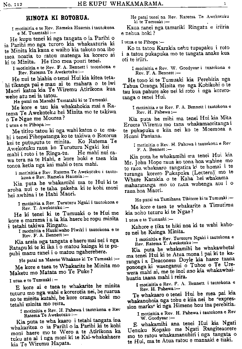 HE KUPU WHAKAMARAMA. HINOTA KI ROTORUA. I motinitia e te Rev. Rameka Haumia i tautokona e M. Tuamtahi— He kupu tenei ki nga tangata o ia Parihi o ia Parihi mo nga turoro kia whakaaturia ki te Minita kia kaua e waiho kia takoto noa iho taea noatia to ratou matenga ka korero ai ki te Minita. He tino mea pouri tenei. I motinitia e te Rev. F.A.Bennett i taotukona e Rev. Ratema Te Awekotuku:- He nui te hiahia otenei Hui kia kitea teta- hi tikanga pai e mau ai te mahara o te iwi Maori katoa kia Te Wiremu Atirikona kua wehe atu nei ia tatou. He patai na Manahi Tumatahi ki te Tumuaki. Me kore e tau kia whakahokia mai a Ra- tema Te Awhekotuku hei Minita mo te takiwa o Te Ngae me Mourea? I utua e te Pihopa:— Me titiro tatou ki nga wahi katoa o te ma- hi i tenei Pihopatanga ko te takiwa o Rotorua kei te putuputu te minita. Ko Ratema Te Awhekotuku raua ko Turuturu Ngaki kei mahi i roto i te Ringatu. He mahi nui ra- wa tera na te Hahi, e kore hoki e taea kia tonoa ketia nga kai mahi o tera mahi. 1 motinitia e Rev. Ratema Te Awhekotuku i tauto- kona e Rev. Rameka Haumia:— Kia puta he whakamihi ma te Hui ki te aroha nui o te taha pakeha ki te kohi moni hei awhina i te Hahi Maori. I motinitia a Rev. Turuturu Ngaki i tautokona e Rev. T. Awhekotuku He ki tenei ki te Tumuaki o te Hui me kore e marama i a ia kia haere he ropu minita i tetahi takiwa Ringatu. 1 motinitia e Haukiwaho Piwiki i tautokona e te Rev. F. A. Bennett: Kia araia nga tangata e haere mai nei i nga Ratapu ki te ki ika i o matou kainga ki te pu- puhi manu ranei i o matou ngaherehere. He patai na Matene Whakaue ki Te Tumuaki:— Me kore e taea te Whakarite he Minita mo Maketu mo Matata mo Te Puke? I utua e te Tumuaki: — E kore ai e taea te whakarite he minita tuturu mo nga wahi e korerotia nei, he ruarua no te minita katahi, he kore oranga hoki mo tetahi minita mo reira. I motinitia e Rev. H. Pahewa i tautokona e Rev Ratema Te Awhekotuku— Kia puta te wha kaaro i tetahi tangata ina whakaritea o ia Parihi o ia Parihi ki te kohi moni haere mo te Wero a te Atirikona ka tuku atu ai i nga moni ki te Kaiwhakahaere kia Te Wiremu Hapata. He patai tenei na Rev. Ratema Te Awekotuku ki te Tumuaki:— Kaua ranei nga tamariki Ringatu e iriiria e nehua hoki? I utua e te Pihopa: Ko ta tatou Karakia nehu tupapaku i roto i a tatou pukapuka mo te tangata anake kua oti te iriiri. I motinitia e Rev. W. Goodyear i tautokona e Rev. A. Bennett: He tono ki te Tumuaki kia Perehitia nga Tahua Oranga Minita me nga Kohikohi o te tau kua pahure ake nei ki roto i nga korero- tanga o tenei Hui. I motinitia e te Rev. A. Bennett i tautokona e Rev. H. Pahewa:— Kia puta he mihi ma tenei Hui kia Mita Eruera Wiremu mo tana whakamaoritanga i te pukapuka e kiia nei ko te Moemoea a Hoani Paniana. I motinitia a Rev. H. Pahewa i tautokona e Rev F. A. Bennett: Kia puta he whakamihi ma tenei Hui kia Mr. John Hope raua ko tona hoa wahine mo to raua whakaaro rangatira ki te homai i te turanga korero Pukapuka (Lectern). mo te Whare Karakia o te Kaha hei whakama maharatanga mo to raua wehenga atu i o raua hoa Maori. He patai na Tamihana Tikitere ki te Tumuaki: Me kore e taea te whakarite a Timutimu kia noho tuturu ki te Ngae? I utua e te Tumuaki:— Kahore e tika te hiki noa ki te wahi kaho- re nei he Kainga Minita. I motinitia e Rev. Turuturu Ngaki i tautokona e Rev. Ratema T. Awekotuku: Kia puta he whakamihi he whakawhetai ma tenei Hui ki te Atua mona i pai ki te ka- ranga i a Deaconess Doyle kia haere taana pononga ki waenganui o Tuhoe o Te Ure- wera mahi ai, me te inoi ano kia whakawhai- huatia taana mahi i reira. 1 motinitia e Rev. A. Bennett i tautokona e Rev. H. Pahewa: Te whakaaro o tenei Hui he mea pai kia whakanohoia nga tohu e kiia nei he "expres- sion marks" ki nga Himene hou ina perehitia. 1 motinitia e Rev. H. Pahewa i tautokona e Rev W. Goodyear (— E whakamihi ana tenei Hui kia Ngati Uenuku Kopako me Ngati Rangiteaorere mo to ratou whakamanuhiri i nga tangata o te Hui, ma te Atua ratou e manaaki e tiaki.