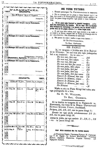 HE KUPU WHAKAMARAMA. Kaore ano a Karani kia kootitia, e kore tenei whenua e taka ki waho i nga ringaringa o nga uri o Kino. Ko te whakapapa tenei o Kino — Rangihekeiho. Tapairurangi Kino. Rangihekeiho. Maruia. Whakahinutapu. Houturangi Kapa Irimana. Hare. Takawhiti. Kiriwai. Nga whakapapa o Tamahae:— Tamahae Tuhituhi Muturangi Hinetioromea Mere Reweti Ngaurupa Wiremu te Whare Nga whakapapa o Te Kaapa:— Hikapooho = Rauhuia Kaapa = Anewa (w) =Uruapiti (w) Hinehou Hoputaua Parawhariki Kakapaiwaho Hinemate Teenga Whakatutuoterangi Te Ahuahou Manihera Te Anginunuiorangi Tikitikiorangi Ripeka Te Hemara Wiki Matauru Houkamau Wiremu Kururangi Hatara. iI te hui o Te Kotahitanga o Te Aute i tu ki Te Awapuni ko tetahi o nga motini kia tuhi- tuhia nga korero ate Maori, nga whakatauki, nga tangi. He tono tenei kia tukua mai a taua korero kia tohungia ki roto o nga parirau o ta tatou manu. Ki te mea e takoto he ana nga korero me whakaatu mai tehe.—ETITA] Kua whakatungia e te Pihopa a Rev. Ha- pata Wiremu hei Atirikona mo te Atirikona- tanga o Waiapu. A ko Rev. David Ruddick (o te Wairoa) mo te Atirikonatanga o Here- taunga. I te tau 1900 ka tukuna e te Paremata he tikanga ki nga Kaunihera Maori mo te tuku, mo te kore ranei e tuku i nga mahi tohunga maori ki nga kainga Maori. Inaianei kua whakakorea ano e te Paremata taua mana i nga Kaunihera, a kua hoatu ki nga Kaiwha- kawa pakeha. Te whaina mo te tangata e whakatohunga ana ia ia a e whakakaupapa ana i ana mahi i runga i nga mahi wairua mao- ri, kaore e heke iho i te tekau pauna i te whai- na tuatahi; kei to muri iho ka nuku ake. Kua rawe ano te haere a Niu Tireni mo te whutu paoro. I te 20 o nga ra o te marama nei ka purei a Niu Tireni raua ko Ahitereiria, hi- nga ana a Ahitereiria; e 26 a Niu Tireni e 6 ano a Ahitereiria. HE AROHA. E TINO whakawhetai ana te Tumuaki o te Kareti o Te Rau, mo te aroha a nga tangata o roto o Turanga ki te Kareti, ara, mo nga kaata kai, paukena—he aroha tino nui tenei ki te Hahi ki nga tangata hoki o nga iwi katoa e noho nei i te kura. No te Muriwai te kaata tuatahi he taewa he pauke- na nga kai o runga. Ko nga wahine na ra- tou enei kai ko Ruruhira, ko Harete, ko Ara- whita, ko Miriama, ko Ruihi, ko Pirihira, ko Keta, ko Kiwa, ko Hemaima, ko Ture, ko te Ao, ko Mere Awheawhe. Kua tae mai ano e rua nga kaata kai a nga tangata o Te Arai na Paratene Tatae raua ko Hare Hoone i mau mai, he taewa, he kuma- ra, he paukena, he peeke tuna. NGA TUPAPAKU. KUA mate a Ta Hoani Hooro, Mea o Otautahi. I tu tenei tangata he pirimia mo Niu Tireni, he maha hopi nga tau i tu ai ia hei mema. Na tona ka ka whiwhi nga wahine ki te pooti. I tata ki te £50, 000 ana moni i waiho aho ai mo nga mahi a te Hahi. I mate ia ki tona ki Hororata, Kua mate a Kini Hoori o Uawa, Tai- rawhiti, te tino uri tata a Te Kani-a- Takirau. Kua tae mai te rongo o te matenga o Peka Mirina, o Waiapu. He tamaiti kau- matua tenei no Te Aute, i marena ia ki tetahi o nga tamariki a Pene Heihi. No mua tata atu i a ia ka mate tana tamahine. Ki ta matou rongo he mate kohi tona mate.