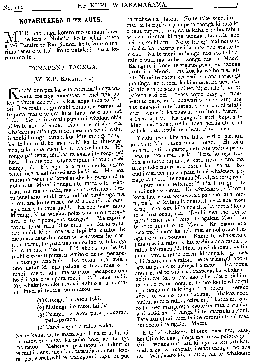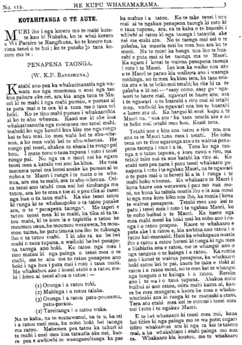 HE KUPU WHAKAMARAMA. KOTAHITANGA O TE AUTE. MURI iho i nga korero mo te mahi kute- te kau ki Nuhaka, ko te whaikorero a Wi Paraire te Rangihuna, ko te korero tua- rima tenei o te hui; ko te putake [o tana ko- rero mo te: PENAPENA TAONGA. (W. K.P. RANGIHUNA.) Katahi ano pea ka whakatinanatia nga wa- wata me nga moemoea o enei nga tau kua pahure ake nei, ara kia anga taua te Ma- ori ki te mahi i nga mahi pumau, e pumau ai te puta mai o te ora ki a taua me o taua uri hoki. Ko te tino mahi pumau i whakaarohia ai ko te ahu whenua. Kaati me ki ake kua whakatinanatia nga moemoea mo tenei mahi, inahoki ko nga kanohi kua kite me nga rongo kei te hau mai, ko mea wahi kei te ahu-whe- nua, a ko mea wahi kei te ahu-whenua. He rongo pai tenei, ahakoa ra ehara i te rongo pai hou. I mate tonu o taua tupuna i roto i tenei rongo pai. No nga ra o muri nei ka ngaro tenei mea a katahi nei ano ka kitea. He mea marama tenei ma konei anake ka pumau ai te noho a te Maori i runga i te mata o te whe- nua, ara ma te mahi, ma te ahu-whenua. Oti- ra tenei ano tetahi mea nui hei tirohanga ma tatou, ara ko te mea e toe ai e pau tika ai ranei nga hua o ta taua mahi. Ka eke tenei tatou ki runga ki te whakaupoko o ta tatou putake ara, o te " penapena taonga". Me tapiri e tatou tenei mea ki te mahi, ka tika ai ta ta- tou mahi, ki te kore ia e tapiritia e tatou he moumou uaua, he moumou werawera, he mou- mou taima, he patu tinana noa iho te tukunga iho o ta tatou mahi. I ki ake ra au he iwi mahi o taua tupuna, a waihoki he iwi penape- na taonga ano hoki. Ko ratou nga mea i tino matau ki nga painga o tenei mea o te mahi, me te aha me to ratou penapena ano hoki i nga hua i puta mai i roto i taua mahi. Me whakahua ake i konei etahi o a ratou ma- hi i kitea ai tenei ahua o ratou: — (1) Oronga i a ratou toki. (2) Mahinga i a ratou taiaha. (3) Oronga i a ratou patu-pounamu, patu-paraoa. (2) Tareitanga i o ratou waka. Na te kaha, na te manawanui, na te u, ka oti i a ratou enei mea, ka noho hoki hei taonga ma ratou. Mehemea pea tatou ka tahuri ki te mahi i enei mea kua tatautia ake nei, kao- re pea e awhiwhi te waenganuitanga ka pae ka mahue i a tatou. Ko te take tenei i uru mai ai te ngakau penapena taonga ki roto ki o taua tupuna, ara, na te kaha o te huarahi i whiwhi ai ratou ki nga taonga i tatautia ake nei me etahi atu. No te taenga mai nei o te pakeha, ka mauria mai he mea hou ara ko te moni. Na te moni ka hanga noa iho te hua- rahi e puta mai ai he taonga ma te Maori. Ka ngaro i konei te wairua penapena taonga i roto i te Maori. Ina koa ka waiho noa atu e te Maori te parau kia waikura ana i waenga mahinga, no te mea ka kino tera, ka taea noa- tia atu e ia te hoko mai tetahi; ka rite ki ta te pakeha e ki nei — " easy come, easy go",nga- wari te haere mai, ngawari te haere atu; ara i te ngawari o te huarahi e riro mai ai tetahi mea, waihoki ka ngawari noa iho te huarahi e haere atu ai. Ka hangai ki enei kupu a te Maori na, " aua atu" ka taea noatia atu e au te hoko mai tetahi mea hou. Kaati tena. Tetahi ano e kite ana tatou e riro noa, atu ana ta te Maori tana mea i tetahi. He tohu tena no te tino ngaronga atu o te wairua pena- pena taonga i roto i a ia. Tena ko nga tao- nga a o tatou tupuna, e kore rawa e riro, ma tetahi take nui ra ano katahi ka riro ai. Ko etahi mea pea nana i patu tenei whakaaro pe- napena i roto i te ngakau Maori, na te ngawari o te puta mai o te hereni ki a ia i runga i te mahi hoko whenua. Ka whakaaro te Maori i kona kaore ona werawera i pau mo aua mo- ni, na kona ka taitaia noatia iho e ia aua moni ki nga mea kore kiko noa iho, ka romia i kona te wairua penapena. Tetahi mea ano kei te patu i tenei mea i roto i te ngakau Maori, ko te noho huihui o te Maori. Ka haere nga mea mahi moni ka hoki mai ka noho ano i ru- nga i o ratou poupou. Kaore te whakaaro e puta ake i a ratou e, kia awhina ano ratou i o ratou kai •manaaki. Heoi ka whakapaua noatia iho e ratou a ratou hereni ki runga ki nga mea e hiahiatia ana e ratou, me te whangai ano o nga tangata o te kainga i a ratou. Ka romia ano i konei te wairua penapena, ka whakaaro hoki ratou kei te pai, kaore he take e tiaki ai ratou i a ratou moni, no te mea kei te whangai nga tangata o te kainga i a ratou. Rereke ano i te wa i o taua tupuna. Ahakoa noho huihui ai ano ratou, otira mahi katoa ai, kao- re he mea mangere; a kaore he mea e whaka- whirinaki ana ki runga ki te manaaki a etahi. Tera atu etahi mea kei te roromi i tenei mea nui i roto i te ngakau Maori. E te iwi whakaaro ki tenei mea nui, kaua hei titiro ki nga painga mo te wa poto; engari titiro whakamua atu ki nga ra kei te takoto mai, a ka whakahiato i etahi painga mo aua ra. Whakaaro kia koutou, me te whakaaro