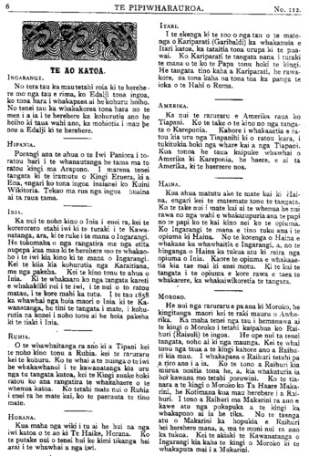 TE PIPIWHARAUROA. TE AO KATOA. INGARANGI. No tera tau ka mau tetahi roia ki te herehe- re mo nga tau e rima, ko Edalji tona ingoa, ko tona hara i whakapaea ai he kohuru hoiho. No tenei tau ka whakakorea tona hara no te mea i a ia i te herehere ka kohurutia ano he hoiho ki taua wahi ano, ka mohiotia i mau he noa a Edalji ki te herehere. HIPANIA. Porangi ana te ahua o te Iwi Paniora i to- ratou hari i te whanautanga he tama ma to ratou kingi ma Arapono. I marena tenei tangata ki te iramutu o Kingi Eruera, ki a Ena, engari ko tona ingoa inaianei ko Kuini Wikitoria. Tekau ma rua nga ingoa huaina ai ta raua tama. INIA. Ka nui te noho kino o Inia i enei ra, kei te korerorero etahi iwi ki te turaki i te Kawa- natanga, ara, ki te ruke i te mana o Ingarangi. He tokomaha o nga rangatira me nga etita nupepa kua mau ki te herehere mo te whakao- ho i te iwi kia kino ki te mana o Ingarangi. Kei te kiia kia kohurutia nga Karaitiana, me nga pakeha. Kei te kino tonu te ahua o Inia. Ki te whakaaro ko nga tangata kareti e whakakiiki nei i te iwi, i te nui o to ratou matau, i te kore mahi ka tutu. I te tau 1858 ka whawhai nga hoia maori o Inia ki te Ka- wanatanga, he tini te tangata i mate, i kohu- rutia na konei i noho tonu ai he hoia pakeha ki te tiaki i Inia. RUHIA. O te whawhaitanga ra ano ki a Tipani kei te noho kino tonu a Ruhia kei te raruraru kei te kohuru. Ko te whai a te nuinga o te iwi he whakawhanui i te kawanatanga kia uru nga tu tangata katoa, kei te Kingi anake hoki ratou ko ana rangatira te whakahaere o te whenua katoa. Ko tetahi mate nui o Ruhia i enei ra he mate kai, ko te paerauta te tino mate. HORANA. Kua maha nga wiki i tu ai he hui na nga iwi katoa o te ao ki Te Haike, Horana. Ko te putake nui o tenei hui ke kimi tikanga hei arai i te whawhai a nga iwi. ITARI.. I te ekenga ki te 100 o nga tau o te mate- nga o Kariparati (Garibadi) ka whakanuia e Itari katoa, ka tataitia tona urupa ki te pua- wai. Ko Kariparati te tangata nana i turaki te mana o te ko te Papa tonu hoki te kingi. He tangata tino kaha a Kariparati, he rawa- kore, na tona kaha na tona toa ka panga te ioka o te Hahi o Roma. AMERIKA. Ka nui te raruraru e Amerika raua ko Tiapani. Ko te take o te kino no nga tanga- ta o Kareponia. Kahore i whakaaetia e ra- tou kia uru nga Tiapanihi ki o ratou kura, i tukitukia hoki nga whare kai a nga Tiapani. Kua tonoa he taua kaipuke whawhai o Amerika ki Kareponia, he haere, e ai ta Amerika, ki te haereere noa. HAINA. Kua ahua matutu ake te mate kai ki Hai- na, engari kei te matemate tonu te tangata. Ko te take nui i mate kai ai te whenua he nui rawa no nga wahi e whakatupuria ana te papi no te papi ko te kai kino nei ko te opiuma. Ko Ingarangi te mana e tino tuku ana i te opiuma ki Haina. No te korenga o Haina e whakaae ka whawhaitia e Ingarangi, a, no te hinganga o Haina ka tukua atu ki reira nga opiuma o Inia. Kaore te opiuma e whakaae- tia kia tae mai ki enei motu. Ki te kai te tangata i te opiuma e kore rawa e taea te whakarere, ka whakaiwikore tia te tangata. • MOROKO. He nui nga raruraru e pa ana ki Moroko, he kingitanga maori kei te raki mauru o Awhe- rika. Ka maha tenei nga tau i hemanawa ai te kingi o Moroko i tetahi kaipahua ko Rai- huri (Raisuli) te ingoa. He ope nui ta tenei tangata, noho ai ki nga maunga. Kei te whai tonu nga taua a te kingi kahore ano a Raihu- ri kia mau. I whakapaea e Raihuri tetahi pa a riro ana i a ia. Ko te tono a Raihuri kia murua noatia tona he, a, kia whakaturia ia hei kawana mo tetahi porowini. Ko te tia- nara a te kingi o Moroko ko Ta Haare Maka- rini, he Kotimana kua mau herehere i a Rai- huri. I tono a Raihuri ma Makarini ra ano e kawe atu nga pukapuka a te kingi ka whakapono ai ia he tika. No te taenga atu o Makarini ka hopukia e Raihuri hei herehere mana, a, ma te moni nui ra ano ka tukua. Kei te akiaki te Kawanatanga o Ingarangi kia kaha te kingi o Moroko ki te whakaputa mai i a Makarini.