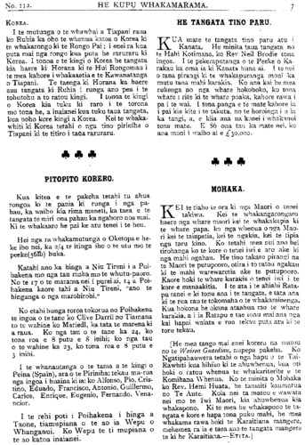 HE KUPU WHAKAMARAMA. KOREA. I te mutunga o te whawhai a Tiapani raua ko Ruhia ka oho te whenua katoa o Korea ki te whakarongo ki te Rongo Pai; i enei ra kua puta mai nga rongo kua puta he raruraru ki Korea. I tonoa e te kingi o Korea he tangata kia haere ki Horana ki te Hui Rongomau i te mea kahore i whakaaetia e te Kawanatanga o Tiapani. Te taenga ki Horana ka haere aua tangata ki Ruhia i runga ano pea i te tohutohu a to ratou kingi. I tonoa te kingi o Korea kia tuku ki raro i te torona mo tona he, a inaianei kua tuku taua tangata, kua noho kore kingi a Korea. Kei te whaka- whiti ki Korea tetahi o nga tino piriniha o Tiapani ki te titiro i taua raruraru. PITOPITO KORERO. Kua kitea e te pakeha tetahi tu ahua rongoa ki te pama ki runga i nga pa- hau, ka waiho kia rima meneti, ka taea e te tangata te miri ona pahau ka ngahoro noa mai. Ki te whakaaro he pai ke atu tenei i te heu. Hei nga ra whakamutunga o Oketopa e he- ke iho nei, ka 2/4 te itinga iho o te utu mo te peeke (56Ib) huka. Katahi ano ka hinga a Niu Tireni i a Poi- hakena mo nga tau maha mo te whutupaoro. No te 17 o te marama nei i purei ai, 14 a Poi- hakena kaore tahi a Niu Tireni, "ano te hinganga o nga marohirohi." Ko etahi hunga roroa tokorua no Poihakena te ingoa o te tane ko Clive Darril no Tiamana to te wahine ko Mariedl, ka tata te marena ki a raua. Ko nga tau o te tane ka 24, ko • tona roa e 8 putu e 8 inihi; ko nga tau o te wahine ka 23, ko tona roa e 8 putu e 3 inihi. I te whanautanga o te tama a te kingi o Peina (Spain), ara o te Piriniha; tekau ma-rua nga ingoa i huaina ki ia: ko Alfonso, Pio, Cris- tino, Eduado, Francisco, Antonio, Guillermo, Carlos, Enrique, Eugenio, Fernando, Vena- noior. I te rehi poti i Poihakena i hinga a Taone, tiamupiana o te ao ia Wepu o Whanganui. Ko Wepu te ti huriana o te ao katoa inaianei. HE TANGATA TINO PARU. KUA mate te tangata tino paru atu i Kanata. He minita taua tangata no te Hahi Kotimana, ko Rev Neil Brodie tona ingoa. I te pekeraputanga o te Peeke o Ka- rakau ka oma ia ki Kanata huna ai. I te nui o tana pirangi ki te whakapuranga moni ka mutu tana mahi karakia. Ko ana kai he mea rukenga no nga whare hokohoko, ko tona whare i rite ki te whare poaka, kahore rawa i pa i te wai. I tona panga e te mate kahore ia i pai kia kite i te takuta no te horoinga i a ia ka tangi, a, e kiia ana na konei i whakanui tona mate. E 86 ona tau ka mate nei, ko ana moni i waiho ai e £30, 000. MOHAKA. KEI te tiaho te ora ki nga Maori o tenei takiwa. Kei te whakangarongaro haere nga whare maori kei te whakakapia ki te whare papa. ko nga whenua onga Mao- ri kei te taiapatia, kei te ngakia, kei te tipia nga taru kino. Ko tetahi mea nui ano hei tirohanga ko te kore o tenei iwi e aro ake ki nga mahi ngahau. He tino takaro pirangi na te Maori te putupooro, otira i to ratou ngakau ki te mahi warewaretia ake te putupooro. Kaore hoki te whare karakia o tenei iwi i te kore e manaakitia. I te ata i te ahiahi Rata- pu ranei e ki tonu ana i te tangata, e tata ana ki te rua rau te tokomaha o te whakaminenga. Kua hokona he okana ataahua mo te whare karakia, a i ia Ratapu e tae tonu mai ana nga kai hapai waiata e rua tekau puta atu ki te toru tekau. [He mea tango mai enei korero na matou no te Wairoa Guardian, nupepa pakeha. Ko Ngatipahauwera tetahi o nga hapu o te Tai- rawhiti kua hihiko ki te ahuwhenua, kua oti hoki o ratou whenua te whakariterite e te Komihana Whenua. Ko te minita o Mohaka ko Rev. Hemi Huata, he tamaiti kaumatua no Te Aute. Koia nei ta matou e wawata nei mo te Iwi Maori, kia ahuwhenua kia whakapono. Ki te mea he whakapono te ta- ngata e kore e hapa tona puku mahi, he mea whakama rawa hoki te Karaitiana mangere, mehemea ra ia e taea ano te tangata mangere te ki he Karaitiana.—ETITA.]