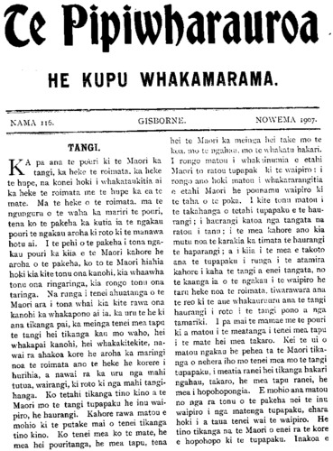 Te Pipiwharauroa HE KUPU WHAKAMARAMA. NAMA 116. GISBORNE. NOWEMA 1907. TANGI. KA pa ana te pouri ki te Maori ka tangi, ka heke te roimata, ka heke te hupe, na konei hoki i whakataukitia ai ka heke te roimata me te hupe ka ea te mate. Ma te heke o te roimata, ma te ngunguru o te waha ka mariri te pouri, tena ko te pakeha ka kutia ia te ngakau pouri te ngakau aroha ki roto ki te manawa hotu ai. I te pehi o te pakeha i tona nga- kau pouri ka kiia e te Maori kahore he aroha o te pakeha, ko to te Maori hiahia hoki kia kite tonu ona kanohi, kia whaawha tonu ona ringaringa, kia rongo tonu ona taringa. Na runga i tenei ahuatanga o te Maori ara i tona whai kia kite rawa ona kanohi ka whakapono ai ia. ka uru te he ki ana tikanga pai, ka meinga tenei mea tapu te tangi hei tikanga kau mo waho, hei whakapai kanohi, hei whakakitekite, na- wai ra ahakoa kore he aroha ka maringi noa te roimata ano te heke he korere i hurihia, a nawai ra ka uru nga mahi tutua, wairangi, ki roto ki nga mahi tangi- hanga. Ko tetahi tikanga tino kino a te Maori mo te tangi tupapaku he inu wai- piro, he haurangi. Kahore rawa matou e mohio ki te putake mai o tenei tikanga tino kino. Ko tenei mea ko te mate, he mea hei pouritanga, he mea tapu, tena hei te Maori ka meinga hei take mo te koa. mu te ngahau, mo te whakatu hakari. I rongo matou i whakainumia e etahi Maori to ratou tupapaku ki te waipiro; i rongo ano hoki matou i whakararangitia e etahi Maori he pounamu waipiro ki te taha o te poka. 1 kite tonu matou i te takahanga o tetahi tupapaku e te hau- rangi; i haurangi katoa nga tangata na ratou i tanu; i te mea kahore ano kia mutu noa te karakia ka timata te haurangi te haparangi; a i kiia i te mea e takoto ana te tupapaku i runga i te atamira kahore i kaha te tangi a enei tangata, no te kaanga ia o te ngakau i te waipiro he taru heke noa te roimata, tiwarawara ana te reo ki te aue whakauruuru ana te tangi haurangi i roto i te tangi pono a nga tamariki. I pa mai te mamae me te pouri ki a matou i te meatanga i tenei mea tapu i te mate hei mea takaro. Kei te ui o matou ngakau he pehea ta te Maori tika- nga o nehera iho mo tenei mea mo te tangi tupapaku, i meatia ranei hei tikanga hakari ngahau, takaro, he mea tapu ranei, he mea i hopohopongia. E mohio ana matou no nga ra tonu o te pakeha nei te inu waipiro i nga matenga tupapaku, ehara hoki i a taua tenei wai te waipiro. He tino tikanga na te Maori o enei ra te kore e hopohopo ki te tupapaku. Inakoa e