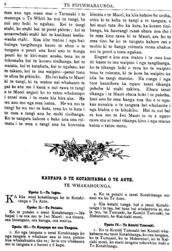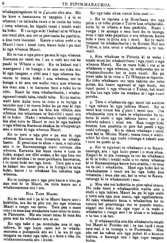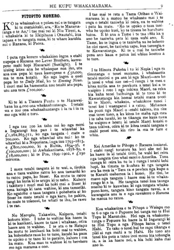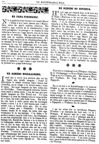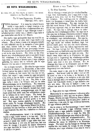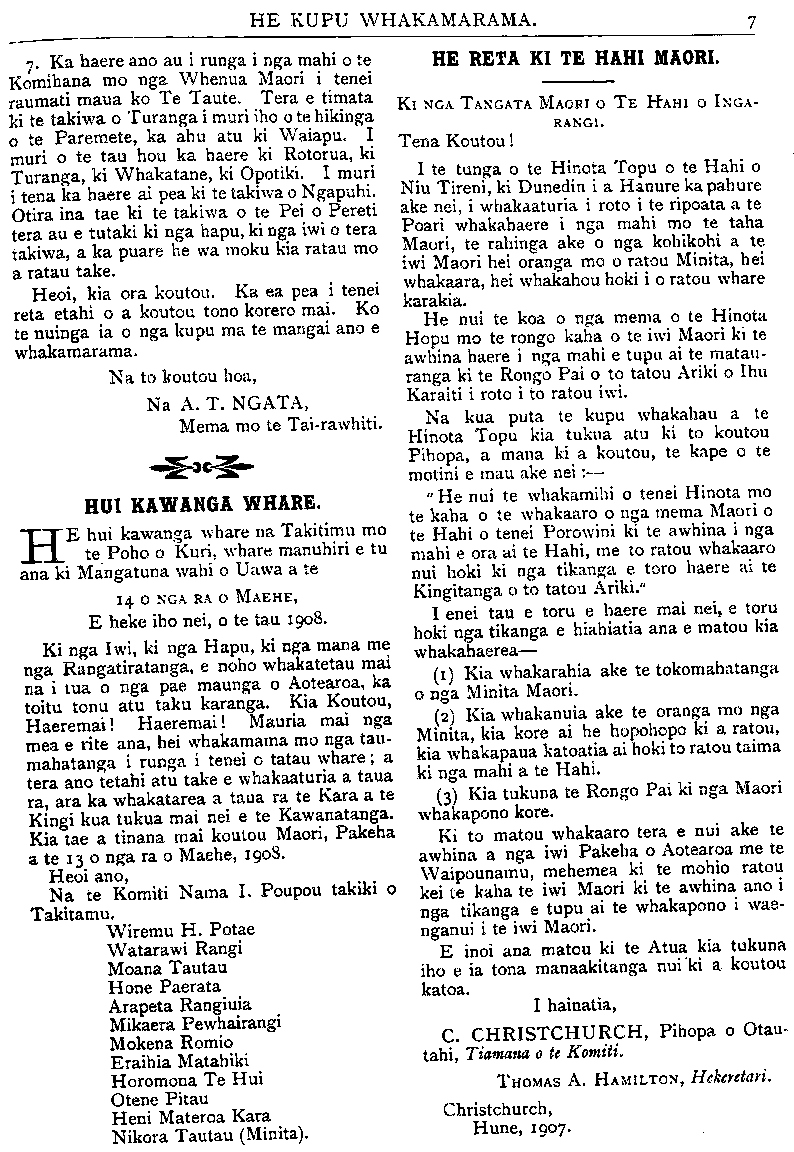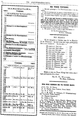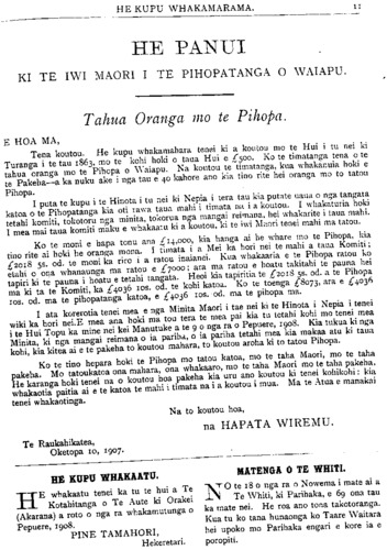 HE KUPU WHAKAMARAMA. HE PANUI KI TE IWI MAORI I TE PIHOPATANGA O WAIAPU. Tahua Oranga mo te Pihopa. E HOA MA, Tena koutou. He kupu whakamahara tenei ki a koutou mo te Hui i tu nei ki Turanga i te tau 1863, mo te kohi hoki o taua Hui e £500. Ko te timatanga tena o te tahua oranga mo te Pihopa o Waiapu. Na koutou te timatanga, kua whakanuia hoki e te Pakeha—a ka nuku ake i nga tau e 40 kahore ano kia tino rite hei oranga mo to tatou Pihopa. I puta te kupu i te Hinota i tu nei ki Nepia i tera tau kia putate uaua o nga tangata katoa o te Pihopatanga kia oti rawa taua mahi i timata na i a koutou. I whakaturia hoki tetahi komiti, tokotoru nga minita, tokorua nga mangai reimana, hei whakarite i taua mahi. I mea mai taua komiti maku e whakaatu ki a koutou, ki te iwi Maori tenei mahi ma tatou. Ko te moni e hapa tonu ana £14, 000, kia hanga ai he whare mo te Pihopa, kia tino rite ai hoki he oranga mona. I timata i a Mei ka hori nei te mahi a taua Komiti; £2018 5s£2018 5s od. te moni ka riro i a ratou inaianei. Kua whakaaria e te Pihopa ratou ko etahi o ona whanaunga ma ratou e £7000; ara ma ratou e hoatu takitahi te pauna hei tapiri ki te pauna i hoatu e tetahi tangata. Heoi kia tapiritia te £2018 5s. od. a te Pihopa ma ki ta te Komiti, ka £4036 10s. od. te kohi katoa. Ko te toenga £8073, ara e £4036 10s. od. ma te Pihopatanga katoa, e £4036 10s. od. ma te pihopa ma. I ata korerotia tenei mea e nga Minita Maori i tae nei ki te Hinota i Nepia i tenei wiki ka hori nei.E mea ana hoki ma tou tera te mea pai kia tu tetahi kohi mo tenei mea i te Hui Topu ka mine nei kei Manutuke a te 9 o nga ra o Pepuere, 1908. Kia tukua ki nga Minita, ki nga mangai reimana o ia pariha, o ia pariha tetahi mea kia makaa atu ki taua kohi, kia kitea ai e te pakeha to koutou mahara, to koutou aroha ki to tatou Pihopa. Ko te tino hepara hoki te Pihopa mo tatou katoa, mo te taha Maori, mo te taha pakeha. Mo tatoukatoa ona mahara, ona whakaaro, mo te taha Maori mo te taha pakeha. He karanga hoki tenei na o koutou hoa pakeha kia uru ano koutou ki tenei kohikohi: kia whakaotia pahia ai e te katoa te mahi i timata na i a koutou i mua. Ma te Atua e manakai tenei whakaotinga. Na to koutou hoa, na HAPATA WIREMU. Te Raukahikatea, Oketopa 10, 1907. HE KUPU WHAKAATU. HE whakaatu tenei ka tu te hui a Te Kotahitanga o Te Aute ki Orakei (Akarana) a roto o nga ra whakamutunga o Pepuere, 1908. PINE TAMAHORI, Hekeretari. MATENGA O TE WHITI. NO te 18 o nga ra o Nowema i mate ai a Te Whiti, ki Parihaka, e 69 ona tau ka mate nei. He roa ano tona takotoranga. Kua tu ko tana hunaonga ko Taare Waitara hei upoko mo Parihaka engari e kore ia e poropiti.