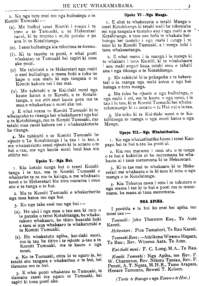 HE KUPU WHAKAMARAMA. 2. Ko nga ture enei mo nga huihuinga o te Komiti Tumuaki:— (a). Me huihui tenei Komiti i runga i te tono a te Tumuaki, a te Hekeretari ranei ki te tirotiro i etahi putake e pa ana ki te Kotahitanga. (e). I enei huihuinga kia tokorima te koramu. (i). Ki te taurite te pooti, e whai pooti whakatau te Tumuaki hei tapiri ki tona ake pooti. (o). Me tuhituhi e te Hekeretari nga mahi o enei huihuinga, a mana hoki e tuku he kape o aua mahi ki nga tangata o te Komiti kahore nei i tae mai. (u). Me tuhituhi e te Kai-tiaki moni nga kaute katoa a te Komiti, a te Kotahi- tanga, a me otiti enei kaute pera me te mea e whakaritea a muri ake nei. 3. E whai mana te Komiti Tumuaki ki te whakatakoto ritenga hei whakahaere i nga hui o te Kotahitanga, mo te Komiti Tumuaki, mo tetahi mea ranei kahore nei i whakatakotoria he ritenga. 4. Me tuhituhi e te Komiti Tumuaki he ripoata o Te Kotahitanga i ia tau i ia tau, a me whakatakoto tenei ripoata ki te aroaro o te hui a-tau, me nga kaute moni hoki kua ata oti fit ia nei. Upoko V.—Nga Hui. 1. Kia kotahi tunga hui o tenei Kotahi- tanga i te tau, ma te Komiti Tumuaki e whakarite te ra me te kainga, a me whakaatu tenei e te Hekeretari kia toru marama i mua atu e te tunga o te hui. 2. Ma te Komiti Tumuaki e whakariterite nga mea katoa mo nga hui. 3. Ko nga take enei mo nga hui:— (a). He uiui i nga mea e tau ana ki raro o te putake o tenei Kotahitanga, he whaka- takoto whakaaro, he titiro huarahi hoki e taea ai aua whakaaro te whakatutuki e te Komiti Tumuaki. (e). He whakatutu apiha, kai-tiaki moni, mo ia tau he titiro i te ripoata a-tau a te Komiti Tumuaki, me te kaute o nga moni. 4. Ko te Tumuaki, otira ki te ngaro ia, ko tetahi atu tangata e whakaritea e te hui, hei tiamana mo te hui. 5. E whai pooti whakatau te Tumuaki, te tiamana ranei ina ngaro te Tumuaki, hei tapiri ki tona pooti ake. Upoko VI.—Nga Manga. 1. E ahei te whakaturia o tetahi Manga o tenei Kotahitanga ki tetahi wahi he tokomaha nei nga tangata e tautoko ana i nga mahi a te Kotahitanga, e taea ana hoki te whakatu hui- huinga hei tautoko i nga mahi i runga i te tono ki te Komiti Tumuaki, a i runga hoki i tana whakaaetanga. 2. E whai mana i ia manga i ia manga ki te whakatu i tona Komiti, ki te whakahaere i ana mahi engari kaua tetahi mea e takahi ana i nga tikanga o te Kotahitanga. 3. Me tuhituhi ki te pukapuka e te hekere- tari o ia manga nga mahi katoa o nga hui- huinga o tona manga. 4 Me tuku he ripoata o nga huihuinga, o nga mahi i oti, me te kaute o nga moni, i ia tau i ia tau, ki te Komiti Tumuaki hei whaka- takotoranga ki te aroaro o te Hui nui o ia tau. 5. Me tuku ki te Kai-tiaki moni o te Ko- tahitanga te toenga o nga moni katoa o nga Manga. Upopo VII.—Nga. Whakatikatika. 1. Ko nga whakatikatika katoa i tenei Kau- papa hei te hui a-tau ka pooti ai. 2. Kia rua marama i mua atu o te tunga o te hui e kokiritia ai he menemana ka wha- kaatu ai i taua menemana ki te Hekeretari. 3. Ki te tae mai te whakaatu ki te Heke- retari me whakaatu e ia ki tena ki tena o nga manga o te Kotahitanga. 4. Kia Tokorua rawa i roto i te tokotoru o nga mema i tae ki te hui e pooti mo te mene- mana, ka mana ai taua menemana. NGA APIHA. I pootitia e te hui ko enei hei apiha mo tenei tau:— Tumuaki: John Thornton Esq., Te Aute Kareti. Hekeretari: Pine Tamahori, Te Rau Kareti. Tumuaki Raro:—Atirikona Wiremu Hapata, Te Rau; Rev. Wiremu Aata. Te Aute. Kai-tiaki moni: F. C. Long, M.A., Te Rau. Komiti Tumuaki: Nga Apiha, me Rev. F. W. Chatterton, Rev. Nikora Tautau, Rev. P. Peneti, A. T. Ngata, M.H.R., Tame Arapata, Henare Tomoana, Reweti T. Kohere. (Taria te Roanga o nga Korero o te Hui.)
