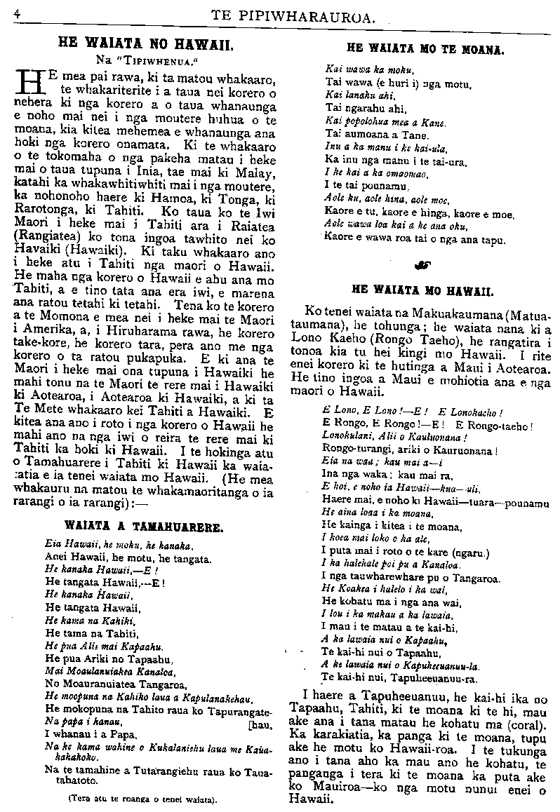 TE PIPIWHARAUROA. HE WAIATA NO HAWAII. Na "TIPIWHENUA." HE mea pai rawa, ki ta matou whakaaro, te whakariterite i a taua nei korero o nehera ki nga korero a o taua whanaunga e noho mai nei i nga moutere huhua o te moana, kia kitea mehemea e whanaunga ana hoki nga korero onamata. Ki te whakaaro o te tokomaha o nga pakeha matau i heke mai o taua tupuna i Inia, tae mai ki Malay, katahi ka whakawhitiwhiti mai i nga moutere, ka nohonoho haere ki Hamoa, ki Tonga, ki Rarotonga, ki Tahiti. Ko taua ko te Iwi Maori i heke mai i Tahiti ara i Raiatea (Rangiatea) ko tona ingoa tawhito nei ko Havaiki (Hawaiki). Ki taku whakaaro ano i heke atu i Tahiti nga maori o Hawaii. He maha nga korero o Hawaii e ahu ana mo Tahiti, a e tino tata ana era iwi, e marena ana ratou tetahi ki tetahi. Tena ko te korero a te Momona e mea nei i heke mai te Maori i Amerika, a, i Hiruharama rawa, he korero take-kore, he korero tara, pera ano me nga korero o ta ratou pukapuka. E ki ana te Maori i heke mai ona tupuna i Hawaiki he mahi tonu na te Maori te rere mai i Hawaiki ki Aotearoa, i Aotearoa ki Hawaiki, a ki ta Te Mete whakaaro kei Tahiti a Hawaiki. E kitea ana ano i roto i nga korero o Hawaii he mahi ano na nga iwi o reira te rere mai ki Tahiti ka hoki ki Hawaii. I te hokinga atu o Tamahuarere i Tahiti ki Hawaii ka waia- tatia e ia tenei waiata mo Hawaii. (He mea whakauru na matou te whakamaoritanga o ia rarangi o ia rarangi):— WAIATA A TAMAHUARERE. Eia Hawaii, he moku, he kanaka. Anei Hawaii, he motu, he tangata. He kanaka Hawaii.—Ei He tangata Hawaii,—E! He kanaka Hawaii, He tangata Hawaii, He kama na Kahiki, He tama na Tahiti, He pua Alii mai Kapaahu. He pua Ariki no Tapaahu, Mai Moaulanuiakea Kanaloa, No Moauranuiatea Tangaroa, He moopuna na Kahiko Iaua a Kapulanakehau. He mokopuna na Tahito raua ko Tapurangate- Na papa i hanau, [hau, I whanau i a Papa, No ke kama wahine o Kukalaniehu Iaua me Kaua- kahakoko. Na te tamahine a Tutarangiehu raua ko Taua- tahatoto. (Tera atu te roanga o tenei waiata). HE WAIATA MO TE MOANA. Kai wawa ka moku, Tai wawa (e huri i) nga motu, Kai lanahu ahi, Tai ngarahu ahi, Kai popolohua mea a Kane. Tai aumoana a Tane. Inu a ka manu i ke kai-ula, Ka inu nga manu i te tai-ura, I ke kai a ka omaomao, I te tai pounamu, Aole ku, aole hina, aole moe, Kaore e tu, kaore e hinga, kaore e moe, Aole wawa loa kai a ke ana oku, Kaore e wawa roa tai o nga ana tapu. HE WAIATA MO HAWAII. Ko tenei waiata na Makuakaumana (Matua- taumana), he tohunga; he waiata nana ki a Lono Kaeho (Rongo Taeho), he rangatira i tonoa kia tu hei kingi mo Hawaii. I rite enei korero ki te hutinga a Maui i Aotearoa. He tino ingoa a Maui e mohiotia ana e. nga maori o Hawaii. E Lono. E Lono!—E! E Lonokaeho! E Rongo, E Rongo !—E! E Rongo-taeho! Lonokulani, Alii o Kauluonana! Rongo-turangi, ariki o Kauruonana! Eia na waa: kau mai a—i Ina nga waka; kau mai ra, E hoi, e noho ia Hawaii—kua—uli, Haere mai, e noho ki Hawaii—tuara—pounamu He aina loaa i ka moana, He kainga i kitea i te moana, I hoea mai loko o ka ale, I puta mai i roto o te kare (ngaru.) I ka halehale poi pu a Kanaloa. I nga tauwharewhare pu o Tangaroa. He Koakea i halelo i ka wai, He kohatu ma i nga ana wai, I lou i ka makau a ka lawaia, I mau i te matau a te kai-hi, A ka lawaia nui o Kapaahu, Te kai-hi nui o Tapaahu, A ke lawaia nui o Kapuheeuanuu-la. Te kai-hi nui, Tapuheeuanuu-ra. I haere a Tapuheeuanuu, he kai-hi ika no Tapaahu, Tahiti, ki te moana ki te hi, mau ake ana i tana matau he kohatu ma (coral). Ka karakiatia, ka panga ki te moana, tupu ake he motu ko Hawaii-roa. I te tukunga ano i tana aho ka mau ano he kohatu, te panganga i tera ki te moana ka puta ake ko Mauiroa—ko nga motu nunui enei o Hawaii.
