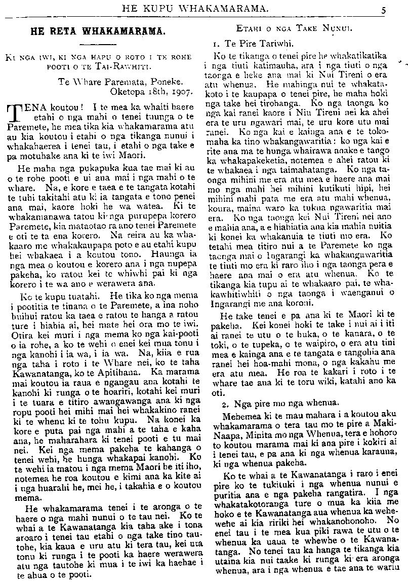 HE KUPU WHAKAMARAMA. HE RETA WHAKAMARAMA. Ki NGA IWI, KI NGA HAPU O KOTO I TE ROHE POOTI O TE TAI-RAWHITI. Te Whare Paremata, Poneke. Oketopa 18th, 1907 TENA koutou! I te mea ka whaiti haere i etahi o nga mahi o tenei tuunga o te Paremete, he mea tika kia whakamarama atu au kia koutou i etahi o nga tikanga nunui i whakahaerea i tenei tau, i etahi o nga take e pa motuhake ana ki te iwi Maori. He maha nga pukapuka kua tae mai ki au o te rohe pooti e ui ana mai i nga mahi o te whare. Na, e kore e taea e te tangata kotahi te tuhi takitahi atu ki ia tangata e tono penei ana mai, kaore hoki he wa watea. Ki te whakamanawa tatou ki nga purupepa korero Paremete, kia mataotao ra ano tenei Paremete e oti te ta ena korero. Na reira au ka wha- kaaro me whakakaupapa poto e au etahi kupu hei whakaea i a koutou tono. Haunga ia nga mea o koutou e korero ana i nga nupepa pakeha, ko ratou kei te whiwhi pai ki nga korero i te wa ano e werawera ana. Ko te kupu tuatahi. He tika ko nga mema i pootitia te tinana o te Paremete, a ina noho huihui ratou ka taea e ratou te hanga a ratou ture i hiahia ai, hei mate hei ora mo te iwi. Otira kei muri i nga mema ko nga kai-pooti o ia rohe, a ko te wehi o enei kei mua tonu i nga kanohi i ia wa, i ia wa. Na, kiia e rua nga taha i roto i te Whare nei, ko te taha Kawanatanga, ko te Apitihana. Ka marama mai koutou ia raua e ngangau ana kotahi te kanohi ki runga o te hoariri, kotahi kei muri i te tuara e titiro awangawanga ana ki nga ropu pooti hei mihi mai hei whakakino ranei ki te whenu ki te tohu kupu. Na konei ka kore e puta pai nga mahi a te taha e kaha ana, he maharahara ki tenei pooti e tu mai nei. Kei nga mema pakeha te kahanga o tenei wehi, he hunga whakapai kanohi. Ko te wehi ia matou i nga mema Maori he iti iho, notemea he roa koutou e kimi ana ka kite ai i nga huarahi he, mei he, i takahia e o koutou mema. He whakamarama tenei i te aronga o te haere o nga mahi nunui o te tau nei. Ko te whai a te Kawanatanga kia taha ake i tona aroaro i tenei tau etahi o nga take tino tau- tohe, kia kaua e uru atu ki tera tau, kei uta tonu ki runga i te pooti ka haere werawera atu nga tautohe ki mua i te iwi ka haehae i te ahua o te pooti. ETAHI O NGA TAKE NUNUI. 1. Te Pire Tariwhi. Ko te tikanga o tenei pire he whakatikatika i nga tiuti katimauha, ara i nga tiuti o nga taonga e heke ana mai ki Nui Tireni o era atu whenua. He mahinga nui te whakata- koto i te kaupapa o tenei pire, he maha hoki nga take hei tirohanga. Ko nga taonga ko nga kai ranei kaore i Niu Tireni nei ka ahei era te uru ngawari mai, te uru kore utu mai ranei. Ko nga kai e kainga ana e te toko- maha ka tino wwhakangawaritia: ko nga kai e rite ana ma te hunga whakawa anake e tango ka whakapakeketia, notemea e ahei ratou ki te whakaea i nga taimahatanga. Ko nga ta- onga mihini me era atu mea e haere ana mai mo nga mahi hei mihini kutikuti hipi, hei mihini mahi pata me era atu mahi whenua, koura, maina waro ka tukua ngawaritia mai era. Ko nga taonga kei Nui Tireni nei ano e mahia ana, a e hiahiatia ana kia mahia nuitia ki konei ka whakanuia te tiuti mo era. Ko tetahi mea titiro nui a te Paremete ko nga taonga mai o Ingarangi ka whakangawaritia te tiuti mo era ki raro iho i nga taonga pera e haere ana mai o era atu whenua. Ko te tikanga kia tupu ai te whakaaro pai, te wha- kawhitiwhiti o nga taonga i waenganui o Ingarangi me ana koroni. He take tenei e pa ana ki te Maori ki te pakeha. Kei konei hoki te take i nui ai i iti ai ranei te utu o te huka, o te kanara, o te toki, o te tupeka, o te waipiro, o era atu tini mea e kainga ana e te tangata e tangohia ana ranei hei hoa-mahi mona, o nga kakahu me era atu mea. He roa te kakari i roto i te whare tae ana ki te toru wiki, katahi ano ka oti. 2. Nga pire mo nga whenua. Mehemea ki te mau mahara i a koutou aku whakamarama o tera tau mo te pire a Maki- Naapa, Minita mo nga Whenua, tera e hohoro to koutou marama mai ki ana pire i kokiri ai i tenei tau, e pa ana ki nga whenua karauna, ki nga whenua pakeha. Ko te whai a te Kawanatanga i raro i enei pire ko te tukituki i nga whenua nunui e puritia ana e nga pakeha rangatira. I nga whakatakotoranga ture o mua ka kiia me hoko e te Kawanatanga aua whenua ka wehe- wehe ai kia ririki hei whakanohonoho. No enei tau i te mea kua piki rawa te utu o te whenua ka uaua te whewhe o te Kawana- tanga. No tenei tau ka hanga te tikanga kia utaina kia nui taake ki runga ki era aronga whenua, ara i nga whenua e tae ana te wariu
