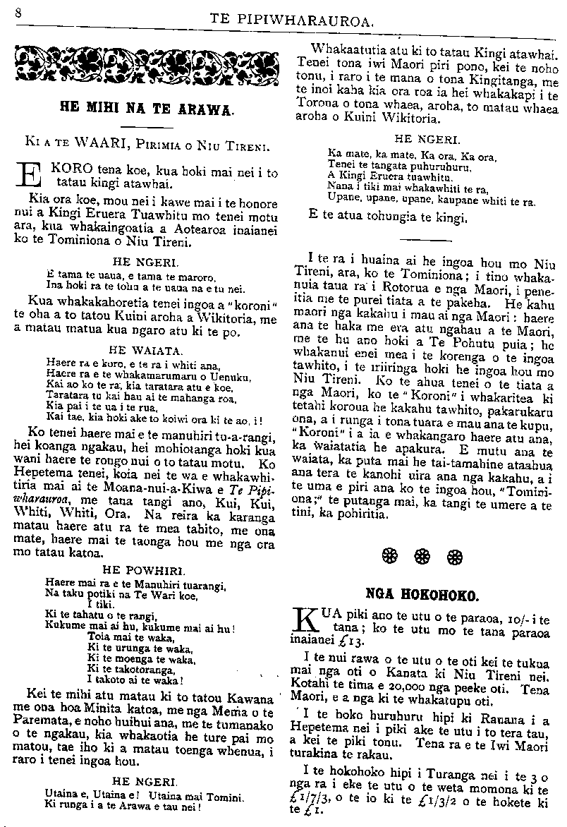 TE PIPIWHARAUROA. HE MIHI NA TE ARAWA. Ki A TE WAARI, PIRIMIA o Niu TIRENI. E KORO tena koe, kua hoki mai nei i to tatau kingi atawhai. Kia ora koe, mou nei i kawe mai i te honore nui a Kingi Eruera Tuawhitu mo tenei motu ara, kua whakaingoatia a Aotearoa inaianei ko te Tominiona o Niu Tireni. HE NGERI. E tama te uaua, e tama te maroro, Ina hoki ra te tohu a te uaua na e tu nei. Kua whakakahoretia tenei ingoa a "koroni" te oha a to tatou Kuini aroha a Wikitoria, me a matau matua kua ngaro atu ki te po. HE WAIATA. Haere ra e koro, e te ra i whiti ana, Haere ra e te whakamarumaru o Uenuku, Kai ao ko te ra kia taratara atu e koe, Taratara tu kai hau ai te mahanga roa, Kia pai i te ua i te rua, Kai tae, kia hoki ake to koiwi ora ki te ao, i Ko tenei haere mai e te manuhiri tu-a-rangi, hei koanga ngakau, hei mohiotanga hoki kua wani haere te rongo nui o to tatau motu. Ko Hepetema tenei, koia nei te wa e whakawhi- tiria mai ai te Moana-nui-a-Kiwa e Te Pipi- wharauroa, me tana tangi ano, Kui, Kui, Whiti, Whiti, Ora. Na reira ka karanga matau haere atu ra te mea tahito, me ona mate, haere mai te taonga hou me nga ora mo tatau katoa. HE POWHIRI. Haere mai ra e te Manuhiri tuarangi, Na taku potiki na Te Wari koe, I tiki. Ki te tahatu o te rangi, Kukume mai ai hu, kukume mai ai hui Toia mai te waka, Ki te urunga te waka, Ki te moenga te waka. Ki te takotoranga, I takoto ai te wakai Kei te mihi atu matau ki to tatou Kawana me ona hoa Minita katoa, me nga Mema o te Paremata, e noho huihui ana, me te tumanako o te ngakau, kia whakaotia he ture pai mo matou, tae iho ki a matau toenga whenua, i raro i tenei ingoa hou. HE NGERI. Utaina e, Utaina e! Utaina mai Tomini. Ki runga i a te Arawa e tau nei! Whakaatutia atu ki to tatau Kingi atawhai. Tenei tona iwi Maori piri pono, kei te noho tonu, i raro i te mana o tona Kingitanga, me te inoi kaha kia ora roa ia hei whakakapi i te Torona o tona whaea, aroha, to matau whaea aroha o Kuini Wikitoria. HE NGERI. Ka mate, ka mate, Ka ora, Ka ora, Tenei te tangata puhuruhuru, A Kingi Eruera tuawhitu. Nana i tiki mai whakawhiti te ra, Upane, upane, upane, kaupane whiti te ra. E te atua tohungia te kingi. I te ra i huaina ai he ingoa hou mo Niu Tireni, ara, ko te Tominiona; i tino whaka- nuia taua ra i Rotorua e nga Maori, i pene- itia me te purei tiata a te pakeha. He kahu maori nga kakahu i mau ai nga Maori: haere ana te haka me era atu ngahau a te Maori, me te hu ano hoki a Te Pohutu puia; he whakanui enei mea i te korenga o te ingoa tawhito, i te iriiringa hoki he ingoa hou mo Niu Tireni. Ko te ahua tenei o te tiata a nga Maori, ko te "Koroni "i whakaritea ki tetahi koroua he kakahu tawhito, pakarukaru ona, a i runga i tona tuara e mau ana te kupu, "Koroni" i a ia e whakangaro haere atu ana, ka waiatatia he apakura. E mutu ana te waiata, ka puta mai he tai-tamahine ataahua ana tera te kanohi uira ana nga kakahu, a i te uma e piri ana ko te ingoa hou, "Tomini- ona;" te putanga mai, ka tangi te umere a te tini, ka pohiritia. NGA HOKOHOKO. KUA piki ano te utu o te paraoa, 10/-- i te tana; ko te utu mo te tana paraoa inaianei £13. I te nui rawa o te utu o te oti kei te tukua mai nga oti o Kanata ki Niu Tireni nei. Kotahi te tima e 20, 000 nga peeke oti. Tena • Maori, e a nga ki te whakatupu oti. I te hoko huruhuru hipi ki Ranana i a Hepetema nei i piki ake te utu i to tera tau, a kei te piki tonu. Tena ra e te Iwi Maori turakina te rakau. I te hokohoko hipi i Turanga nei i te 3 o nga ra i eke te utu o te weta momona ki te £1/7/3, o te io ki te £1/3/2 o te hokete ki te £1.