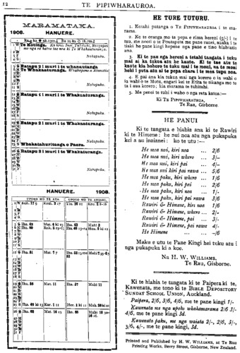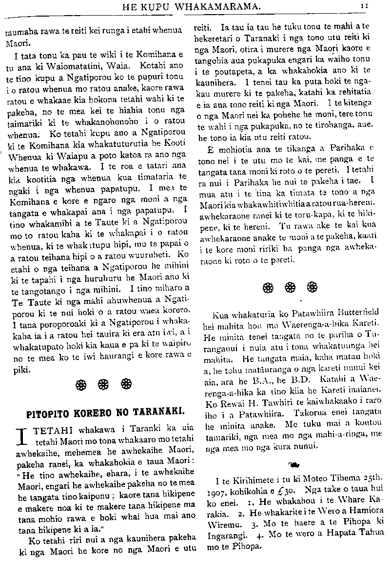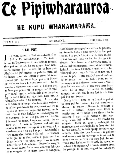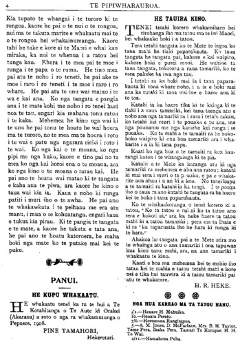 HE KUPU WHAKAMARAMA. taumaha rawa te reiti kei runga i etahi whenua Maori. I tata tonu ka pau te wiki i te Komihana e tu ana ki Waiomatatini, Waia. Kotahi ano te tino kupu a Ngatiporou ko te pupuri tonu i o ratou whenua mo ratou anake, kaore rawa ratou e whakaae kia hokona tetahi wahi ki te pakeha, no te mea kei te hiahia tonu nga tamariki ki te whakanohonoho i o ratou whenua. Ko tetahi kupu ano a Ngatiporou ki te Komihana kia whakatuturutia he Kooti Whenua ki Waiapu a poto katoa ra ano nga whenua te whakawa. I te roa e tatari ana kia kootitia nga whenua kua timataria te ngaki i nga whenua papatupu. I mea te Komihana e kore e ngaro nga moni a nga tangata e whakapai ana i nga papatupu. I tino whakamihi a te Taute ki a Ngatiporou mo to ratou kaha ki te whakapai i o ratou whenua, ki te whakatupu hipi, mo te papai o a ratou teihana hipi o a ratou wuuruheti. Ko etahi o nga teihana a Ngatiporou he mihini ki te tapahi i nga huruhuru he Maori ano ki te tangotango i nga mihini. I tino miharo a Te Taute ki nga mahi ahuwhenua a Ngati- porou ki te nui hoki o a ratou waea korero. I tana poroporoaki ki a Ngatiporou i whaka- kaha ia i a ratou hei tauira ki era atu iwi, a i whakatupato hoki kia kaua e pa ki te waipiro no te mea ko te iwi haurangi e kore rawa e piki. PITOPITO KORERO NO TARANAKI. I TETAHI whakawa i Taranaki ka uia tetahi Maori mo tona whakaaro mo tetahi awhekaihe, mehemea he awhekaihe Maori, pakeha ranei, ka whakahokia e taua Maori: " He tino awhekaihe, ehara, i te awhekaihe Maori, engari he awhekaihe pakeha no te mea he tangata tino kaiponu: kaore tana hikipene e makere noa ki te makere tana hikipene ma tana mohio rawa e hoki whai hua mai ano taria hikipene ki a ia." Ko tetahi riri nui a nga kaunihera pakeha ki nga Maori he kore no nga Maori e utu reiti. Ia tau ia tau he tuku tonu te mahi a te hekeretari o Taranaki i nga tono utu reiti ki nga Maori, otira i murere nga Maori kaore e tangohia aua pukapuka engari ka waiho tonu i te poutapeta, a ka whakahokia ano ki te kaunihera. I tenei tau ka puta hoki te nga- kau murere ki te pakeha, katahi ka rehitatia e ia ana tono reiti ki nga Maori. I te kitenga o nga Maori nei ka pohehe he moni, tere tonu te wahi i nga pukapuka, no te tirohanga, aue. he tono ia kia utu reiti ratou. E mohiotia ana te tikanga a Parihaka e tono nei i te utu mo te kai, me panga e te tangata tana moni ki roto o te pereti. I tetahi ra nui i Parihaka he nui te pakeha i tae. I mua atu i te tina ka timata te tono a nga Maori kia whakawhitiwhitia a ratou rua hereni. awhekaraone ranei ki te toru-kapa, ki te hiki- pene, ki te hereni. Tu rawa ake te kai kua awhekaraone anake te moni a te pakeha, kaati i te kore moni ririki ha panga nga awheka- raone ki roto o te pereti.. Kua whakaturia ko Patawhiira Butter held hei mahita hou mo Waerenga-a-hika Kareti. He minita tenei tangata no te pariha o Tu- ranganui i nuia atu i tona whakatuunga hei mahita. He tangata maia, kaha matau hoki a, he tohu matauranga o nga kareti nunui kei aia, ara he B.A., he B.D. Katahi a Wae- renga-a-hika ka tino kiia he Kareti inaianei. Ko Rewai H. Tawhiri te kaiwhakaako i raro iho i a Patawhiira. Takorua enei tangata he minita anake. Me tuku mai a koutou tamariki, nga mea mo nga mahi-a-ringa, me nga mea mo nga kura nunui. I te Kirihimete i tu ki Moteo Tihema 25th. 1907, kohikohia e £30. Nga take o taua hui ko enei. 1. He whakahou i te Whare Ka- rakia. 2. He whakarite i te Wero a Hamiora Wiremu. 3. Mo te haere a te Pihopa ki Ingarangi. 4. Mo te wero a Hapata Tahua mo te Pihopa.