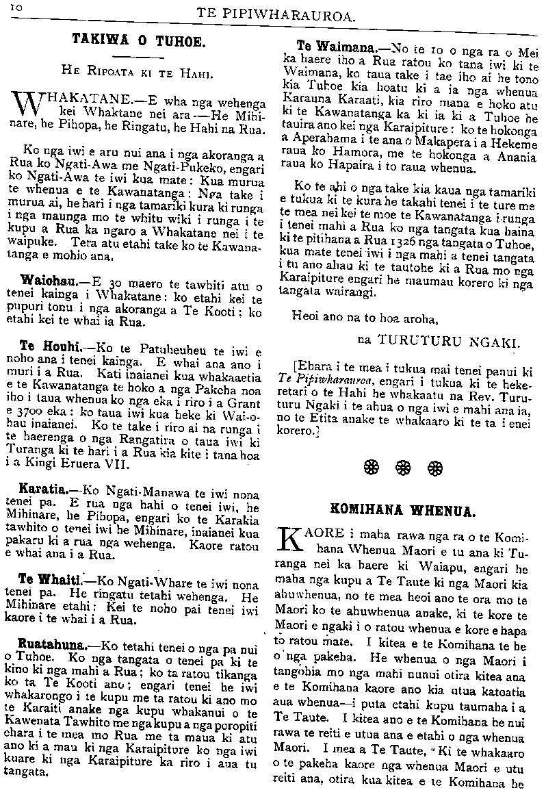 TE PIPIWHARAUROA. TAKIWA O TUHOE. HE RIPOATA KI TE HAHI. WHAKATANE.—E wha nga wehenga kei Whaktane nei ara-—He Mihi- nare, he Pihopa, he Ringatu, he Hahi na Rua. Ko nga iwi e aru nui ana i nga akoranga a Rua ko Ngati-Awa me Ngati-Pukeko, engari ko Ngati-Awa te iwi kua mate; Kua murua te whenua e te Kawanatanga: Nga take i murua ai, he hari i nga tamariki kura ki runga i nga maunga mo te whitu wiki i runga i te kupu a Rua ka ngaro a Whakatane nei i te waipuke. Tera atu etahi take ko te Kawana- tanga e mohio ana. Waiohau.—E 30 maero te tawhiti atu o tenei kainga i Whakatane: ko etahi kei te pupuri tonu i nga akoranga a Te Kooti: ko etahi kei te whai ia Rua. Te Houhi.—Ko te Patuheuheu te iwi e noho ana i tenei kainga. E whai ana ano i muri i a Rua. Kati inaianei kua whakaaetia e te Kawanatanga te hoko a nga Pakeha noa iho i taua whenua ko nga eka i riro i a Grant e 3700 eka: ko taua iwi kua heke ki Wai-o- hau inaianei. Ko te take i riro ai na runga i te haerenga o nga Rangatira o taua iwi ki Turanga ki te hari i a Rua kia kite i tana hoa i a Kingi Eruera VII. Karatia.—Ko Ngati-Manawa te iwi nona tenei pa. E rua nga hahi o tenei iwi, he Mihinare, he Pihopa, engari ko te Karakia tawhito o tenei iwi he Mihinare, inaianei kua pakaru ki a rua nga wehenga. Kaore ratou e whai ana i a Rua. Te Whaiti.—Ko Ngati-Whare te iwi nona tenei pa. He ringatu tetahi wehenga. He Mihinare etahi: Kei te noho pai tenei iwi kaore i te whai i a Rua. Ruatahuna.—Ko tetahi tenei o nga pa nui o Tuhoe. Ko nga tangata o tenei pa ki te kino ki nga mahi a Rua: ko ta ratou tikanga ko ta Te Kooti ano: engari tenei he iwi whakarongo i te kupu me ta ratou ki ano mo te Karaiti anake nga kupu whakanui o te Kawenata Tawhito me nga ku pu a nga poropiti ehara i te mea mo Rua me ta maua ki atu ano ki a mau ki nga Karaipiture ko nga iwi kuare ki nga Karaipiture ka riro i aua tu tangata. Te Waimana.—No te 10 o nga ra o Mei ka haere iho a Rua ratou ko tana iwi ki te Waimana, ko taua take i tae iho ai he tono kia Tuhoe kia hoatu ki a ia nga whenua Karauna Karaati, kia riro mana e hoko atu ki te Kawanatanga ka ki ia ki a Tuhoe he tauira ano kei nga Karaipiture: ko te hokonga a Aperahama i te ana o Makapera i a Hekeme raua ko Hamora, me te hokonga a Anania raua ko Hapaira i to raua whenua. Ko te ahi o nga take kia kaua nga tamariki e tukua ki te kura he takahi tenei i te ture me te mea nei kei te moe te Kawanatanga i runga i tenei mahi a Rua ko nga tangata kua haina ki te pitihana a Rua 1326 nga tangata o Tuhoe, kua mate tenei iwi i nga mahi a tenei tangata i tu ano ahau ki te tautohe ki a Rua mo nga Karaipiture engari he maumau korero ki nga tangata wairangi. Heoi ano na to hoa aroha, na TURUTURU NGAKI. [Ehara i te mea i tukua mai tenei panui ki Te Pipiwharauroa, engari i tukua ki te heke- retari o te Hahi he whakaatu na Rev. Turu- turu Ngaki i te ahua o nga iwi e mahi ana ia, no te Etita anake te whakaaro ki te ta i enei korero.] KOMIHANA WHENUA. KAORE i maha rawa nga ra o te Komi- hana Whenua Maori e tu ana ki Tu- ranga nei ka haere ki Waiapu, engari he maha nga kupu a Te Taute ki nga Maori kia ahuwhenua, no te mea heoi ano te ora mo te Maori ko te ahuwhenua anake, ki te kore te Maori e ngaki i o ratou whenua e kore e hapa to ratou mate. I kitea e te Komihana te he o nga pakeha. He whenua o nga Maori i tangohia mo nga mahi nunui otira kitea ana e te Komihana kaore ano kia utua katoatia aua whenua—i puta etahi kupu taumaha i a Te Taute. I kitea ano e te Komihana he nui rawa te reiti e utua ana e etahi o nga whenua Maori. I mea a Te Taute, " Ki te whakaaro o te pakeha kaore nga whenua Maori e utu reiti ana, otira kua kitea e te Komihana he