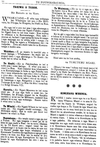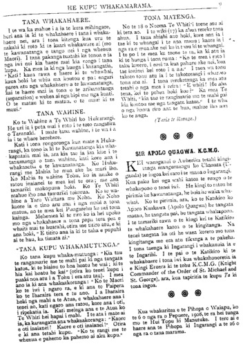 HE KUPU WHAKAMARAMA. TANA WHAKAHAERE. I te wa ka mahue i a ia te kura mihingare, huri ana ia ki te whakahaere i tana i whaka- haere nei, ara i tona kitenga kua uru te nakahi ki roto ki te kaari whakaware ai (mo te kawanatanga e tango nei i nga whenua Maori). I tana pakanga tuatahi ka tonoa e ia nga iwi nei kia haere mai kia rongo i tana kupu. Ka mea ia ki nga hunga i karangatia, "Kati! kaua rawa e haere ki te whawhai, kaua hoki he whiu ma koutou e pa: engari parea atu nga whakahaere a te kawanatanga, kai te haere mai ia tona o te arihanatanga (separation) e wehea ai nga hipi me nga koati. O te matau ki te matau, o te maui ki te maui." TANA WAHINE. Ko te Wahine a Te Whiti ko Hukurangi. Ke uri ia i puta mai i roto i te toto rangatira o Taranaki. I mate tana wahine, i te \\va i a ia i te whare herehere. Kati i tona rongoronga kua mate a Huku- rangi, ka tono ia ki te Kawanatanga kia wha- • kaputaia mai ia, ara kia tae ia kia kite i te tanumanga o tana wahine, kati kore ana i whakaaetia e te kawanatanga. Ko Huku- rangi me Mahia he mua ake he muri iho. Ko Mahia te wahine Tohu, ko ia anake o ratou inaianei te mea kei te ora; me ana tamariki mokopuna hoki. Ko Te Whiti mahue iho ana tamariki tokorua. Ko te wa- hine a Tare Waitara me Noho. Ko Noho kaore ia e tino aru ana i nga mahi a tona matua, no te mea kei Pungarehu ke nei tona kainga. Mehemea ki te riro ko ia hei upoko mo nga whakahaere a tona papa tera pea e whaiti mai te huarahi, otira me titiro atu, e ki ana hoki," E titiro ana ia ki te taha e pupuhi ai te hau, ka timata ai." "TANA KUPU WHAKAMUTUNGA." Ko tana kupu whaka-mutunga: "Kia tau te rangamarie me te mahi pai ki nga tangata katoa, ki te hiainu to hoa hoatu he wai; ki te hia kai hoatu he kai" (otira ko tenei kupu i puaki noa atu i a Tohu i era atu tau). I mea ano ia ki ana whakaakoranga: " Ko te Maori ko te iwi i ngaro ra, e ki ana te Paipera ko te Iharaira tera e tu ano. I a Iharaira hoki nga mahi a te Atua, e whakahaere ana i tenei ao, kati ngaro ana ratou, kore ana i oti, i ripekatia ia. Kati meinga ana e te Atua ko Te Whiti hei hapai i mahi. I te ata i mate ai ia, ka karangatia ana whakaakoranga: " Kaore e oti inaianei! Kaore e oti inaianei!" Otira e ki ana tetahi kupu. " Ko te rangi me te whenua e pahemo ka pahemo ai aku kupu." TONA MATENGA. No te 18 o Noema Te Whiti i toene atu ai ki tera ao. I te wiki (17) ka ahua rereke tona ahua. I taua ahiahi ano hoki, kore ana ia i tae ki te whangai i te ana manu; kaore ia i nga ra o mua ake nei ko ia tonu ki te whangai. I te po i te mea ka toene te ra, ka ki atu ia ki te hunga i tona ruma: " Ko te mea i roto i taku korero, i enei ra kua pahure ake nei, kua tae inainei kei roto i a au." I taua wa tonu takoto tonu atu ia i te takotorangi i wharoro tonu atu ai. I tona rereketanga ka mea atu tetahi o nga mea i reira: " E whiti! He aha tena, kei te pehea hoki koe?" Ka mea Te Whiti, " kia tau te rangimarie ma te mahi pai kia koutou me nga tangata katoa." I te wha o nga haora riro ana te hua, mahue iho ana ko te anga. (Taria te Roanga.) SIR APOLO QUAGWA, K.C.M.G. KEI waenganui o Awherika tetahi kingi- tanga mangumangu ko U kanata (U- ganda) te ingoa kei raro i te mana o Ingarangi. Kua paku kei nga wahi katoa te rongo o te whakapono o tenei iwi. He kingi to ratou he pirimia hene kawanatanga, he hoia he waka wha- whai. Ko te pirimia, ara, ko te Katikiro ko Aporo Kuakawa (Apolo Quagwa) he tangata matau, he tangata pai, he tangata whakapono. I te tamariki rawa o te kingi kei te Katikiro te whakahaere katoa o te kingitanga. Na tenei tangata ka oti he waea korero mo tona kingitanga me era atu tikanga a te pakeha. I tona taenga ki Ingarangi i whakanuia ia e te Ingarihi. I te pai o te Katikiro ki te whakahaere i tona iwi kua whakahonoretia ia e Kingi Eruera ki te tohu K.C.M.G. (Knight Commander of the Order of St. Michael and St. George), ara, kua tapiritia te kupu Ta ki tona ingoa. Kua whakaritea e te Pihopa o Waiapu, ko te 6 o nga ra o Pepuere, 1908, te ra hei tunga mo te Hui Topu ki Manutuke. I tere ai e haere ana te Pihopa ki Ingarangi a te 26 o nga ra o taua marama.