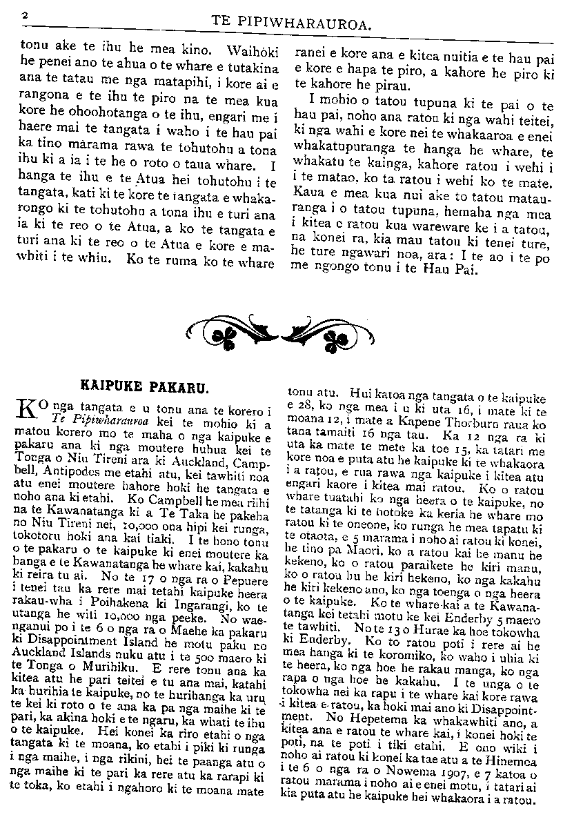 TE PIPIWHARAUROA. tonu ake te ihu he mea kino. Waihoki he penei ano te ahua o te whare e tutakina ana te tatau me nga matapihi, i kore ai e rangona e te ihu te piro na te mea kua kore he ohoohotanga o te ihu, engari me i haere mai te tangata i waho i te hau pai ka tino marama rawa te tohutohu a tona ihu ki a ia i te he o roto o taua whare. I hanga te ihu e te Atua hei tohutohu i te tangata, kati ki te kore te tangata e whaka- rongo ki te tohutohu a tona ihu e turi ana ia ki te reo o te Atua, a ko te tangata e turi ana ki te reo o te Atua e kore e ma- whiti i te whiu. Ko te ruma ko te whare ranei e kore ana e kitea nuitia e te hau pai e kore e hapa te piro, a kahore he piro ki te kahore he pirau. I mohio o tatou tupuna ki te pai o te hau pai, noho ana ratou ki nga wahi teitei, ki nga wahi e kore nei te whakaaroa e enei whakatupuranga te hanga he whare, te whakatu te kainga, kahore ratou i wehi i i te matao, ko ta ratou i wehi ko te mate. Kaua e mea kua nui ake to tatou matau- ranga i o tatou tupuna, hemaha nga mea i kitea e ratou kua wareware ke i a tatou, na konei ra, kia mau tatou ki tenei ture, he ture ngawari noa, ara; I te ao i te po me ngongo tonu i te Hau Pai. KAIPUKE PAKARU. KO nga tangata e u tonu ana te korero i Te Pipiwharauroa kei te mohio ki a matou korero mo te maha o nga kaipuke e pakaru ana ki nga moutere huhua kei te Tonga o Niu Tireni ara ki Auckland, Camp- bell, Antipodes me etahi atu, kei tawhiti noa atu enei moutere hahore hoki he tangata e noho ana ki etahi. Ko Campbell he mea nihi na te Kawanatanga ki a Te Taka he pakeha no Niu Tireni nei, 10, 000 ona hipi kei runga, tokotoru hoki ana kai tiaki. I te hono tonu o te pakaru o te kaipuke ki enei moutere ka hanga e te Kawanatanga he whare kai, kakahu ki reira tu ai. No te 17 o nga ra o Pepuere i tenei tau ka rere mai tetahi kaipuke heera rakau-wha i Poihakena ki Ingarangi, ko te utanga he witi 10, 000 nga peeke. No wae- nganui po i te 6 o nga ra o Maehe ka pakaru ki Disappointment Island he motu paku no Auckland Islands nuku atu i te 500 maero ki te Tonga o Murihiku. E rere tonu ana ka kitea atu he pari teitei e tu ana mai, katahi ka hurihia te kaipuke, no te hurihanga ka uru te kei ki roto o te ana ka pa nga maihe ki te pari, ka akina hoki e te ngaru, ka whati te ihu o te kaipuke. Hei konei ka riro etahi o nga tangata ki te moana, ko etahi i piki ki runga i nga maihe, i nga rikini, hei te paanga atu o nga maihe ki te pari ka rere atu ka rarapi ki te toka, ko etahi i ngahoro ki te moana mate tonu atu. Hui katoa nga tangata o te kaipuke e 28, ko nga mea i u ki uta 16, i mate ki te moana 12, i mate a Kapene Thorburn raua ko tana tamaiti 16 nga tau. Ka 12 nga ra ki uta ka mate te mete ka toe 15, ka tatari me kore noa e puta atu he kaipuke ki te whakaora i a ratou, e rua rawa nga kaipuke i kitea atu engari kaore i kitea mai ratou. Ko o ratou whare tuatahi ko nga heera o te kaipuke, no te tatanga ki te hotoke ka keria he whare mo ratou ki te oneone, ko runga he mea tapatu ki te otaota, e 5 marama i noho ai ratou ki konei, he tino pa Maori, ko a ratou kai he manu he kekeno, ko o ratou paraikete he kiri manu, ko o ratou hu he kiri hekeno, ko nga kakahu he kiri kekeno ano, ko nga toenga o nga heera o te kaipuke. Ko te whare-kai a te Kawana- tanga kei tetahi motu ke kei Enderby 5 maero te tawhiti. No te 13 o Hurae ka hoe tokowha ki Enderby. Ko to ratou poti i rere ai he mea hanga ki te koromiko, ko waho i uhia ki te heera, ko nga hoe he rakau manga, ko nga rapa o nga hoe he kakahu. I te unga o te tokowha nei ka rapu i te whare kai kore rawa -i kitea e ratou, ka hoki mai ano ki Disappoint- ment. No Hepetema ka whakawhiti ano, a kitea ana e ratou te whare kai, i konei hoki te poti, na te poti i tiki etahi. E ono wiki i noho ai ratou ki konei ka tae atu a te Hinemoa i te 6 o nga ra o Nowema 1907 e 7 katoa o ratou marama i noho ai e enei motu, i tatari ai kia puta atu he kaipuke hei whakaora i a ratou.