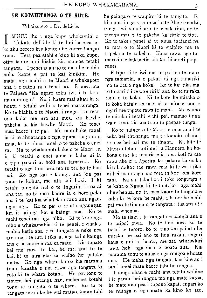 HE KUPU WHAKAMARAMA. TE KOTAHITANGA O TE AUTE. Whaikorero a Dr. deLisle. I MU RI iho i nga kupu whakamihi a Takuta deLisle ki te hui ka mea ia, ko aku korero ki a koutou he korero hangai tonu. Tera pea etahi e kino ki aku kupu, otira kaore au i hiahia kia mamae tetahi tangata. I penei ai au no te mea he mohio noku kaore e pai te kai kinikini. He maha nga mahi a te Maori e whakapoto ana i o ratou ra i tenei ao. E mea ana te Paipera " Ka ngaro toku iwi i te kore matauranga." Na i haere mai ahau ki te hoatu i tetahi wahi o tenei matauranga. Ko te hiahia o te Maori, i runga i te mau ona kaka me era atu mea, kia hawhe pakeha ia kia hawhe Maori. Ko tenei mea kaore i te pai. Me motuhake ranei ia ki te ahuatanga o nga tipuna i nga ra o mua, ki te ahua ranei o te pakeha o enei ra. Ma te whakamotuhake o te Maori i a ia ki tetahi o enei ahua e kaha ai ia e tipu pakari ai hoki ana tamariki. Ko tetahi o nga tino mea mo te ora ko te hau pai. Ko nga kai e kainga ana kia pai tonu te kohua, me ata kai hoki. I ki tetahi tangata nui o te Ingarihi i roa ai ona tau no te mea kaore ia e horo puku ana i te kai kia whatekau rano ana ngau- ngau nga. Ko te pai o te ata ngaungau kia iti ai nga kai e kainga ana. Ko te mahi tenei ma nga niho. Ki te kore nga niho e whakamahia ki te penei, e whaka- mahia ketia ana e te tangata e neke noa atu ana i te ruri i tika ai nga kai e kainga ana e ia kaore e roa ka mate. Kia tupato kei nui rawa te kai, he ruri ano to te kai, ki te hira ake ka waiho hei putake mate. Ko nga whare katoa kia marama tonu, kauaka e nui rawa nga tangata ki roto ki te whare kotahi. He pai tonu te timera hei putanga hau, mehemea kotahi tonu te tangata o te whare. Ko ta te tangata unu ake he wai matao, kaore tahi he painga o te waipiro ki te tangata. E kiia ana i nga ra o mua ko te Maori tetahi, o nga iwi nunui atu te whakatipu no te taenga mai o te pakeha ka ririki te tipu. Ko te take i penei ai te ahua inaianei na te mau o te Maori ki te waipiro me te tupeka a te pakeha. Kaua rawa nga ta- mariki e whakaaetia kia kai hikareti paipa ranei. E tipu ai te iwi ma te pai ma te ora o nga tamariki, a e pakari ai nga tamariki ma te ora o nga koka. Ko te kai tika ma te tamariki i re wa e ririki ana ko te miraka tonu o te koka. Ki te kore he miraka o te koka katahi ka mau ki te miraka kau, e ngari me tupato rawa te mahi. Me waiho te miraka i tetahi wahi pai, mamao i nga wahi kino, kia ma tonu te paepae tunga. Ko te nuinga o te Maori e mau ana i te kaka hei tirohanga ma te kanohi ehara i te mea hei pai mo te tinana. Ka kite te Maori i tetahi koti nui i a Hanuere, ka ho- kona e ia; ka mauria e ia taua koti ra tae rawa ake ki a Aperira ka pakaru ka maka ki tahataha; tae rawa mai ki te wa i tika ai hei mauranga mo tera tu koti kua kore tahi. Ka nui taku koa i taku rongonga i te kaha o Ngata ki te tautoko i nga mahi ahuwhenua, no ta mea kaore te tangata e kaha ki te kore he mahi, a kaore he mahi pai mo te tinana o te tangata i tua atu i te mahi whenua. Mo te tiaki i te tangata e pangia ana e te taipoi piwa. Ko te tino mea ko te tieki i te turoro, ko te tino kai pai atu he miraka, he pai ano te hua rakau, engari kaua e nui te hoatu, me ata whiriwhiri rawa hoki nga mea e hoatu aua. Kia marama tonu te ahua o nga rongoa e hoatu ana. He maha nga tangata kua kite au i ora i tenei mate kaore tahi he rongoa. I rongo ahau e mahi ana tetahi wahine i te parani hei rongoa mo nga mate katoa, he mate ano pea i tupono kapai, engari ko te nuinga o nga mate ka kino ke atu.