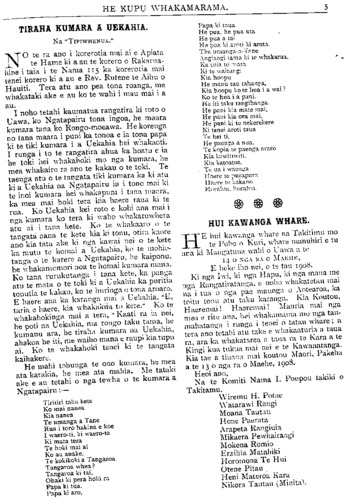 HE KUPU WHAKAMARAMA. TIRAHA KUMARA A UEKAHIA. Na "TIPIWHENUA." NO te ra ano i korerotia mai ai e. Apiata te Hame ki a au te korero o Rakarua- hine i taia i te Nama 115 ka korerotia mai tenei korero ki a au e Rev. Rutene te Aihu o Hauiti. Tera atu ano pea tona roanga, me whakataki ake e au ko te wahi i mau mai i a au. I noho tetahi kaumatua rangatira ki roto o Uawa, ko Ngatapairu tona ingoa, he maara kumara tana ko Rongo-moeawa. He korenga no tana maara i puni ka tonoa e ia tona papa ki te tiki kumara i a Uekahia hei whakaoti. I runga i to te rangatira ahua ka hoatu e ia he toki hei whakahoki mo nga kumara, he mea whakairo ra ano te kakau o te toki. Te taenga atu o te tangata tiki kumara ka ki atu ki a Uekahia na Ngatapairu ia i tono mai ki te inoi kumara hei whakapuni i tana maara, ka mea mai hoki tera kia haere raua ki te rua. Ko Uekahia kei roto e kohi ana mai i nga kumara ko tera ki waho whakatuwhera atu ai i tana kete. Ko te whakaaro o te tangata nana te kete kia ki tonu, otira kaore ano kia tata ake ki nga kawai nei o te kete ka mutu te homai a Uekahia, ko te mohio- tanga o te karere a Ngatapairu, he kaiponu. he whakamoemori noa te homai kumara mana. Ko tana rurukutanga i tana kete, ka panga atu te mata o te toki ki a Uekahia ka puritia tonutia te kakau, ko te huringa o tona aroaro. E haere ana ka karanga mai a Uekahia, "E, taria e haere, kia whakakiia to kete." Ko te whakahokinga mai a tera, " Kaati ra ia nei, he poti na Uekahia, ma rongo taku tama, he kumanu ara, he tiraha kumara na Uekahia, ahakoa he iti, me waiho mana e raupi kia tupu ai. Ko te whakahoki tenei ki te tangata kaihakere. He mahi tohunga te ono kumara, he mea ata karakia, he mea ata mahia. Me tataki ake e au tetahi o nga tewha o te kumara a Ngatapairu:— Tiritiri taku kete Ko mai nanea Kia nanea Te umanga a Tane Rua i toro hakina e koe I waero-ti, Id waero-ta Ki mata tera Te hoki mai ai Ko au anake, Te kokikoki a Tangaroa. Tangaroa whea? Tangaroa ki tai, Ohaki ki pera hold ra Papa ki tua, Papa ki aro, Papa ki taua. He pua, he pua uta He pua a tai He pua ki aroti ki arota. The umanga-a-Tane Angiangi tama ki te whakarua, Ka tuia to mata Ki te wairangi Kia hoopu He manu tau tahanga. Kia hoopu ko te hua i a wai? Ko te hua i a pani. He iti taku tangihanga. He pani kia mate mai, He pani kia ora mai, He pani ki te nekerekere Ki tenei aroti taua Te hei ti, He paenga a nua, Te kopia te paenga araro Kia kawitiwiti, Kia katoatoa. Te ua i waenga. Haere te purapura Haere te. kakano Horahia horahia. HUI KAWANGA WHARE. HE hui kawanga whare na Takitimu mo te Poho o Kuri, whare manuhiri e tu ana ki Maungatuna wahi o Uawa a te 14 o NGA RA o MAEHE, E heke iho nei, o te tau 1908. Ki nga Iwi, ki nga Hapu, ki nga mana me nga Rangatiratanga, e noho whakatetau mai na i tua o nga pae maunga o Aotearoa, ka toitu tonu atu taku karanga. Kia Koutou, Haeremai! Haeremai! Mauria mai nga mea e rite ana, hei whakamama mo nga tau- mahatanga i runga i tenei o tatau whare; a tera ano tetahi atu take e whakaaturia a taua ra, ara ka whakatarea a taua ra te Kara a te Kingi kua tukua mai nei e te Kawanatanga. Kia tae a tinana mai koutou Maori, Pakeha a te 13 o nga ra o Maehe, 1908. Heoi ano, Na te Komiti Nama I. Poupou takiki o Takitamu. Wiremu H. Potae Watarawi Rangi Moana Tautau Hone Paerata Arapeta Rangiuia Mikaera Pewhairangi Mokena Romio Eraihia Matahiki Horomona Te Hui Otene Pitau Heni Materoa Kara Nikora Tautau (Minita).