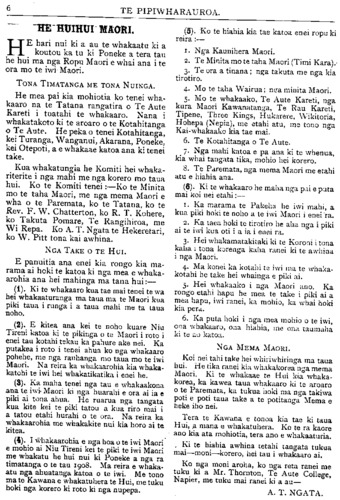 TE PIPIWHARAUROA. — HE HUIHUI MAORI. HE hari nui ki a au te whakaatu ki a koutou ka tu ki Poneke a tera tau he hui ma nga Ropu Maori e whai ana i te ora mo te iwi Maori. TONA TIMATANGA ME TONA NUINGA. He mea pai kia mohiotia ko tenei wha- kaaro na te Tatana rangatira o Te Aute Kareti i tuatahi te whakaaro. Nana i whakatakoto ki te aroaro o te Kotahitanga o Te Aute. He peka o tenei Kotahitanga, kei Turanga, Wanganui, Akarana, Poneke, kei Otepoti, a e whakaae katoa ana ki tenei take. Kua whakatungia he Komiti hei whaka- riterite i nga mahi me nga korero mo taua hui. Ko te Komiti tenei:—Ko te Minita mo te taha Maori, me nga mema Maori e wha o te Paremata, ko te Tatana, ko te Rev. F. W. Chatterton, ko R. T. Kohere, ko Takuta Pomare, Te Rangihiroa, me Wi Repa. Ko A. T. Ngata te Hekeretari, ko W. Pitt tona kai awhina. NGA TAKE o TE Hui. E panuitia ana enei kia rongo kia ma- rama ai hoki te katoa ki nga mea e whaka- arohia ana hei mahinga ma tana hui:— (1). Ki te whakaaro kua tae mai tenei te wa hei whakaaturanga ma taua ma te Maori kua piki taua i runga i a taua mahi me ta taua noho. (2). E kitea ana kei te noho kuare Niu Tireni katoa ki te pikinga o te Maori i roto i enei tau kotahi tekau ka pahure ake nei. Ka putakea i roto i tenei ahua ko nga whakaaro pohehe, me nga rauhanga mo taua mo te iwi Maori. Na reira ka whakaarohia kia whaka- katohi te iwi hei whakatikatika i enei he. (3). Ka maha tenei nga tau e whakaakona ana te iwi Maori ki nga huarahi e ora ai ia e piki ai tona ahua. He ruarua nga tangata kua kite kei te piki tatou a kua riro mai i a tatou etahi hurahi o te ora. Na reira ka whakaarohia me whakakite nui kia horo ai te kitea. (4). I whakaarohia e nga hoa o te iwi Maori e mohio ai Niu Tireni kei te piki te iwi Maori me whakatu he hui nui ki Poneke a nga ra timatanga o te tau 1908. Ma reira e whaka- atu nga ahuatanga katoa o te iwi. Me tono ma te Kawana e whakatuhera te Hui, me tuku hoki nga korero ki roto ki nga nupepa. (8). Ko te hiahia kia tae katoa enei ropu ki reira:— 1. Nga Kaunihera Maori. 2. Te Minita mo te taha Maori (Timi Kara).- 3. Te ora a tinana; nga takuta me nga kia tirotiro. 4. Mo te taha Wairua; nga minita Maori. 5. Mo te whakaako, Te Aute Kareti, nga kura Maori Kawanatanga, Te Rau Kareti, Tipene, Three Kings, Hukarere, Wikitoria, Hohepa (Nepia), me etahi atu, me tono nga Kai-whakaako kia tae mai. 6. Te Kotahitanga o Te Aute. 7. Nga mahi katoa e pa ana ki te whenua, kia whai tangata tika, mohio hei korero. 8. Te Paremata, nga mema Maori me etahi atu e hiahia ana. (6). Ki te whakaaro he maha nga pai e puta mai koi nei etahi:— 1. Ka marama te Pakeha he iwi mahi, a kua piki hoki te noho a te iwi Maori i enei ra. 2. Ka taea hoki te tirotiro he aha nga i piki ai te iwi kua oti i a ia i enei ra. 3. Hei whakamatakitaki ki te Koroni i tona kaha 1 tona korenga kaha ranei ki te awhina i nga Maori. 4. Ma konei ka kotahi te iwi ma te whaka- kotahi he take hei whainga e piki ai. 5. Hei whakaako i nga Maori ano. Ka rongo etahi hapu he mea te take i piki ai a mea hapu, iwi ranei, ka mohio, ka whai hoki kia pera. 6. Ka puta hoki i nga mea mohio o te iwi, ona whakaaro, ona hiahia, me ona taumaha ki te ao katoa. NGA MEMA MAORI. Koi nei tahi take hei whiriwhiringa ma taua hui. He tika ranei kia whakakorea nga mema Maori. Ki te whakaae te Hui kia whaka- korea, ka kawea taua whakaaro ki te aroaro o te Paremata, ka tukua hoki ma nga takiwa poti e poti taua take a te potitanga Mema e heke iho nei. Tera te Kawana e tonoa kia tae ki taua Hui, a mana e whakatuhera. Ko te ra kaore ano kia ata mohiotia, tera ano e whakaaturia. Ki te hiahia awhina tetahi tangata tukua mai—moni—korero, hei tau i whakaaro ai. Ko nga moni aroha, ko nga reta ranei me tuku ki a Mr. Thornton, Te Aute College, Napier, me tuku mai ranei ki a au— A. T. NGATA.