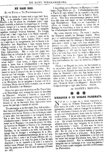 HE KUPU WHAKAMARAMA. Ki TE ETITA O TE PIPIWHARAUROA. KEI te kaha te haere mai o nga hahi hou o te pakeha i enei ra ki roto i nga iwi Maori, a ko te ahua he whakahe tonu i nga hahi tuatahi, a kahore he hopohopo ki te wha- kahe, tango ai i a ratou akoranga hei koinga mo a ratou kupu, na titi tonu ki te tangata ngakau matapo wairua hiamoe. Te hunga kihai nei i kai i nga hua o te Hahi tuatahi i mutu ai ratou te kai i a ratou i mau ai te rongo puta noa te motu katoa—Hoi—i enei ra 1 nga ra o te rangimarie, kei te haere o te Momona kai Kauwhau i nga maara katoa ahakoa nawai, a kei te haere ano hoki a te " Ra Tuawhitu o te Haerenga Mai (Seventh Day Adventist). Me a raua nei pepa reo Maori kei te tohaina ki nga marae o katoa te motu. Na, i tuhi ai ahau i enei hahi, he whakatupato naaku. " Kei rapu hahi te hunga whai hahi." Aua rawa, e rapu, aua rawa, nana e kore koe e whakatikaia i te ingoa Hahi. Ora rawa atu koe kei runga i to whaka- pono ki te ingoa o Ihu Karaiti anake. Ko tenei ta taua e pupuri ai, ko te ingoa o Ihu i homai nei hei oranga. Hore ke atu i raro i te rangi e rapu ai koe e pupuri ai koe e mahi ai koe e ako ai koe mate noa. Te akoranga a te Momona ko te paipera i homai nei ki a Hohepa Mete, me te iriiri rumaki, me te mau ano te Karakia i te Ratapu. Otira he pera ano te iriiri a te Ra Tuawhitu o te Haerenga mai erangi ko tana ra karakia he Harerei. Ahakoa i riterite a raua iriiri rumaki hore rawa he painga o tetahi ki tetahi. Whai hoki ahakoa i rite te ra karakia a te Hurai ki ta te Seventh Day Adventist hore rawa he painga o tetahi ki tetahi. Te akoranga a te Seventh Day Adventist— Kei tana ra Hapati tana tika no te mea he ture pumau tera ra na Ihowa a ko te koinga tenei o tana ako hei werowero i te tangata kuare. Na e aku hoa Karaitiana he mea tika me whakamarama i konei te take i karakiatia ai tenei ra te Ratapu, i te mea he pono, he tika, he harerei te Hapati o Ihowa o te timatanga. Na i waiho ai tenei ra te Ra tapu ara te Sunday, te ra tuatahi o te wiki hei karakia- tanga ma te hunga i whakapono ki a Ihu. He ra tohu whakamaharatanga ki te ra i ara ake ai a Ihu i roto i te Urupa (Matiu 28: 1). Te ra tuatahi o te wiki ka puta a Ihu ki nga Apotoro i te ra tuatahi o te wiki i a ratou e huihui ana (Hoani 20-19). E waru ra i muri mai ka puta ano a Ihu ki ana akonga (Hoani 20; 26), I kauwhau ano a Paora i te Ratapu a i tuku hapa (Nga Mahi 20: 7). I whakamahara ano a Paora ki nga teina i te ra tuatahi o te wiki rongoa ai i nga kohikohi mo te hahi (1 Kori. 16-2). Hei tino maramatanga pumau tenei kua rite noa mai tenei ra hei karakiatanga i nga Karaipiture. Kati mo te " tuawhitu," e whitu ra timata i te Manei te tatau ko te Ratapu te tuawhitu, e ono ra mahi te whitu ka whakatapua hei karakiatanga. Na reiea riterite tonu: Te wahi i rereke, he Hararei tetahi, he Ratapu tetahi. Pera pu i te mahi tohungatanga o te mana o Arona —kua rereke nei i te ritenga o Merekihereka, pera ano i etahi o nga ture kua rereke (Hi- peru 7: 1 1-12). Kua whakakorea hoki te ture i whakatakotoria i mua he kore kaha, he kore hua (Hiperu 7 : 18, 19)' he kore hoki e tino tika i te ture, kua whai he hoki tu Kawenata Tawhito), na reira ka rapua he wahi mo te tuarua (Hiperu 8: 7). Tetahi kua tawhitotia kua koroheketia ka tata te memeha (Hiperu 8, 13). Penei i te Hapati he ture, he kawenata te ra tuawhitu, kua whiti kua rereke noa mai i nga ra i a te Karaiti ko tana ra rongoa turoro tena he Harerei i kiia nei kia kaua rawa e mahia tetahi mahi i taua ra hoi mahia iho, te take ehara i taua ra te take u te oranga. erangi ko Ihu pu ake ano na reira te kupu nei, " Koia te Ariki o te Hapati." Ko te wha- kaupokotanga u nga mea katoa. Amine. na HAPETA RENATA. WERANGA O TE WHARE PAREMATA. NO te 11 o nga ra u tenei marama ka wera te Whare Paremata i Poneke. kore rawa he \\vahi i ara heoi ano ko te ruma pukapuka anake, i ara ai i hanga ki te konatu. Ki te whakaaro i timata te ahi i roto i te ruma o nga kai-whakamaori, kore kau he tumere taua ruma. I ki te kai-tiaki i tae ia ki waho o taua ruma a kahore kau he tohu ahi i kitea e ia. He whare tawhito te Paremata na reira ahakoa kaha noa nga tangata ki te tinei i te ahi kore rawa i mate. E kiia ana he maha nga pukapuka a te Kawanatanga i wera i te ahi: Ko te utu o te whare katoa £150, 000, ko nga moni inihua e £20, 000. Kua puta te kupu a te Pirimia kia kohikohia e te iwi nui he moni hei hanga Paremata hou, kia £1 ma te tangata kotahi. Kei te whakakaitoa etahi tangata mo te weranga o te " ana kai-pahua." Kei te tono etahi tangata me hiki te Paremata ke Pamutana.