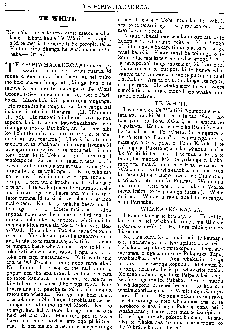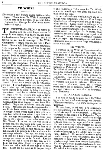 TE PIPIWHARAUROA. TE WHITI. He maha o enei korero kaore matou e wha- kaae. Ehara kau a Te Whiti i te poropiti, a ki te mea ia he poropiti, he poropiti teka. Ko tana tino tikanga he whai mana motu- hake.—ETITA.] TE "PIPIWHARAUROA," te manu pi- kauria atu ra enei kupu ruarua ki runga ki ena maara hau haere ai, hei titiro iho hoki ma era hunga atu, ki nga hua o te takiwa ki au, mo te matenga o Te Whiti Orongomai—i hinga mai nei kei roto o Pari- haka. Kaore hoki iriiri patai tona hinganga, " He rangatira he tangata nui kua hinga nei inaianei i roto i a Iharaira." (II. Hamuera III. 38)- He rangatira ia he uri hoki no nga tupuna, ko ia te upoko kai-whakahaere i nga tikanga o roto o Parihaka, ara ko raua tahi ko Tohu (kua riro noa atu ra tera ki te one- one i era atu marama.) Tino kaha atu ana tangata ki te whakahaere i a raua tikanga ki waenganui o nga iwi o te motu nei. I mau tonu raua ki te Toka a nga kaumatua i whakapupuri iho ai ki a raua, a taea noatia te wa i wehe a tinana atu ai raua i waenganui o raua iwi ki te wahi ngaro. Ko te toka ara ko te mea i whaia mai ai e nga tupuna i Eropi. I tera wa e kotahi ana te whakaaro o te ao. I te wa ka tuhera te ataarangi wehe ana i reira nga iwi, haere ana mai i reira o tatou tupuna ki te kimi i te toka i te aranga mai o tera. Kati ko te pakeha haere ana ki te tonga o te ra. Haere mai ana o tatou tupuna noho ake he moutere whiti mai he moana noho ake he moutere whiti mai he moana a kitea rawa tia ake te toka ko te Ika- a-Maui. Rapu ake te Pakeha i tana i te tonga o te ra. Mau ake ana tana he tangaroa hutia ana ki uta ko te matauranga kati ko ratou ko te hunga i haere whera nana i kite te ki o te- toka kati whiwhi ana ratou i nga hua o te toka ara nga matauranga. Kati whiti mai ana te iwi Pakeha i reira noho rawa ake i Niu Tireni. I te wa ka tae mai ratou e pupuri noa iho ana tatou ki te toka nei (ara ko tatou kaumatua) e kimi ana kei hea ra te ki e tuhera ai, e kitea ai hoki nga rawa. Kati tuhera ana i te pakeha te toka a riro ana i a ratou nga whenua. Ko nga hua hoki ra era o te toka nei o Niu Tireni i tirohia atu nei hei oranga mo tatou mo te iwi Maori. Kati ko te anga kau kei a tatou ko nga hua ia o te heki nei kua riro. Heoi tera pea te wa e haere mai nei e hoki ai ano nga pi ki tona rua. E hoa ma ko ia nei ra te paepae tunga o enei tangata o Tohu raua ko Te Whiti, ara ko te tatari i nga mea pirau kia ora i nga mea kawa kia reka. A raua whakahaere whakamiharo atu ki te hunga whai whakaaro, reka atu ki te hunga whai taringa, whakaputiputi ana ki te hunga whai kanohi. Kaore ranei he toitanga o te korari i tae mai ki te hunga whaitaringa? Ara ta raua poropititanga ino te kingi kia kore e tu. Ehara ranei i te putiputi ki te hunga whai kanohi ta raua merekara mo te pu repo i tu ki Parihaka? Ara ta raua tutakinga i te ngutu o te pu repo. He whakahaere ra enei kaore e mohiotia ana tera e mana i nga whakatupu- ranga o naianei. TE WHITI. I whanau ka Te Whiti ki Ngamotu e wha- tata atu ana ki Moturoa, i te tau 1823 Ko tona papa ko Tohu-Kakahi, he rangatira no Ngatiawa. Ko tona whaene ko Rangi-kawau. he tamahine na Te Whetu, he rangatira a Te Whetu no Taranaki. E toru nga ra o te matenga o tona papa o Tohu Kakahi, i te pakanga a Pukerangiora ka whanau mai a Te Whiti ki tenei ao. I te mea ka huaki te tatau, ka mahaki hoki te pakanga a Puke- rangiora. mauria ana ia e tona whaene ki Waikanae. Kati whakahokia mai aua raua ki Taranaki nei noho rawa ake i Otumatua, e whatata atu ana ki Pihama. Wehe mai ana raua i reira noho rawa ake i Warea (nona ireira ko te pakanga tuatahi). Wehe mai ana i Warea u rawa aka i te tauranga, ara i Parihaka. WHAKAAKO RANGA. I te mea ka rua te kau nga tau o Te Whiti, ka uru ia hei whaka-ako-ranga ma Rimene (Riemenschneider). He kura mihingare no Tiamana. No tana kura, ka oti mai i a ia te kaupapa o ta matauranga o te Karaipiture nana nei ia i whakakanapa ki te matakopuni. Tona ma- tauranga ki nga kupu o te Pukapuka Tapu, whakamiharo atu. Ana whakarite-ritenga toii ana ki te taringa kopunui. Mehemea ki te tangi tona reo he kupu whakarite anake. Ko tona matauranga ki te Paipera kei runga ke ake o nga minita Pakeha. [Kaore matou e whakapono ki tenei, he mea tito kau nga whakamaoritanga a Te Whiti i nga Karaipi- ture.—ETITA."] Ko ana whakamarama-rawa i etehi rarangi o roto whakaraoa ana ki te korokoro o nga hunga Pakeha nana nei i whakararangi haere tenei mea te karaipiture. Ko te kupu a tetahi pakeha hauhau, e ki ana. " Ki te whakaritea to raua matauranga ko Te Whiti, e hara noiho ia."