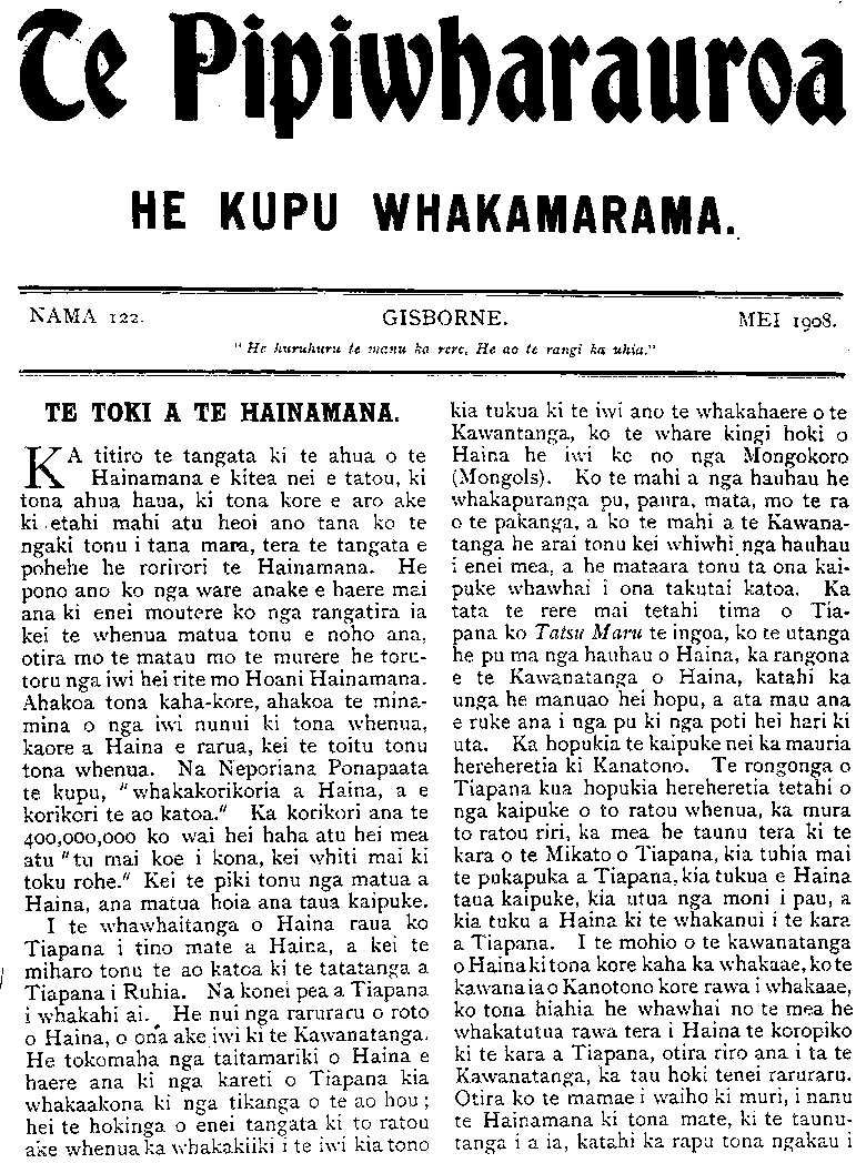 Te Pipiwharauroa HE KUPU WHAKAMARAMA. NAMA 122. GISBORNE. " He huruhuru te manu ka rere, He ao te rangi ka whia." MEI 1908. TE TOKI A TE HAINAMANA. KA titiro te tangata ki te ahua o te Hainamana e kitea nei e tatou, ki tona ahua haua, ki tona kore e aro ake ki etahi mahi atu heoi ano tana ko te ngaki tonu i tana mara, tera te tangata e pohehe he rorirori te Hainamana. He pono ano ko nga ware anake e haere mai ana ki enei moutere ko nga rangatira ia kei te whenua matua tonu e noho ana, otira mo te matau mo te murere he toru- toru nga iwi hei rite mo Hoani Hainamana. Ahakoa tona kaha-kore, ahakoa te mina- mina o nga iwi nunui ki tona whenua, kaore a Haina e rarua, kei te toitu tonu tona whenua. Na Neporiana Ponapaata te kupu, "whakakorikoria a Haina, a e korikori te ao katoa." Ka korikori ana te 400, 000, 000 ko wai hei haha atu hei mea atu " tu mai koe i kona, kei whiti mai ki toku rohe." Kei te piki tonu nga matua a Haina, ana matua hoia ana taua kaipuke. I te whawhaitanga o Haina raua ko Tiapana i tino mate a Haina a kei te miharo tonu te ao katoa ki te tatatanga a Tiapana i Ruhia. Na konei pea a Tiapana i whakahi ai. He nui nga raruraru o roto o Haina, o ona ake iwi ki te Kawanatanga. He tokomaha nga taitamariki o Haina e haere ana ki nga kareti o Tiapana kia whakaakona ki nga tikanga o te ao hou; hei te hokinga o enei tangata ki to ratou ake whenua ka whakakiiki i te iwi kia tono kia tukua ki te iwi ano te whakahaere o te Kawantanga, ko te whare kingi hoki o Haina he iwi ke no nga Mongokoro (Mongols). Ko te mahi a nga hauhau he whakapuranga pu, paura, mata, mo te ra o te pakanga, a ko te mahi a te Kawana- tanga he arai tonu kei whiwhi nga hauhau i enei mea, a he mataara tonu ta ona kai- puke whawhai i ona takutai katoa. Ka tata te rere mai tetahi tima o Tia- pana ko Tatsu Maru te ingoa, ko te utanga he pu ma nga hauhau o Haina, ka rangona e te Kawanatanga o Haina, katahi ka unga he manuao hei hopu, a ata mau ana e ruke ana i nga pu ki nga poti hei hari ki uta. Ka hopukia te kaipuke nei ka mauria hereheretia ki Kanatono. Te rongonga o Tiapana kua hopukia hereheretia tetahi o nga kaipuke o to ratou whenua, ka mura to ratou riri, ka mea he taunu tera ki te kara o te Mikato o Tiapana, kia tuhia mai te pukapuka a Tiapana, kia tukua e Haina taua kaipuke, kia utua nga moni i pau, a kia tuku a Haina ki te whakanui i te kara a Tiapana. I te mohio o te kawanatanga o Haina ki tona kore kaha ka whakaae, ko te kawana ia o Kanotono kore rawa i whakaae, ko tona hiahia he whawhai no te mea he whakatutua rawa tera i Haina te koropiko ki te kara a Tiapana, otira riro ana i ta te Kawanatanga, ka tau hoki tenei raruraru. Otira ko te mamae i waiho ki muri, i nanu te Hainamana ki tona mate, ki te taunu- tanga i a ia, katahi ka rapu tona ngakau i
