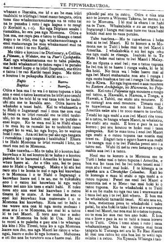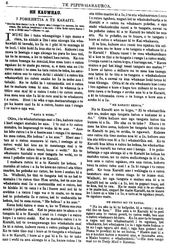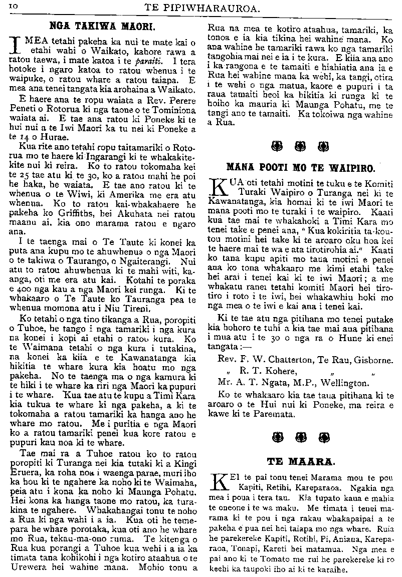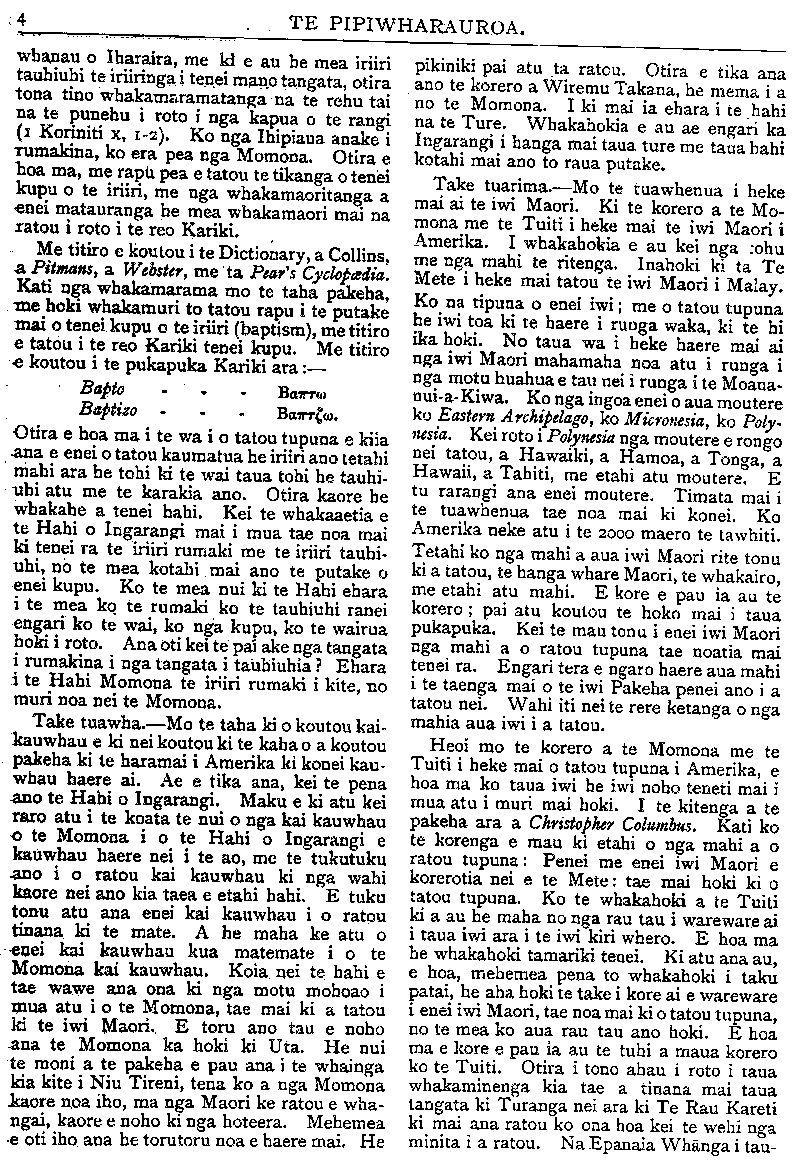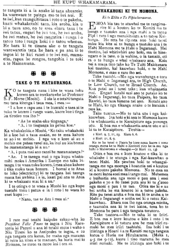 HE KUPU WHAKAMARAMA. te tangata ki a ia anake ki tana ahuareka ka wareware te painga mo te iwi nui. E te iwi kua raungaititaua i roto o te pakeha, kaati whakakotahi taua, kia aroha, kia u ki a taua ano, no te mea ehara taua i te iwi tutua, engari he iwi toa, he ivvi aroha, he iwi matau, he iwi rangatira i runga i o tatou toto i runga hoki i o tatou whenua. He hara ki te tinana ake o te tangata warewaretia tena he hara e pa ana ki te ingoa ki te kiri ranei o te iwi nui, mama-etia, rapua he rongoa, tangohia i te toki a te Hainamana. TAKE 0 TE MATAURANGA. KO te tangata nana i kite te waea tuku korero ara te terekarawhe ko Professor S. F. Morse (Moohi). I uia ia e tetahi tangata mo tana kitenga i taua mea, i mea : — " I a koe e rapu ana i te huarahi e taea ai te tuku te korero i runga waea, kaore koe i tinga ka tirotiro noa iho ?" " Ae he maha-aku tinganga," " A, i to tinganga ka pehea koe." Ka whakahokia e Moohi, " Ko taku whakahoki ki a koe hei a taua anake, no te mea kahore te ao i te mohio. I nga wa e kore ai au e mohio me pehea ranei au, ka inoi au kia homai he maramatanga ki a au." " A, i puta mai ano ranei he maramatanga?" " Ae. I te taenga mai o nga kupu whaka-mihi moku i Amerika i Europe mo taku ki-tenga i te waea tuku korero, i mea ahau kahore i tika moku taua honore. I homai e te Atua te hiko (electricity) ki te tangata hei taonga mana hei awhina i a ia, kaati pai ana te Atua ki te whakaatu mai ki a au." I te otinga o te waea a Moohi ko nga kupu tuatahi tonu i patua e ia i roto i te waea ko enei kupu : — " Nana, tae te Atu i mea ai." I rere mai tetahi kaipuke rakau-wha ko President Felix Faure te ingoa i Niu Kare-tonia ki Parani u ana ki tetahi motu i waho o Niu Tireni ko te Antipodes te ingoa, e 22 nga tangata ora katoa, he maha nga marama ki reira ka kitea e te manuao, ka haria mai ki Riritana, he toroa ta ratou kai i ora ai.WHAKAHOKI KI TE MOMONA. Ki te Etita o Te Pipiwharauroa. EHOA kia tau te atawhai me te rangima-rire ki a koutou ko te Komiti me te hunga e tautoko ana i nga mahi a ta tatou Pîpî i raro i nga manakitanga a to tatou Kai-hanga. He reta he ripoata ano hoki tenei naku kia kite ai te hunga e tautoko ana i te Hahi Momona me te Hahi o Ingarangi. Hei tirotiro, hei whiriwhiri ano hoki, ma te hine-ngaro o ia tane, o ia wahine, o ia tamaiti, oti ra o te hunga e whai whakaaro ana. Koia nei a maua tino take ko Te Tuiti Makitanara kai tautoko, kai kauwhau hoki, o te Hahi Momona, e mau e raro iho aei. Take tuatahi. — Mo nga wawahanga e toru o te Hahi o Ingarangi ara, te High Church, te Low Church, me te Broad Church. Ae. Kua patai au i tenei take ; kua whakaaetia mai. Engari kotahi mai ano te putake ko te Hahi o Ingarangi, ko taua Paipera, ko taua Rawiri, ko taua himene nei ano. Kotahi ano te Hahi, ko nga tikanga anake o te karakia i rere ke. Take tuarua. — Mo te taha utu i nga kai-kauwhau. Ina hoki e ki ana te Momona kaore i te whakaaetia e te Karaipiture nga pononga utu. E hoa ma e whakaaetia ana te utu e ai i ki ta te Karaipiture. Tirohia — 1 Kori. 9, 7, ii, 13. Kara 6, 6. 2 Kori. ii, 8, g. Ko te he tenei o Paora he kore nona kaore i tono oranga mona ke te Hahi o Koriniti riro ke ia ma nga hahi o Makeronia e whangai. — (2 Kori 12, 13). Otira e hoa ma e kore koutou e tika ki te whakahe i te utunga i nga Kai-kauwhau o tenei Hahi. Me pewhea hoki te whangai-tanga me nga moenga i hoatutia nei e koutou ki a koutou pakeha Momona. No te mea na te moni katoa enei mea i tango mai. Mehemea e huihuitia ana nga moni e pau ana i enei pakeha e 70 e 8o ranei puta atu ki te £2000 nga moni e pau i te tau. Otira me ki e au hei aroha ke ma koutou ki a tatou pakeha. Rite pu tenei aroha e hoa ma ki te aroha a te Hahi o Ingarangi e aroha nei ki o ratou Kai-kauwhau. Ehara noa iho nga oranga minita, e taumaha ana ki te iwi katoa, tena ko te Momona he patu i nga tangata torutoru. Take tuatoru. — Mo te taha ki te Iriiri. E hoa ma e kore koutou e kite i roto i te Karaipiture e ki tuturu ana he mea iriiri ru-maki he mea iriiri tauhiuhi. Ina hoki i te iriiringa a Hoani i a te Karaiti me nga tangata katoa o Huria me Hiruharama. (Maka i, 4-5 me 9-12), kaore i tino marama he mea iriiri rumaki. Me te iriiringa ano hoki i te