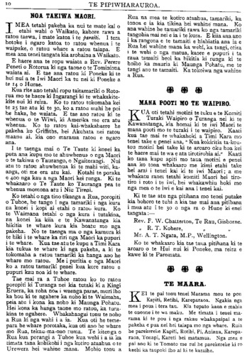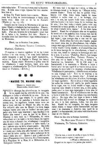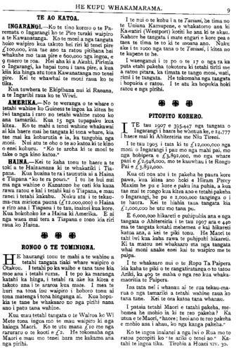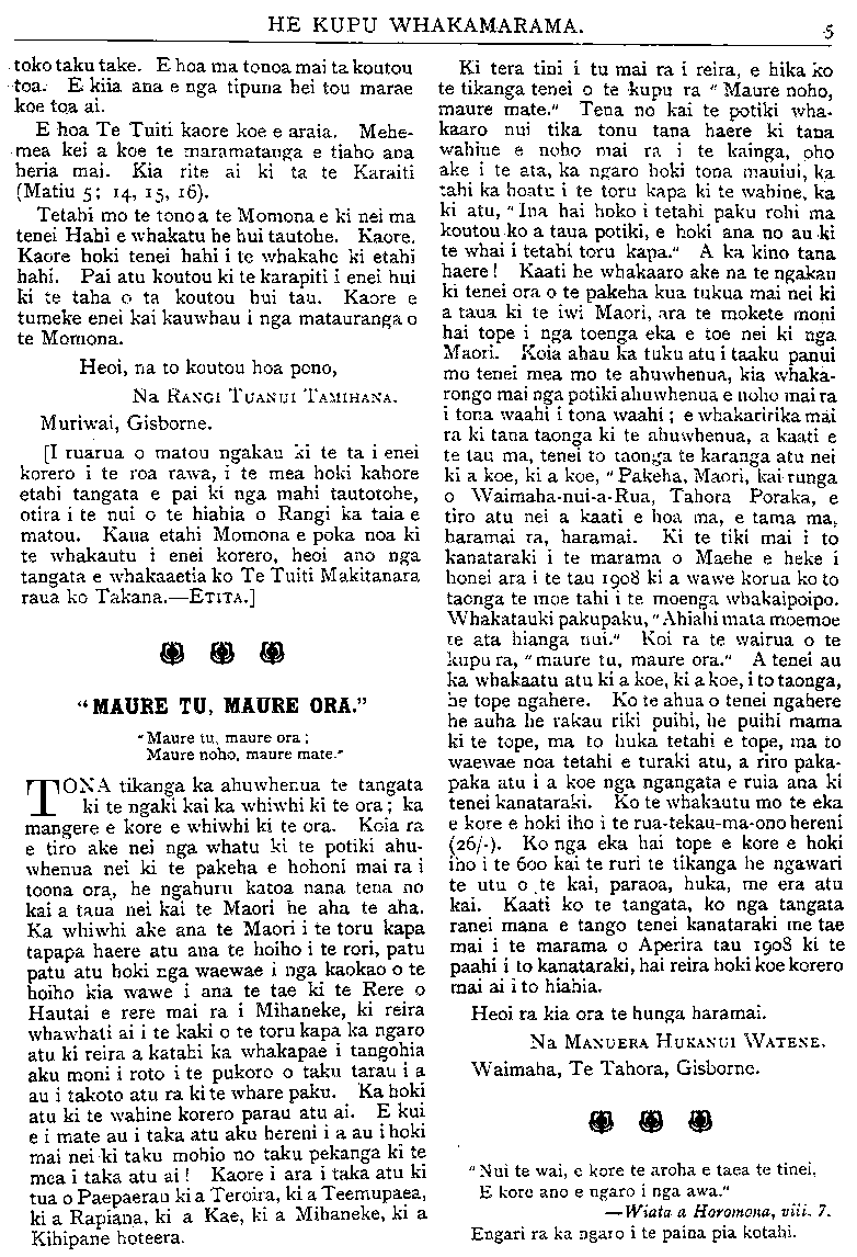 HE KUPU WHAKAMARAMA. •5 toko taku take. E hoa ma tonoa mai ta koutou •toa. E kiia ana e nga tipuna hei tou marae koe toa ai. E hoa Te Tuiti kaore koe e araia. Mehe- mea kei a koe te maramatanga e tiaho ana heria mai. Kia rite ai ki ta te Karaiti (Matiu 5; 14, 15, 16). Tetahi mo te tono a te Momona e ki nei ma tenei Hahi e whakatu he hui tautohe. Kaore. Kaore hoki tenei hahi i te whakahe ki etahi hahi. Pai atu koutou ki te karapiti i enei hui ki te taha o ta koutou hui tau. Kaore e tumeke enei kai kauwhau i nga matauranga o te Momona. Heoi, na to koutou hoa pono, Na RANGI TUANUI TAMIHANA. Muriwai, Gisborne. [I ruarua o matou ngakau ki te ta i enei korero i te roa rawa, i te mea hoki kahore etahi tangata e pai ki nga mahi tautotohe, otira i te nui o te hiahia o Rangi ka taia e matou. Kaua etahi Momona e poka noa ki te whakautu i enei korero, heoi ano nga tangata e whakaaetia ko Te Tuiti Makitanara raua ko Takana.—ETITA.] "MAURE TU, MAURE ORA." " Maure tu, maure ora Maure noho, maure mate." TONA tikanga ka ahuwhenua te tangata ki te ngaki kai ka whiwhi ki te ora ka mangere e kore e whiwhi ki te ora. Koia ra e tiro ake nei nga whatu ki te potiki ahu- whenua nei ki te pakeha e hohoni mai ra i toona ora, he ngahuru katoa nana tena no kai a taua nei kai te Maori he aha te aha. Ka whiwhi ake ana te Maori i te toru kapa tapapa haere atu ana te hoiho i te rori, patu patu atu hoki nga waewae i nga kaokao o te hoiho kia wawe i ana te tae ki te Rere o Hautai e rere mai ra i Mihaneke, ki reira whawhati ai i te kaki o te toru kapa ka ngaro atu ki reira a katahi ka whakapae i tangohia aku moni i roto i te pukoro o taku tarau i a au i takoto atu ra ki te whare paku. Ka hoki atu ki te wahine korero parau atu ai. E kui e i mate au i taka atu aku hereni i a au i hoki mai nei ki taku mohio no taku pekanga ki te mea i taka atu ai! Kaore i ara i taka atu ki tua o Paepaerau ki a Teroira, ki a Teemupaea, ki a Rapiana, ki a Kae, ki a Mihaneke, ki a Kihipane hoteera. Ki tera tini i tu mai ra i reira, e hika ko te tikanga tenei o te kupu ra " Maure noho, maure mate." Tena no kai te potiki wha- kaaro nui tika tonu tana haere ki tana wahine e noho mai ra i te kainga, oho ake i te ata, ka ngaro hoki tona mauiui, ka tahi ka hoatu i te toru kapa ki te wahine, ka ki atu, " Ina hai hoko i tetahi paku rohi ma koutou ko a taua potiki, e hoki ana no au ki te whai i tetahi toru kapa." A ka kino tana haere! Kaati he whakaaro ake na te ngakau ki tenei ora o te pakeha kua tukua mai nei ki a taua ki te iwi Maori, ara te mokete moni hai tope i nga toenga eka e toe nei ki nga Maori. Koia ahau ka tuku atu i taaku panui mo tenei mea mo te ahuwhenua, kia whaka- rongo mai nga potiki ahuwhenua e noho mai ra i tona waahi i tona waahi e whakaririka mai ra ki tana taonga ki te ahuwhenua, a kaati e te tau ma, tenei to taonga te karanga atu nei ki a koe, ki a koe, " Pakeha, Maori, kai runga o Waimaha-nui-a-Rua, Tahora Poraka, e tiro atu nei a kaati e hoa ma, e tama ma, haramai ra, haramai. Ki te tiki mai i to kanataraki i te marama o Maehe e heke i honei ara i te tau 1908 ki a wawe korua ko to taonga te moe tahi i te moenga whakaipoipo. Whakatauki pakupaku," Ahiahi mata moemoe te ata hianga nui." Koi ra te wairua o te kupu ra, " maure tu, maure ora." A tenei au ka whakaatu atu ki a koe, ki a koe, i to taonga, he tope ngahere. Ko te ahua o tenei ngahere he auha he rakau riki puihi, he puihi mama ki te tope, ma to huka tetahi e tope, ma to waewae noa tetahi e turaki atu, a riro paka- paka atu i a koe nga ngangata e ruia ana ki tenei kanataraki. Ko te whakautu mo te eka e kore e hoki iho i te rua-tekau-ma-ono hereni (26/-). Ko nga eka hai tope e kore e hoki iho i te 600 kai te ruri te tikanga he ngawari te utu o te kai, paraoa, huka, me era atu kai. Kaati ko te tangata, ko nga tangata ranei mana e tango tenei kanataraki me tae mai i te marama o Aperira tau 1908 ki te paahi i to kanataraki, hai reira hoki koe korero mai ai i to hiahia. Heoi ra kia ora te hunga haramai. Na MANUERA HUKANUI WATENE. Waimaha, Te Tahora, Gisborne. " Nui te wai, e kore te aroha e taea te tinei, E kore ano e ngaro i nga awa." —Wiata a Horomona, viii. 7. Engari ra ka ngaro i te paina pia kotahi.