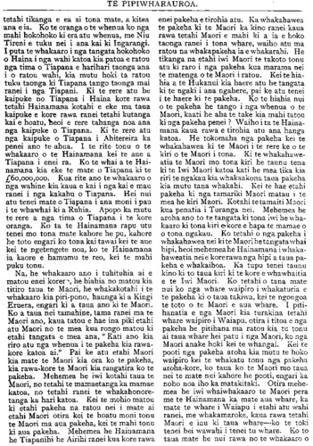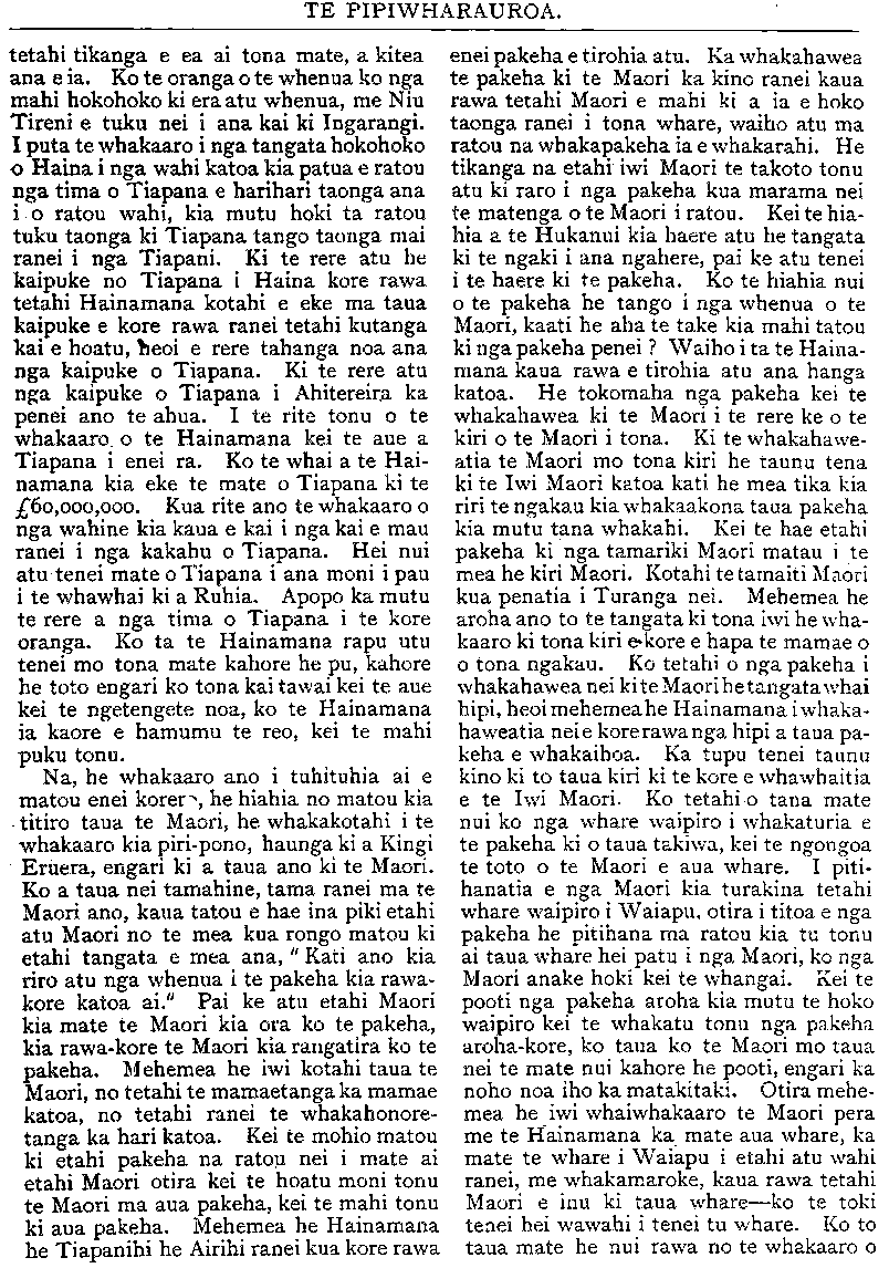 TE PIPIWHARAUROA. tetahi tikanga e ea ai tona mate, a kitea ana e ia. Ko te oranga o te whenua ko nga mahi hokohoko ki era atu whenua, me Niu Tireni e tuku nei i ana kai ki Ingarangi. I puta te whakaaro i nga tangata hokohoko o Haina i nga wahi katoa kia patua e ratou nga tima o Tiapana e harihari taonga ana io ratou wahi, kia mutu hoki ta ratou tuku taonga ki Tiapana tango taonga mai ranei i nga Tiapani. Ki te rere atu he kaipuke no Tiapana i Haina kore rawa tetahi Hainamana kotahi e eke ma taua kaipuke e kore rawa ranei tetahi kutanga kai e hoatu, heoi e rere tahanga noa ana nga kaipuke o Tiapana. Ki te rere atu nga kaipuke o Tiapana i Ahitereira ka penei ano te ahua. I te rite tonu o te whakaaro o te Hainamana kei te aue a Tiapana i enei ra. Ko te whai a te Hai- namana kia eke te mate o Tiapana ki te £60, 000, 000. Kua rite ano te whakaaro o nga wahine kia kaua e kai i nga kai e mau ranei i nga kakahu o Tiapana. Hei nui atu tenei mate o Tiapana i ana moni i pau i te whawhai ki a Ruhia. Apopo ka mutu te rere a nga tima o Tiapana i te kore oranga. Ko ta te Hainamana rapu utu tenei mo tona mate kahore he pu, kahore he toto engari ko tona kai tawai kei te aue kei te ngetengete noa, ko te Hainamana ia kaore e hamumu te reo, kei te mahi puku tonu. Na, he whakaaro ano i tuhituhia ai e matou enei korero, he hiahia no matou kia titiro taua te Maori, he whakakotahi i te whakaaro kia piri-pono, haunga ki a Kingi Eruera, engari ki a taua ano ki te Maori. Ko a taua nei tamahine, tama ranei ma te Maori ano, kaua tatou e hae ina piki etahi atu Maori no te mea kua rongo matou ki etahi tangata e mea ana, " Kati ano kia riro atu nga whenua i te pakeha kia rawa- kore katoa ai." Pai ke atu etahi Maori kia mate te Maori kia ora ko te pakeha, kia rawa-kore te Maori kia rangatira ko te pakeha. Mehemea he iwi kotahi taua te Maori, no tetahi te mamaetanga ka mamae katoa, no tetahi ranei te whakahonore- tanga ka hari katoa. Kei te mohio matou ki etahi pakeha na ratou nei i mate ai etahi Maori otira kei te hoatu moni tonu te Maori ma aua pakeha, kei te mahi tonu ki aua pakeha. Mehemea he Hainamana he Tiapanihi he Airihi ranei kua kore rawa enei pakeha e tirohia atu. Ka whakahawea te pakeha ki te Maori ka kino ranei kaua rawa tetahi Maori e mahi ki a ia e hoko taonga ranei i tona whare, waiho atu ma ratou na whakapakeha ia e whakarahi. He tikanga na etahi iwi Maori te takoto tonu atu ki raro i nga pakeha kua marama nei te matenga o te Maori i ratou. Kei te hia- hia a te Hukanui kia haere atu he tangata ki te ngaki i ana ngahere, pai ke atu tenei i te haere ki te pakeha. Ko te hiahia nui o te pakeha he tango i nga whenua o te Maori, kaati he aha te take kia mahi tatou ki nga pakeha penei? Waiho i ta te Haina- mana kaua rawa e tirohia atu ana hanga katoa. He tokomaha nga pakeha kei te whakahawea ki te Maori i te rere ke o te kiri o te Maori i tona. Ki te whakahawe- atia te Maori mo tona kin he taunu tena ki te Iwi Maori katoa kati he mea tika kia riri te ngakau kia whakaakona taua pakeha kia mutu tana whakahi. Kei te hae etahi pakeha ki nga tamariki Maori matau i, te mea he kiri Maori. Kotahi te tamaiti Maori kua penatia i Turanga nei. Mehemea he aroha ano to te tangata ki tona iwi he wha- kaaro ki tona kiri e kore e hapa te mamae o o tona ngakau. Ko tetahi o nga pakeha i whakahawea nei kite Maori he tangata whai hipi, heoi mehemea he Hainamana i whaka- haweatia nei e kore rawa nga hipi a taua pa- keha e whakaihoa. Ka tupu tenei taunu kino ki to taua kiri ki te kore e whawhaitia e te Iwi Maori. Ko tetahi o tana mate nui ko nga whare waipiro i whakaturia e te pakeha ki o taua takiwa, kei te ngongoa te toto o te Maori e aua whare. I piti- hanatia e nga Maori kia turakina tetahi whare waipiro i Waiapu, otira i titoa e nga pakeha he pitihana ma ratou kia tu tonu ai taua whare hei patu i nga Maori, ko nga Maori anake hoki kei te whangai. Kei te pooti nga pakeha aroha kia mutu te hoko waipiro kei te whakatu tonu nga pakeha aroha-kore, ko taua ko te Maori mo taua nei te mate nui kahore he pooti, engari ka noho noa iho ka matakitaki. Otira mehe- mea he iwi whaiwhakaaro te Maori pera me te Hainamana ka mate aua whare, ka mate te whare i Waiapu i etahi atu wahi ranei, me whakamaroke, kaua rawa tetahi Maori e inu ki taua whare—ko te toki tenei hei wawahi i tenei tu whare. Ko to taua mate he nui rawa no te whakaaro o