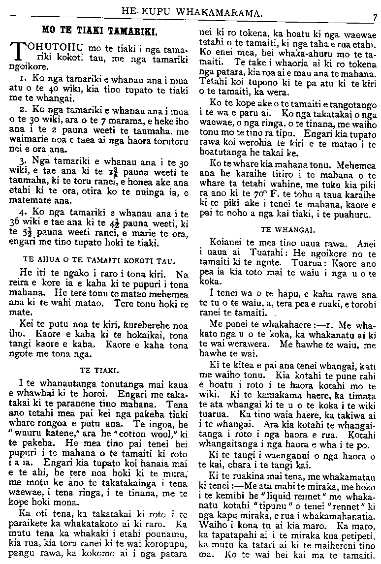 HE. KUPU WHAKAMARAMA. MO TE TIAKI TAMARIKI. TOHUTOHU mo te tiaki i nga tama- riki kokoti tau, me nga tamariki ngoikore. 1. Ko nga tamariki e whanau ana i mua atu o te 40 wiki, kia tino tupato te tiaki me te whangai. 2. Ko nga tamariki e whanau ana i mua o te 30 wiki, ara o te 7 marama, e heke iho ana i te 2 pauna weeti te taumaha, me waimarie noa e taea ai nga haora torutoru nei e ora ana. 3. Nga tamariki e whanau ana i te 30 wiki, e tae ana ki te 2¾| pauna weeti te taumaha, ki te toru ranei, e honea ake ana etahi ki te ora, otira ko te nuinga ia, e matemate ana. 4. Ko nga tamariki e whanau ana i te 36 wiki e tae ana ki te 4½ pauna weeti, ki te 5½ pauna weeti ranei, e marie te ora, engari me tino tupato hoki te tiaki. TE AHUA O TE TAMAITI KOKOTI TAU. He iti te ngako i raro i tona kiri. Na reira e kore ia e kaha ki te pupuri i tona mahana. He tere tonu te matao mehemea ana ki te wahi matao. Tere tonu hoki te mate. Kei te putu noa te kiri, kureherehe noa iho. Kaore e kaha ki te hokaikai, tona tangi kaore e kaha. Kaore e kaha tona ngote me tona nga. TE TIAKI. I te whanautanga tonutanga mai kaua e whawhai ki te horoi. Engari me taka- takai ki te paranene tino mahana. Tena ano tetahi mea pai kei nga pakeha tiaki whare rongoa e putu ana. Te ingoa, he " wuuru katene," ara he " cotton wool," ki te pakeha. He mea tino pai tenei hei pupuri i te mahana o te tamaiti ki roto i a ia. Engari kia tupato koi hanaia mai e te ahi, he tere noa hoki ki te mura, me motu ke ano te takatakainga i tena waewae, i tena ringa, i te tinana, me te kope hoki mona. Ka oti tena, ka takatakai ki roto i te paraikete ka whakatakoto ai ki raro. Ka mutu tena ka whakaki i etahi pounamu, kia rua, kia toru ranei ki te wai koropupu, pangu rawa, ka kokomo ai i nga patara nei ki ro tokena, ka hoatu ki nga waewae tetahi o te tamaiti, ki nga tahae rua etahi. Ko enei mea, hei whaka-ahuru mo te ta- maiti. Te take i whaoria ai ki ro tokena nga patara, kia roa ai e mau ana te mahana. Tetahi koi tupono ki te pa atu ki te kiri o te tamaiti, ka wera. Ko te kope ake o te tamaiti e tangotango i te wa e paru ai. Ko nga takatakai o nga waewae, o nga ringa, o te tinana, me waiho tonu mo te tino ra tipu. Engari kia tupato rawa koi werohia te kiri e te matao i te hoatutanga he takai ke. Ko te whare kia mahana tonu. Mehemea ana he karaihe titiro i te mahana o te whare ta tetahi wahine, me tuku kia piki ra ano ki te 70° F. te tohu a taua karaihe ki te piki ake i tenei te mahana, kaore e pai te noho a nga kai tiaki, i te puahuru. TE WHANGAI. Koianei te mea tino uaua rawa. Anei i uaua ai Tuatahi: He ngoikore no te tamaiti ki te ngote. Tuarua: Kaore ano pea ia kia toto mai te waiu i nga u o te koka. I tenei wa o te hapu, e kaha rawa ana te tu o te waiu, a, tera pea e ruaki, e torohi ranei te tamaiti. Me penei te whakahaere:—1. Me wha- kate nga u o te koka, ka whakanatu ai ki te wai werawera. Me hawhe te waiu, me hawhe te wai. Ki te kitea e pai ana tenei whangai, kati me waiho tonu. Kia kotahi te pune rahi e hoatu i roto i te haora kotahi mo te wiki. Ki te kamakama haere, ka timata te ata whangai ki te u o te koka i te wiki tuarua. Ka tino waia haere, ka takiwa ai i te whangai. Ara kia kotahi te whangai- tanga i roto i nga haora e rua. Kotahi whangaitanga i nga haora e wha i te po. Ki te tangi i waenganui o nga haora o te kai, ehara i te tangi kai. Ki te ruakina mai tena, me whakamatau ki tenei:—Me ata mahi te miraka, me hoko i te kemihi he " liquid rennet" me whaka- natu kotahi " tipunu " o tenei " rennet" ki nga kapu miraka, e rua i whakamahanatia. Waiho i kona tu ai kia maro. Ka maro, ka tapatapahi ai i te miraka kua petipeti, ka mutu ka tatari ai ki te maihereni tino ma. Ko te wai hei kai ma te tamaiti.