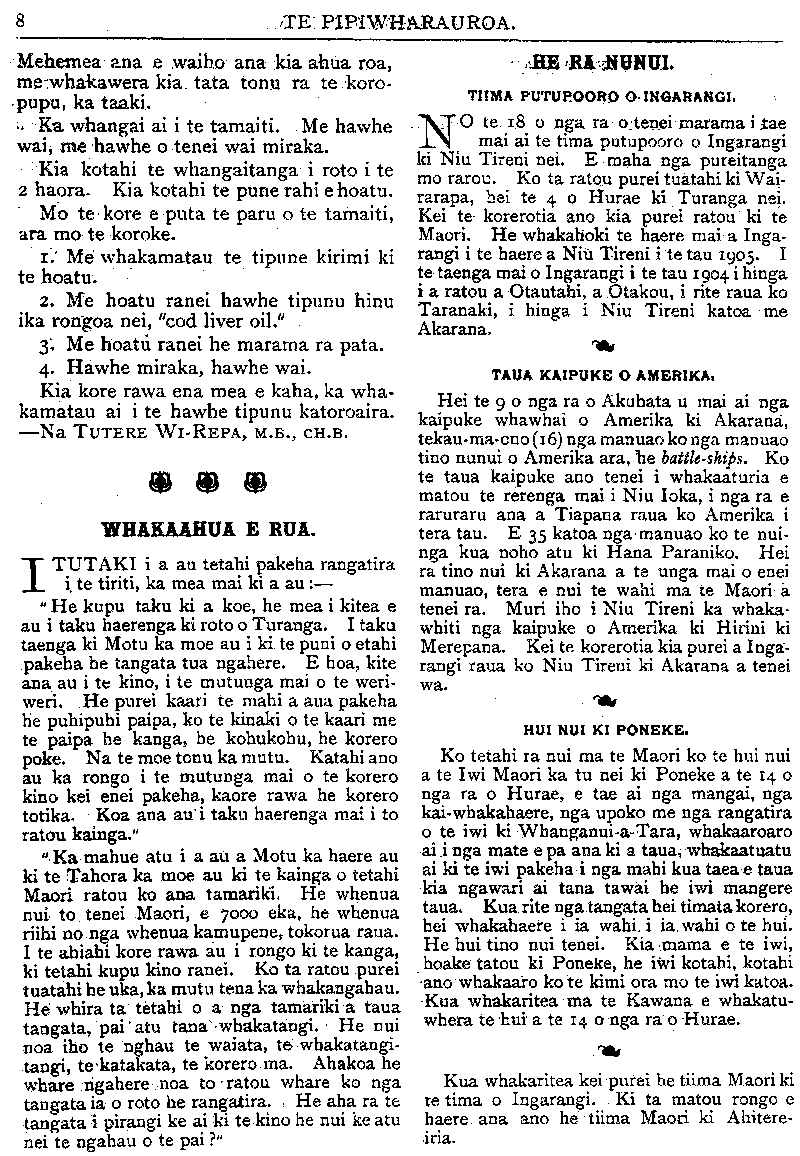 8 TE: PIPIWHARAUROA. Mehemea ana e waiho ana: kia ahua roa, me whakawera kia. tata tonu ra te koro- -pupu, ka taaki. Ka whangai ai i te tamaiti. Me hawhe wai, me hawhe o tenei wai miraka. Kia kotahi te whangaitanga i roto i te 2 haora. Kia kotahi te pune rahi e hoatu. Mo te kore e puta te paru o te tamaiti, ara mo te koroke. 1.' Me whakamatau te tipu ne kirimi ki te hoatu. 2. Me hoatu ranei hawhe tipunu hinu ika rongoa nei, "cod liver oil." 3. Me hoatu ranei he marama ra pata. 4. Hawhe miraka, hawhe wai. Kia kore rawa ena mea e kaha, ka wha- kamatau ai i te hawhe tipunu katoroaira. —Na TUTERE WI-REPA, M.B., CH.B. WHAKAAHUA E RUA. I TUTAKI i a au tetahi pakeha rangatira i. te tiriti, ka mea mai ki a au:— " He kupu taku ki a koe, he mea i kitea e au i taku haerenga ki roto o Turanga. I taku taenga ki Motu ka moe au i ki te puni o etahi pakeha he tangata tua ngahere. E hoa, kite ana au i te kino, i te mutunga mai o te weri- weri. He purei kaari te mahi a aua pakeha he puhipuhi paipa, ko te kinaki o te kaari me te paipa he kanga, he kohukohu, he korero poke. Na te moe tonu ka mutu. Katahi ano au ka rongo i te mutunga mai o te korero kino kei enei pakeha, kaore rawa he korero totika. Koa ana au i taku haerenga mai i to ratou kainga." "Ka mahue atu i a au a Motu ka haere au ki te Tahora ka moe au ki te kainga o tetahi Maori ratou ko ana tamariki. He whenua nui to tenei Maori, e 7000 eka, he whenua riihi no nga whenua kamupene, tokorua raua. I te ahiahi kore rawa au i rongo ki te kanga, ki tetahi kupu kino ranei. Ko ta ratou purei tuatahi he uka, ka mutu tena ka whakangahau. He whira ta tetahi o a nga tamariki a taua tangata, pai atu tana whakatangi. He nui noa iho te ngahau te waiata, te whakatangi- tangi, te katakata, te korero ma. Ahakoa he whare ngahere noa to Tatou whare ko nga tangata ia o roto he rangatira. He aha ra te : tangata i pirangi ke ai ki te kino he nui ke atu nei te ngahau o te pai?" , HE RA NUNUI. TIIMA PUTUROORO O INGARANGI. NO te. 18 o. nga ra o: tenei marama i tae mai ai te tima putupooro o Ingarangi ki Niu Tireni nei. E maha nga pureitanga mo rarou. Ko ta ratou purei tuatahi ki Wai- rarapa, hei te 4 o Hurae ki Turanga nei. Kei te korerotia ano kia purei ratou ki te Maori. He whakahoki te haere mai a Inga- rangi i te haere a Niu Tireni i te tau 1905 I te taenga mai o Ingarangi i te tau 1904 i hinga i a ratou a Otautahi, a Otakou, i rite raua ko Taranaki, i hinga i Niu Tireni katoa me Akarana. TAUA KAIPUKE O AMERIKA. Hei te 9 o nga ra o Akuhata u mai ai nga kaipuke whawhai o Amerika ki Akarana, tekau-ma-ono (16) nga manuao ko nga manuao tino nunui o Amerika ara, he battle-ships. Ko te taua kaipuke ano tenei i whakaaturia e matou te rerenga mai i Niu Ioka, i nga ra e raruraru ana a Tiapana raua ko Amerika i tera tau. E 35 katoa nga manuao ko te nui- nga kua noho atu ki Hana Paraniko. Hei ra tino nui ki Akarana a te unga mai o enei manuao, tera e nui te wahi ma te Maori a tenei ra. Muri iho i Niu Tireni ka whaka- whiti nga kaipuke o Amerika ki Hirini ki Merepana. Kei te korerotia kia purei a Inga- rangi raua ko Niu Tireni ki Akarana a tenei wa. HUI NUI KI PONEKE. Ko tetahi ra nui ma te Maori ko te hui nui a te Iwi Maori ka tu nei ki Poneke a te 14 o nga ra o Hurae, e tae ai nga mangai, nga kai-whakahaere, nga upoko me nga rangatira o te iwi ki Whanganui-a-Tara, whakaaroaro ai i nga mate e pa ana ki a taua, whakaatuatu ai ki te iwi pakeha i nga mahi kua taea e taua kia ngawari ai tana tawai he iwi mangere taua. Kua rite nga tangata hei timata korero, hei whakahaere i ia wahi. i ia wahi o te hui. He hui tino nui tenei. Kia mama e te iwi, hoake tatou ki Poneke, he iwi kotahi, kotahi •ano whakaaro kote kimi ora mo te iwi katoa. •Kua whakaritea ma te Kawana e whakatu- whera te hui a te 14 o nga ra o Hurae. Kua whakaritea kei purei he tiima Maori ki te tima o Ingarangi. Ki ta matou rongo e haere. ana ano he tiima Maori ki Ahitere- iria.
