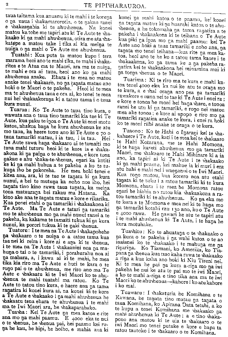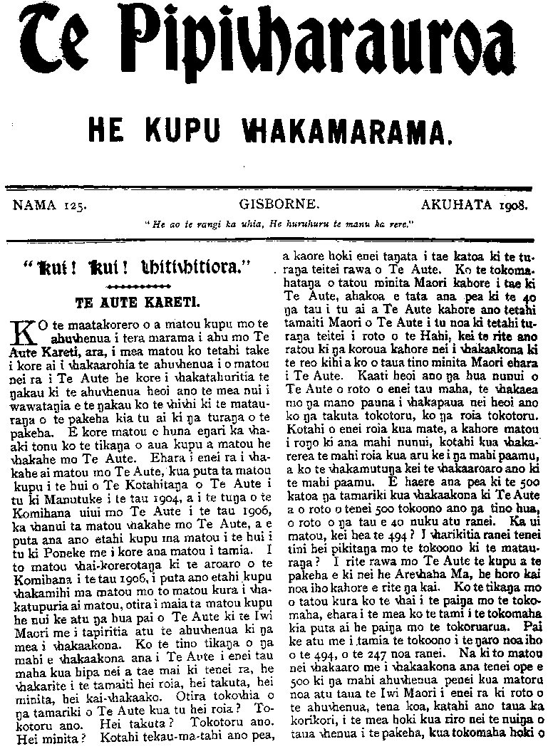 Te Pipiwharauroa HE KUPU WHAKAMARAMA. NAMA 125. GISBORNE. AKUHATA 1908. " He ao te rangi ka uhia. He huruhuru te manu ka rere." kui! lull! Whitiwhitiora." TE AUTE KARETI. KO te maatakorero o a matou kupu mo te ahuwhenua i tera marama i ahu mo Te Aute Kareti, ara, i mea matou ko tetahi take i kore ai i whakaarohia te ahuwhenua i o matou nei ra i Te Aute he kore i whakatahuritia te ngakau ki te ahuwhenua heoi ano te mea nui i wawatangia e te ngakau ko te whiwhi ki te matau- ranga o te pakeha kia tu ai ki nga turanga o te pakeha. E kore matou e huna engari ka wha- aki tonu ko te tikanga o aua kupu a matou he whakahe mo Te Aute. Ehara i enei ra i wha- kahe ai matou mo Te Aute, kua puta ta matou kupu i te hui o Te Kotahitanga o Te Aute i tu ki Manutuke i te tau 1904 a i te tunga o te Komihana uiui mo Te Aute i te tau 1906, ka whanui ta matou whakahe mo Te Aute, a e puta ana ano etahi kupu ma matou i te hui i tu ki Poneke me i kore ana matou i tamia. I to matou whai-korerotanga ki te aroaro o te Komihana i te tau 1906, i puta ano etahi kupu whakamihi ma matou mo to matou kura i wha- katupuria ai matou, otira i maia ta matou kupu he nui ke atu nga hua pai o Te Aute ki te Iwi Maori me i tapiritia atu te ahuwhenua ki nga mea i whakaakona. Ko te tino tikanga o nga mahi e whakaakona ana i Te Arte i enei tau maha kua hipa nei a tae mai ki tenei ra, he whakarite i te tamaiti hei roia, hei takuta, hei minita, hei kai-whakaako. Otira tokowhia o nga tamariki o Te Aute kua tu hei roia? To- kotoru ano. Hei takuta? Tokotoru ano. Hei minita? Kotahi tekau-ma-tahi ano pea, a kaore hoki enei tangata i tae katoa ki te tu- ranga teitei rawa o Te Aute. Ko te tokoma- hatanga o tatou minita Maori kahore i tae ki Te Aute, ahakoa e tata ana pea ki te 40 nga tau i tu ai a Te Aute kahore ano tetahi tamaiti Maori o Te Aute i tu noa ki tetahi tu- ranga teitei i roto o te Hahi, kei te rite ano ratou ki nga koroua kahore nei i whakaakona ki te reo kihi a ko o taua tino minita Maori ehara i Te Aute. Kaati heoi ano nga hua nunui o Te Aute o roto o enei tau maha, te whakaea mo nga mano pauna i whakapaua nei heoi ano ko nga takuta tokotoru, ko nga roia tokotoru. Kotahi o enei roia kua mate, a kahore matou i rongo ki ana mahi nunui, kotahi kua whaka- rerea te mahi roia kua aru ke i nga mahi paamu, a ko te whakamutunga kei te whakaaroaro ano ki te mahi paamu. E haere ana pea ki te 500 katoa nga tamariki kua whakaakona ki Te Aute a o roto o tenei 500 tokoono ano nga tino hua, o roto o nga tau e 40 nuku atu ranei. Ka ui matou, kei hea te 494 ? I wharikitia ranei tenei tini hei pikitanga mo te tokoono ki te matau- ranga? I rite rawa mo Te Aute te kupu a te pakeha e ki nei he Arewhaha Ma, he horo kai noa iho kahore e rite nga kai. Ko te tikanga mo o tatou kura ko te whai i te paina mo te toko maha, ehara i te mea ko te tami i te tokomaha kia puta ai he painga mo te tokoruarua. Pai ke atu me i tamia te tokoono i te ngaro noaiho o te 494 o te 47 noa ranei. Na ki to matou nei whakaaro me i whakaakona ana tenei ope e 500 ki nga mahi ahuwhenua penei kua matoru noa atu taua te Iwi Maori i enei ra ki roto o te ahuwhenua, tena koa, katahi ano taua ka korikori, i te mea hoki kua riro nei te nuinga o taua whenua i te pakeha, kua tokomaha hold o