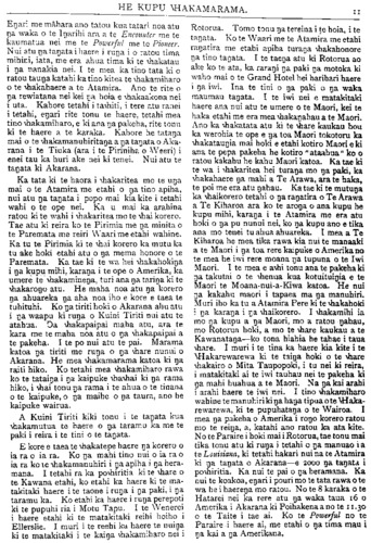 HE KUPU WHAKAMARAMA, u Engeri me m;ihara ano tatou kua tatari noa atu nga waka o te Ingarihi ara a te Enconntcr me te kaumatua nei me te Powcrfiil me te Pioncer. Nui atu nga tangata i haere i runga i o ratou tima mihini, tata, me era ahua tima ki te whakatau i nga nanakia nei. I te mea ka tino tata ki o ratou taunga katahi ka tino kitea te whakamiharo o te whakahaere a te Atamira. Ano te rite o nga rewiatana nei kei nga hoia e whakaakona nei i uta. Kahore tetahi i tawhiti, i tere atu ranei i tetahi, engari rite tonu te haere, tetahi mea tino whakamiharo, e ki ana nga pakeha, rite tonu ki te haere a te karaka. Kahore he tatanga mai o te whakamanuhiritanga a nga tangata o Aka- rana i te Tiuka (ara i te Piriniha o Weeri) i enei tau ka huri ake nei ki tenei. Nui atu te tangata ki Akarana. Ka tata ki te haora i whakaritea mo te unga mai o te Atamira me etahi o nga tino apiha, nui atu nga tangata i popo mai kia kite i tetahi wahi o te ope nei. Ka u mai ka arahina ratou ki te wahi i whakaritea mo te whai korero. Tae atu ki reira ko te Pirimia me nga minita o te Paremata me reiri Waari me etahi wahine. Ka tu te Pirimia ki te whai korero ka mutu ka tu ake hoki etahi atu o nga mema honore o te Paremata. Ka tae ki te wa hei whakahokinga i nga kupu mihi, karanga i te ope o Amerika, ka umere te whakaminenga, turi ana nga taringa ki te whakaronge atu. He maha noa atu nga korero nga ahuareka nga aha noa iho e kore e taea te tuhituhi. Ko nga tiriti hoki o Akarana ahu atu i nga waapu ki runga o Kuini Tiriti nui atu te atahua. Oa whakapaipai maha atu, ara te kara me te maha noa atu o nga whakapaipai a te pakeha. I te po nui atu te pai. Marama katoa nga tiriti me runga o nga whare nunui o Akarana. He mea whakamarama katoa ki nga raiti hiko. Ko tetahi mea whakamiharo rawa ko te tatainga i nga kaipuke whawhai ki nga rama hiko, i whai tonu nga rama i te ahua o te tinana o te kaipuke, o nga maihe o nga taura, ano he kaipuke wairua. A Kuini Tiriti kiki tonu i te tangata kua whakamutua te haere o nga taramu ka me te paki i reira i te tini o te tangata. E kore e taea te whakatepe haere nga korero o ia ra o ia ra. Ko nga mahi tino nui o ia ra o ia ra ko te whakamanuhiri i nga apiha i nga hera- mana. I tetahi ra ka powhiritia ki te whare o te- Kawana etahi, ko etahi ka haere ki te ma- takitaki haere i te taone i runga i nga paki, i nga taramu ka. Ko etahi ka haere i runga perepoti ki te pupuhi ria i Motu Tapu. I te Wenerei i haere etahi ki te matakitaki reihi hoiho i Ellerslie. I muri i te reehi ka haere te nuinga ki te matakitaki i te kainga whakamiharo nei i Rotorua. Tomo tonu nga tereina i te hoia, i te tangata. Ko te Waari me te Atamira me etahi rar!at!ra me etahi apiha turanga whakahonore nga tino tangata. I te taenga atu ki Rotorua ao ake ko te ata, ka rarangi nga paki nga motoka ki waho mai o te Grand Hotel hei harihari haere i nga iwi. Ina te tini o nga paki o nga waka maumau tangata. I te iwi nei e matakitaki haere ana nui atu te umere o te Maori, kei te haka etahi me era mea whakangahau a te Maori. Ano ka whakatata atu ki te whare kaukau hou ka werohia te ope e nga toa Maori tokotoru ka whakataungia mai hoki e etahi kotiro Maori e ki ana te pepa pakeha he kotiro " ataahua " ko o ratou kakahu he kahu Maori katoa. Ka tae ki te wa i whakaritea hei turanga rno nga paki, ka whakahakre nga mahi a Te Arawa, ara te haka, te poi me era atu ngahau. Ka tae ki te mutunga ka whaikorero tetahi o nga rangatira o Te Arawa a Te Kiharoa ara ko te aronga o ana kupu he kupu mihi, karanga i te Atamira me era atu hoki o nga pu nunui nei, ko nga kupu ano e tika ana mo tenei tu ahua ahuareka. I mea a Te Kiharoa he mea tika rawa kia nui te manaaki a te Maori i nga toa rere kaipuke oAmerikano te mea he iwi rere moana nga tupuna o te Iwi Maori. I te mea e awhi tonu ana te pakeha ki nga takutai o te whenua kua kotuituingia e te Maori te Moana-nui-a-Kiwa katoa. He nui nga kakahu maori i tapaea ma nga manuhiri. Muri iho ka tu a Atamira Pere ki te whakahoki i nga karanga i nga whaikorero. I whakamihi ia mo nga kupu a nga Maori, rno a ratou ngahau, mo Rotorua hoki, a mo te whare kaukau a te Kawanatanga—ko tona hiahia he tahae i taua whare. I muri i te tina ka haere kia kite i te WHakarewarew^a ki te tainga hoki o te whare whakairo o Mita Taupopoki, i tu nei ki reira, i matakitaki ai te iwi tauhau nei te pakeha ki nga mahi huahua a te Maori. Na nga kai arahi i arahi haere te iwi nei. I tino whakamiharo wahine te manuhiri ki nga hanga tipua o te WHaka- rewarewa, ki te pupuhatanga o te Wairoa. I mea nga pakeha o Amerika i rongo korero ratou mo te reinga, a, katahi ano ratou ka ata kite. No te Paraire i hoki mai i Rotorua, tae tonu mai tika tonu atu ki runga i tetahi o nga manuao i a te Louisiana, ki tetahi hakari nui na te Atamira ki nga tangata o Akarana—e 2000 nga tangata i powhirltia. Ka nui te pai o nga heramana. Ka nui te koakoa, engari i pouri rno te tata rawa o te wa he i haerenga rno ratou. No te 8 karaka o te Hatarei nei ka rere atu nga waka taua 16 o Amerika i Akarana ki Poihakena a no te 11.30 o te Taite i tae ai. Ko te Powerful no te Paraire i haere ai, me etahi o nga tima mau i nga kai a nga Amerikana.