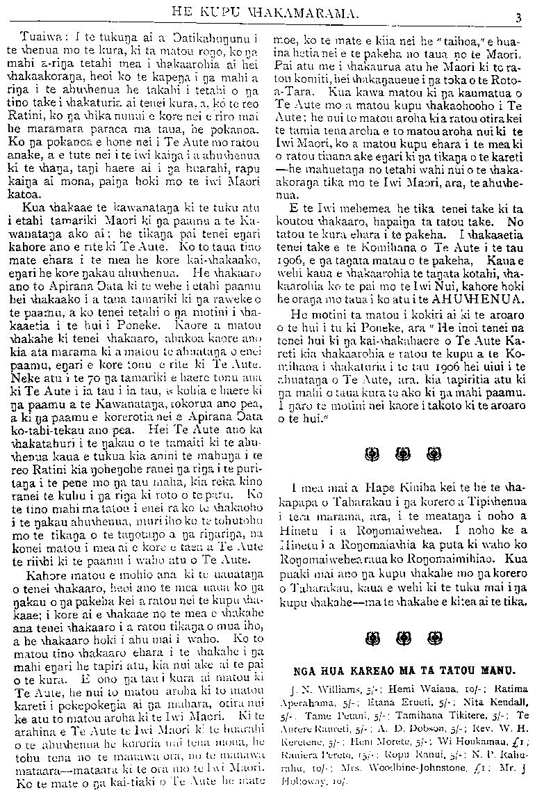 HE KUPU WHAKAMARAMA. 3 Tuaiwa: I te tukunga ai a Ngatikahungunu i moe, ko te mate e kiia nei he " taihoa," e hua- te whenua mo te kura, kua ta matou rono, kona inahetianei e te pakeha no taua no te Maori. mahi a-ringa tetahi mea i whakaaiohia ai hei Pai atu me i whakaurka atu he Maori ki tora- whakaakoranga, heoi ko te kapena i na mahi a tou komiti, hei whakanaueue i na toka o te Roto- ringa i te ahuwhenua he takahi i tetahi o na a-Tara. Kua kawa matou ki na kaumatua o tmo\_take i whakatuma ai tenei kura, a, ko te reo Te Aute mo a matou kupu whakaohooho i Te Ratim, ko nga whika nunui e kore nei e riro mai Aute; he nui to matou aroha kia ratou otirakei he maramara paraoa ma taua, he pokanoa, te tamia tena aroha e to matou aroha nui ki te Ko nga pokanoa e hone nei i Te Aute mo ratou Iwi Maori, ko a matou kupu ehara i te mea ki anake, a e tute nei i te iwi kaina i a ahuwhenua o ratou tinana ake engari ki nga tikanga o te kareti ki te whanga, tangi haere ai \\ na huai-ahi, rapu —he mahuetanga no tetahi wahi nui o te whaka- kainga ai mona, paina hoki mo te i\\vi Maori akoranga tika mo te Iwi Maori, ara, te anuvhe- katoa, nua. Kua whakaae te kawanatanga ki te tuku atu E te Iwi mehemea he tika tenei take ki ta i etahi tamariki Maori ki na paamu a te Ka- koutou whakaaro, hapainga ta tatou take. No wanatanga ako ai; he tikana pai tenei enari tatou te kura ehara i te pakeha. I whakaaetia kahore ano e rite ki Te Aute. Ko to taua tino tenei take e te Komihana o Te Aute i te tau mate ehara i te mea he kore kai-whakaako, 1906, e nga tangata matau o te pakeha, Kauae engari he kore ngakau ahuwhenua. He whakaaru wehi kaua e whakaaiohia te tangata kotahi, wha- ano to Apirana Oata ki te wehe i etahi paamu kaarohia ko te pai mo te Iwi Nui, kahore hoki hei whakaako i a taua tainariki ki nga raweke o he orana rno taua i ko atu i te AHUWHENUA. te paamu, a ko tenei tetahi o nga motini i wha- He motini ta matou i kokiri ai ki te aroaro kaaetia i te hui i Poneke. Kaore a matou o te hui i tu ki Poneke, ara " He inoi tenei na whakahe ki tenei whakaaro, ahakoa kaore ano tenei hui ki nga kai-whakahaere o Te Aute Ka- kia ata marama Id a matou te ahuatana o enei reti kia whakaaiohia e ratou te kupu a te Ko- paamu, engari e kore tonu e rite ki Te Aute. mihana i whakanuria i te tau 1906 hei uiui i te Neke atu i te 70 nga tamariki e liaere tonu an;i ahuatana o Te Aute, ara. kia tapiritia atu ki ki Te Aute i ia tau i ia tau, is kohia e haere ki na mahi o taua kura te ako ki nga mahi paamu. nga paamu a te Kawanatanga, ^korua ano pea, i naro te motini nei kaore i takoto ki te aroaro a ki nga paamu e korerotia nei e Apirana Oata o te hui." ko-tahi-tekau ano pea. Hei Te Aute ano ka whakatahur^ i te ngakau o te tamaiti ki te ahu- whenua kaua e tukua kia anini te mahunga i te ^ ^ ^ reo Ratini kia ngohengohe ranei nga ringa i te puri- tanga i te pene mo nga tau inaha, kia reka kino ^ ^ ^ ^ ... ^^ ^ ^ ^ ^ ^ ranei te kuhu i na rina ki reto o te paru. Ko - . ,„. . te tino mahi ma tatou i enei ra ko te whakaoho ^P^1 0 1 ^^akau i nga korero a 1 ipiwhenua i te ngakau ahuwhenua, muri iho ko te tohutohu i hra maraina, ara, i te meatanga i noho a mo te tikanga o te tangotango a nga rinarina, na Hinetu i a RoT]omaiwehea. I noho ke a konei matou i mea at"e kore u taea a Te Aute IIinetu i a Ronomaiawhia ka puta ki waho ko te riiwhi ki te paamu i waho atu o Te Aute. Ror)omai\\vehearauako Rongomaimihiao. Kua Kahore matou e mohio ana ki te uauatanga puaki mai ano nga kupu whaka!io mo nga korero o tenei whakaaro, heoi ano te mea uaua ko IJB o Taharakau, kaua e wehi ki te tuku mai inga ngakau o nga pakeha kei a ratou nei te kupu wha- apu whakahe—ma te whakahe e kitea ai te tika. kaae; i kore ai e whakaae no te mea e whakahe ana tenei whakaaro i a ratou tikanga o mua^ iho, a he whakaaro hoki i ahu mai i waho. Ko to ^ ^ ^ matou tino whakaaro ehara i te whaka!io i na mahi engari he tapiri atu, kia nui ake ai te pai ^ ^^ KAREAO MA TA TATOU MANU. o te kura. L ono nga tau i kura ai matou ki Te Aute, he nui to matou aruha ki tu matou J. N. Williams, 5;'-; Hemi Waiaua, io/-; Ratima kareti i pokepokengia ai nga niahai-a, otit-anui Apt;rahama, 5/-; Etana Eructi, 5/-; Nita Kendall, ke atu to matou aruha ki te Iwi Maori. Kite 5/-; Tame Pctani, 5/-; Tamihana Tikitere, 5/-; Te arahina e Te Aute te Iwi Mauri ki te Iniara!ii Alircre K;uiri-'ti, 5/-; A. D. Dobson, 5/-; Kev. W. H. O te ahuwhenua he koruricl nui tena mona, lie KcrulcuL:, 5/-; Heni M'orete, 5/-; Wi Houkamau, ai ; tohu tena no te manawa ora, HU te ni;ui;iw;i Raniura rkreto, ra;'-; Kopu K;inui, 5/-; N. 1'. Rahu- mataara\_mataara ki te ora ino te l\\\\i M;un-i. rahu, io/-; Mrs. Woo'.lbine-Johnstone, ai: -Mr. J Ko te mate o na kai-tiaki o Te Aute lie mate Hullowny, iu/