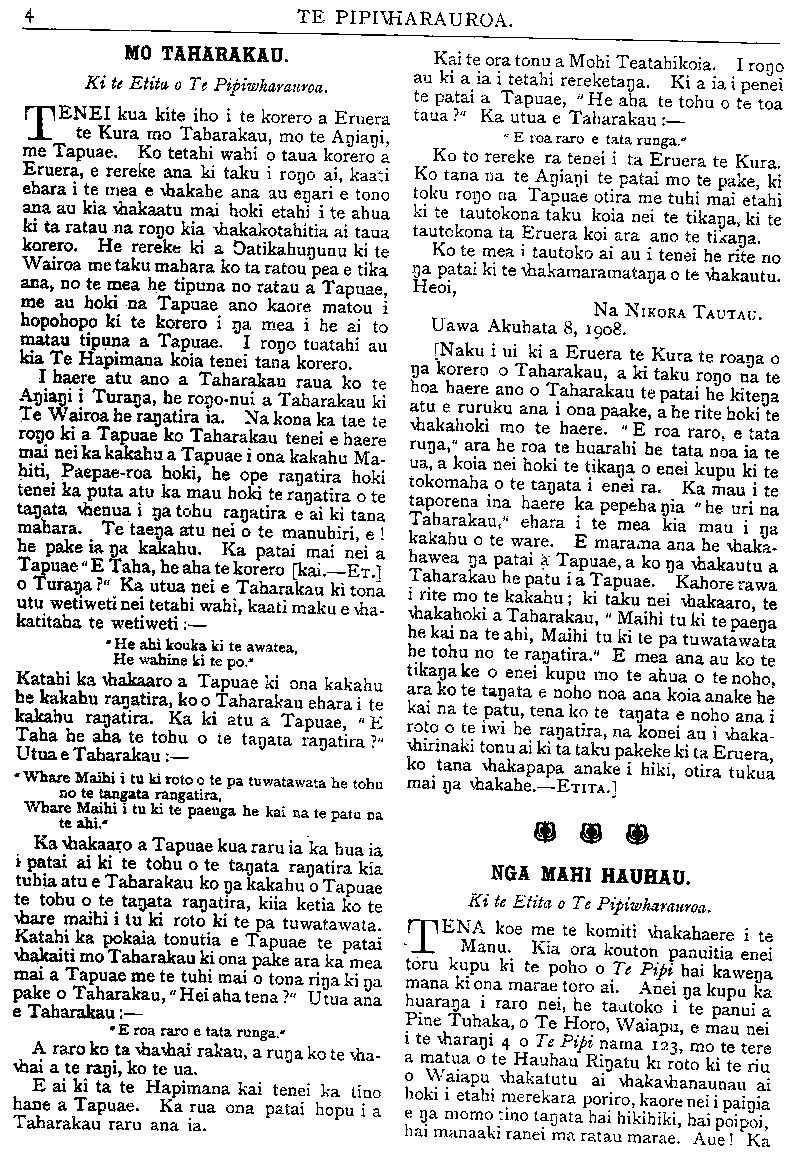 4 TE PIPIWHARAUROA. MO TATARAKAU. Ki te Etita o Te Pipiwtia,ranroa. TENEI kua kite iho i te korero a Eruera te Kura mo Taharakau, rno te Angiangi, me Tapuae. Ko tetahi wahi o taua korero a Eruera, e rereke ana ki taku i rongo ai, kaati ehara i te mea e whakahe ana au engari e tono ana au kia whakaatu mai hoki etahi i te ahua ki ta ratau na rongo kia whakakotahitia ai taua korero. He rereke ki a Oatikahungunu ki te Wairoa me taku mahara ko ta ratou pea e tika ana, no te mea he tipuna no ratau a Tapuae, me au hoki na Tapuae ano kaore matou i hopohopo ki te korero i nga mea i he ai to matau tipuna a Tapuae. I rongo tuatahi au kia Te Hapimana koia tenei tana korero. I baere atu ano a Taharakau raua ko te Angiangi i Turana, he rongo-nui a Taharakau ki Te Wairoa he ranatira ia. Na kona ka tae te rono ki a Tapuae ko Taharakau tenei e haere mai nei ka kakahu a Tapuae i ona kakahu Ma- hiti, Paepae-roa hoki, he ope rangatira hoki tenei ka puta atu ka mau hoki te rangatira o te tangata whenua i nga tohu rangatira e ai ki tana mahara. Te taenga atu nei o te manuhiri, e ! he pake ia nga kakahu. Ka patai mai nei a Tapuae " E Taha, he aha te korero [kai.—ET.] o Turana !" Ka utua nei e Taharakau ki tona utu wetiweti nei tetahi wahi, kaati maku e wha- katataha te wetiweti;— * He ahi kouka ki te awatea, He wahine ki te po." Katahi ka whakaaro a Tapuae ki ona kakahu he kakahu ranatira, ko o Taharakau ehara i te kakahu rangatira. Ka ki atu a Tapuae, " E Taha he aha te tohu o te tangata rangatira ?" Utua e Taharakau:— • Whare Maihi i tu ki roto o te pa tuwatawata he tohu no te tangata rangatira, Whare Maihi i tu ki te paenga he kai na te patu na te ahi* Ka •vhakaaro a Tapuae kua raru ia ka hua ia i patai ai ki te tohu o te tangata rangatira kia tuhia atu e Taharakau ko nga kakahu o Tapuae te tohu o te tanata ranatira, kiia ketia ko te \\hare maihi i tu ki reto ki te pa tuwatawata. Katahi ka pokaia tonutia e Tapuae te patai •whakaiti mo Taharakau ki ona pake ara ka mea mai a Tapuae me te tuhi mai o tona ringa ki nga pake o Taharakau," Hei aha tena ?" Utua ana e Taharakau;— " E roa raro e tata runga." A raro ko ta whawhai rakau, a runga ko te wha- whai a te rani, ko te ua. E ai ki ta te Hapimana kai tenei ka tino hane a Tapuae. Ka rua ona patai hopu i a Taharakau raru ana ia. Kai te ora tonu a Mohi Teatahikoia. I rongo au ki a ia i tetahi rhreketanga. Ki a ia i penei te patai a Tapuae, "He aha te tohu o te toa taua ?" Ka utua e Taharakau :— " E roa raro e tata runga." Ko to rereke ra tenei i ta Eruera te Kura. Ko tana na te Angiangi te patai mo te pake, ki toku rongo na Tapuae otira me tuhi mai etahi ki te tautokona taku koia nei te tikanga, ki te tautokona ta Eruera koi ara ano te tikanga. Ko te mea i tautoko ai au i tenei he rite no nga patai ki te whakamaramatanga o te whakautu. Heoi, Na NIKORA TAUTAU. Uawa Akuhata 8, 1908. [Naku i ui ki a Eruera te Kura te roanga o nga korero o Taharakau, a ki taku rongo na te hoa haere ano o Taharakau te patai he kitenga atu e ruruku ana i ona paake, a he rite hoki te whakahoki mo te haere. " E roa raro, e tata runga," ara he roa te huarahi he tata noa ia te ua, a koia nei hoki te tikanga o enei kupu ki te tokomaha o te tangata i enei ra. Ka mau i te taporena ina haere ka pepeha ngia " he uri na Taharakau," ehara i te mea kia mau i nga kakahu o te ware. E marama ana he whaka- hawea nga patai a' Tapuae, a ko nga whakautu a Taharakau he patu i a Tapuae. Kahore rawa i rite mo te kakahu; ki taku nei whakaaro, te whakahoki a Taharakau, " Maihi tu ki te paenga he kai na te ahi, Maihi tu ki te pa tuwatawata he tohu no te rangatira." E mea ana au ko te tikanga ke o enei kupu mo te ahua o te noho, ara ko te tangata e noho noa ana koia anake he kai na te patu, tena ko te tangata e noho ana i roto o te iwi he rangatira, na konei au i whaka- whirinaki tonu ai ki ta taku pakeke ki ta Eruera, ko tana whakapapa anake i hiki, otira tukua mai nga whakahe.—ETITA.] NGA MAHI HAUHAU. Ki te Etita o Te Pipiwharauroa. mENA koe me te komiti whakahakre i te -\_!\_ Manu. Kia ora kouton panuitia enei toru kupu ki te poho o Te Pipi hai kawenga mana ki ona marae toro ai. Anei nga kupu ka huaranga i raro nei, he tautoko i te panui a Pine Tuhaka, o Te Horo, Waiapu, e mau nei i te wharangi 4 o Te Pipi nama 123, mo te tere a matua o te Hauhau Ringatu ki roto ki te ri u o Waiapu whakatutu ai whakawhanaunau ai hoki i etahi merekara poriro, kaore nei i paingia e nga momo tino tangata hai hikihiki, hai poipoi, hai manaaki ranei ma ratau marae. Aue ! Ka
