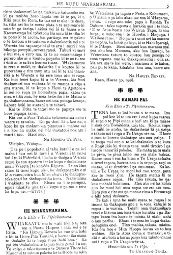HE KUPU WHAKAMARAMA. titiro whakamuri ke na mahara o katuarehe ma ki nga taniwha horo tanata nei ki te po, ki a Riki raua ko Rura, ka tau nei te ake i te whare, ka titia nei ko te neera piata o te rangimarie ki roto ki nga taringa i akina nei ki te hama e te he Weteriana nga tangata o Peria, o Kohumaru, o Waiaua o nga taha akau tae noa ki Whangaroa, 1 mua. I rono ano taku papa a Renata Te Ngahuru i taku tupuna e karakia ana i te inoi, E te Atua hoatu tou Wairua Tapu, ki tou Kawanatanga hai tohutohu kia mau ki te tika ki huna, e noho ana i te Horeke, i Mangungu, i te pono ki te aroha, hai puritanga ma te ngakau o te koroua o te taitama e whakoekoetia nei e te Wereta kia rangarangaihi ai te aru i muri i ona hikoinga poropiti, rewera ranei. Tahuri ki muri e kui ma, e koro ma, ki te ao maramatanga i purero ake ai o koutou pongaihu ki te ao tu roa i whiti ai te ra ki o koutou tuara. Whakamutua te rere o maki, te whakarite i a koutou ki te purerehua e tiro tonu atu nei ki te ahi whana- riki a te Wereta e ka rere tonu atu ki runa. Ka inoi tenei kupu ki a te Wereta, kia huri whakamuri ona mahara ki te maunga a ringa a ona matua, ki te kupu a Hemi te Apotoro e ki nei no runga nga homaitanga a papai katoa na mea e tika ana, he mea heke iho i te Matua o nga whakamarama, kaore nei ona putanga ketanga, kahore hoki he atarangi o te tahuri. Kai te Etita te tatari mo te papapa mo te kore papapa ranei. Kia ora a Pine Tuhaka te kau matua nana i waere te tawaha. Ko na whati ki a koe na, e koro ko nga mokamoka pitautau i mahue nei i a koe na maku nei hai whakatohi noa atu i muri i tau. Heoi ano. Na HOHEPA TE PIRI. Waipiro, Waiapu. [I te po i popoketia ai taku kotahi e na iwi maha i tau nei ki raro i a Wereta i ta ratou Waihou ranei. " No nga ra i muri ne.i ka marara na hepara, ka kotiti nga hipi, ki te Hahi Ingarangi, ki te Pikopo. Heoi inaianei kua marama mai pea aku hoa Momona, aku hoa Ingarangi, he Weteriana tuturu to koutou hoa pononga no tona tupuna mai ka whakapumautia i ona ra, kia ora mo te kai wero, i marama ai te katoa, pau pu te kaha, kihakiha kau ana, haere atu ana. Na HAPETA RENATA. Kaeo, Hurae 30, 1908. HE HAMARI PAI. Ki te Etita o Te Pipiwharauroa. TENA koe, te kai hautu o te manu. Ina pai koe ki te uta atu i enei kupu ruarua ki runga o te Pipi mana e. hari atu ki nga marae huhua o te Tominiona, taia atu. Ko aua kupu he mihi he aroha, he whakawhetai ki nga painga e takoto nei i runga o Te Uranga-ote-ra. E kore e taea te korero whakatepe atu aua painga. I te taenga mai ano o te kai-whakaako o te kura o Rangitukia ka timata tana mahi tirotiro i nga turoro tamariki pakeke. He maha nga tu mate he piwa, he piwa taipo me era mate huhua. hui i tu ki Pakirikiri, i kaha a te whaina a Wereta Kaore tonu i roa ka kitea e Te Uranga te kaha ratou ko ana apotoro i taku kupu e whakahaere ana a Wereta i te karakia Ringatu. I tino kino ratou ki tenei kupu aku, he whakapaeteka e ai ki a ratou, otira kua kitea ehara i te whakapae- tika engari he whakapaetika tonu. Na te taima i whakaatu te tika. Ehara au i te poropiti, engari tikatika ana taku kupu o nga tau e toru ka hipa nei.—ETITA.] HE WHAKAMARAMA. Ki te Etita o Te Pipiwharauroa. WHAKAATU mo te wahi tika o te reta roa a Paora Hopere i taia nei e te Etita. " Ko Hapeta Renata ka rua ona hahi e kii ta Hone Pita Tautahi, e kore e tika mana te whakahe ki te hunga rapu hahi hou." Ka pai kia whakahokia te tangata hara penei i a au. Te kainga o taku tipuna o te Ngahuru Titore kei Mangonui te minita pakeha ko te Roore na reira o tenei tangata, haerea ana e ia te po nga rangi ua matao, ki te tirotiriro i nga mea mate. Ka ko- hia e Te Uranga he moni hei mea rongoa, puta ake te moni £10. He tangata matau ki te whakahaere rongoa. He tino takuta, he nga- kau mahaki hoki tona. Mea ake nei ka kohia ano he moni hei mea rongoa me era atu mea. Tera pea e riro ma nga mana e rima o Porourangi e hiki tenei whakaaro. Te kati i tena he mahi mana te rongoa i te tinana ka whakapaua ano e ia tona kaha ki te rongoa i te wairua. Tetahi mea whakamiharo tenei e ki tonu ana tona whare karakia i nga Ra- tapu katoa-ina haere te minita ki etahi wahi o aua pariha. Ehara i te mea he kupu whaka- pehapeha enei. Tino mahita, takuta, minita. Kia ora koe e Mita Hoopa korua ko to hoa wahine. Ma te Atua korua e manaaki, e ti- aki e utu hoki a korua paina kua takoto whanui nei i runa o Te Uranga-o-te-ra. Heoi—kia ora Te Pipi, TE-URANGA-O-TE-RA.