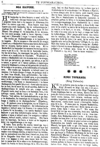6 TE PIPIWHARAUROA. NGA KAIPUKE. * Kei reira nga kaipuke e teretere ana." Waiata 104, 26. * Te hunga e haere ana ki raro ki te moana ki runga ki nga kai- puke." Waiata 107, 23. HE kaipuke te tino korero o enei wiki ka taha nei—ko nga waka taua o Amerika. I popoke tona tini o te tangata ki Akarana kia kite i to ratou unga mai. Kua haere mai kua haere atu enei kaipuke ko te miharotanga ia i mahue iho ki muri. E tika ana taua te Iwi Maori kia pirangi ki te kaipuke, ki te moana, he iwi rere moana hoki o taua tipuna, i rere mai nei i Hawaiki i runga i o ratou waka. He maha nga whakaakoranga a te kaipuke ki te tangata. Ko te moana e rite ana ki te oranga. i tenei ao, e whakawhiti katoa ana tatou ki tawahi kei te moana katoa tatou e rere ana. Ki te whakawhiti te kaipuke i te moana he nui nga raru- raru e pa ki a ia: he aio ki te kaipuke heera, he he no te hau, he marangai, he ngaru, he kohu, e kore ai e mohiotia te huarahi. Waihoki i a tatou e whakawhiti nei i te moana nui o te oranga, he nui nga raruraru, nga mate, nga aitua, e pa ki a tatou, e pouri ai o tatou ngakau, e rapurapu noa ai te whakaaro, e mea ai te ngakau ki te totohu ki te take o te moana, a he tokomaha e huripoki ana. He maha nga kaipuke e tahuri ana i te mama, i te kore utanga o runga, te putanga mai o te hau kua tikoki, kua poroteteke; he toko- maha ano nga tangata e tikoki ana, e poroteteke ana i te kore utanga—ite kore whakaaro, i te kore mohiotanga, i te kore e manawanui, i te kore whakapono hei peehi kia u ai—heoi ano ta ratou ko te kai, ko te moe ko te ahuareka, kahore he whakaarotanga ki tetahi atu ao, oranga ranei. Pupuhi tonu mai te hau o te karakia hou, o te tohunga ranei, tikoki tonu atu. E mea ra a Paora, " kei akina, kei kahakihakina e nga hau o te whakaako, he maminga na te tangata, he tini- hanga e mahia ai te whakapohehe." (Epeha 4, 14.) E pakaru ana te kaipuke, na te kuare na te haurangi ranei o te kapene: he tokomaha nga tangata e tahuri ana i te kuare, i to ratou kore e haere ki te karakia, i to ratou whakahi ranei kahore e pai kia tohutohungia ratou: he toko- maha o taua e tahuri ana i te waipiro—tahuri tinana, tahuri mahi, tahuri wairua. He hara nui te haurangi, he hara e kore ai te tangata e kite i te rangatiratanga o te rangi. E toku hoa aroha ka maha tenei nga tau i whai ai koe i ou whakaaro ano, i mea ai koe kei a koe ano tou tikanga, i tutea ai e koe a Ihu ki waho o au tikanga katoa, a kaore koe i te totika, kei te powaiwai noa iho koe i tenei ao, kua rite ki te kaipuke kua whati nei te urungi, kahore koe i te matau e rere ana ranei koe ki hea, kei te paea koe ki te akau o te whakangaromanga, kaati ra hutia to kara karanga ki a Ihu kia eke mai, kei te whai haere tonu ia i a koe me ia i whakatata ra ki ana akonga i te Moana o Kariri, a tona ekenga atu ki to ratou poti mariri tonu iho te hau, takoto kau ana te moana. Tukua ma Ihu e whakahaere to kaipuke inaianei, a ahakoa pehea te kino o te moana kahore rawa he awangawangatanga, kua whakawhiti ia i tenei moana, kua whiti ia ki tawahi, a kua hoki mai ano ki te arahi i a tatou ki te kokoru ataahua o te marie, o te hari, o te ora. Tukua to punga ki roto o te arai ara ki te rangi, e mea nei hoki te tuhituhinga, " Hei punga ano tenei ma tatou mo te wairua, he mea mau tonu, u tonu, tae noa atu hoki ki roto i te arai, ki te wahi kua tapoko atu nei a Ihu ki reira " (Hipe. 6, 19, 20). Kei rite tatou ki a Haimeniu raua ko Areha- nera i rite nei to raua whakapono " ki te kaipuke pakaru," a " tukua ana raua ki a Hatana" (1 Timoti 1.19, 20.) Ina ta taua waiata:— Au, e Ihu, tirohia, Arohaina iho ra; Whakaaetia ake au Ki to uma piri ai; I te wa e aki ai Enei ngaru kino nei: I te wa e keri ai Enei awha kaha mai. R. T. K. KINGI TUPAKAKA (King Tubercle). KEI te pohehe pea te nuinga o te tangata ko Kingi Eruera te kingi nui atu i te ao— ko te kingi nui atu i tenei ao ko Kingi Tupakaka. Tona kingitanga kei te ao katoa, kaore he iwi i puta ki waho o tona maru, iwi kiri ma kiri mangu ranei nona katoa, iwi rarata, mohoao nona anake, rangatira, ware ranei e pa ana tona ringa; whai-rawa, rawa-kore ranei e koropiko katoa ana ki a ia. E mea pea te tangata whakateka, "He kingi hou pea tena ina i kore rawa ai e ra- ngona tona ingoa i mua atu?" No mua iho tenei kingi no nga wa onamata, kua utu takoha nga iwi katoa ki a ia, kua kite i a ia, kua ma- naaki, kua whakamanuhiri i a ia. A koe e wha- kateka na kua kite i a ia a kua utu takoha ano pea ki a ia. E matau ai pea i a koe e te ngakau whakateka ma tetahi ona ingoa, ma tona ingoa Maori, he ingoa hoki a nga iwi katoa mo tenei nanakia. E tino marama ai pea ki te tangata te ahua o kingi Tupakaka me whakahua e ma- tou nga kupu a Takuta Meihana ki te hui a nga Kaunihera Marae i tu nei ki Poneke, i mea a Takuta Meihana " Kotahi te mea e kore rawa e wehe ke atu i a tatou, ko te mate kohi. A- hakoa pehea te kara o tatou kiri kotahi ano to tatou tino kini, he kini nui he kini kaha,