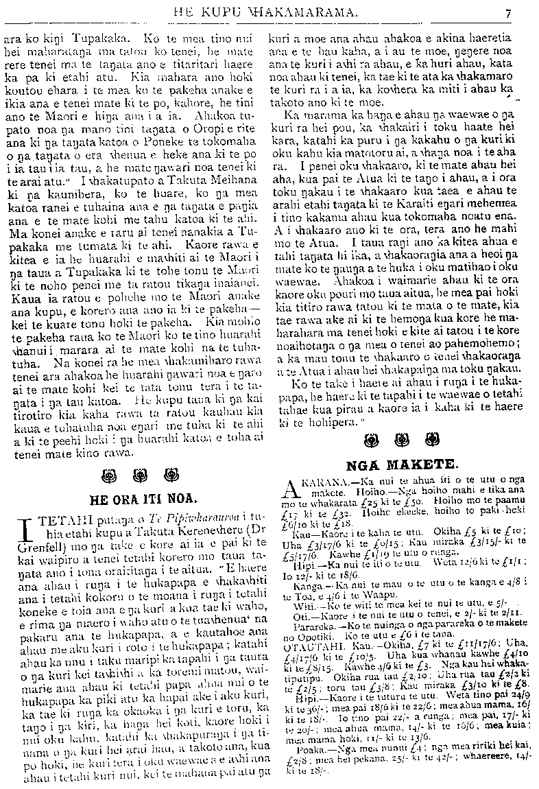 HE KUPU WHAKAMARAMA. ara ko kingi Tupakaka. Ko te mea tino nui hei maharatanga ma tatou ko tenei, he mate rere tenei ma te tangata ano e titaritari haere ka pa ki etahi atu. Kia mahara ano hoki koutou ehara i te mea ko te pakeha anake e ikia ana e tenei mate ki te po, kahore, he tini ano te Maori e hina ana i a ia. Ahakoa tu- pato noa nga mano tini tanata o Oropi e rite ana ki nga tangata katoa o Poneke te tokomaha o nga.tangata o era whenua e heke ana ki te po i ia tau i ia tau, a he mate ngawari noa tenei ki te arai atu." I whakatupato a Takuta Meihana ki nga kaunihera, ko te huare, ko nga mea katoa ranei e tuhaina ana e nga tangata e pangia ana e te mate kohi me tahu katoa ki te ahi. Ma konei anake e raru ai tenei nanakia a Tu- pakaka me tumata ki te ahi. Kaore rawa e kitea e ia he huarahi e mawhiti ai te Maori i nga taua a Tupakaka ki te tohe tonu te Maori ki te noho penei me ta ratou tikanga inaianei. Kaua ia ratou e pohehe mo te Maori anake ana kupu, e korero ana ano ia ki te pakeha— kei te kuare tonu hoki te pakeha. Kia mohio te pakeha raua ko te Maori ko te tino huarahi whanui i marara ai te mate kohi na te tuha- tuha. Na konei ra he mea whakamiharo rawa tenei ara ahakoa he huarahi ngawari noa e naro ai te mate kohi kei te tata tonu tera i te ta- ngata i nga tau katoa. He kupu tana ki nga kai tirotiro kia kaha rawa ta ratou kauhau kia kaua e tuhatuha noa engari me tuha ki te ahi a ki te peehi hoki i nga huarahi katoa e toha ai tenei mate kino rawa. HE ORA ITI NOA. I TETAHI putanga o Te Pipiwharauroa i tu- hia etahi kupu a Takuta Kerenewhere (Dr Grenfell) mo na take e kore ai ia e pai ki te kai waipiro a tenei tetahi korero mo taua ta- ngata ano i tona oraititanga i te aitua. "E haere ana ahau i runga i te hukapapa e whakawhiti ana i tetahi kokoru o te moana i runa i tetahi koneke e toia ana e na kuri a kua tae ki waho, e rima nga maero i waho atu o te tuawhenua na pakaru ana te hukapapa, a e kautahoe ana ahau me aku kuri i roto i te hukapapa; katahi ahau ka unu i taku maripi ka tapahi i na taura o nga kuri kei tawhiwhi a ka toremi matou, wai- marie aua ahau ki tetahi papa alma nui o te hukapapa ka piki atu ka hapai ake i aku kuri, ka tae ki runa ka okaoka i na kuri e toru, ka tango i na kin, ka hanga hei koti, kaore hoki i nui oku kahu, katahi ku whakapuranga i nga ti- nana o nga kuri hei arai hau, a takoto ana, kua pu huki, he. kuri tera i uku waewae ae awhi ana ahau i tetahi kuri nui. kei te mahana pai atu na kuri a moe ana ahau ahakoa e akina haeretia ana e te hau kaha, a i au te moe, ngengere noa ana te kuri i awhi ra ahau, e Rahuri ahau, kata noa ahau ki tenei, ka tae ki te ata ka whakamaro te kuri ra i a ia, ka kowhera ka miti i ahau ka takoto ano ki te moe. Ka marama ka hanga e ahau nga waewae o nga kuri ra hei pou, ka whakairi i toku haate hei kara, katahi ka puru i nga kakahu o nga kuriki oku kahu kia matotoru ai, a whanga noa i te aha ra. I penei oku whakaaro, ki te mate ahau hei aha, kua pai te Atua ki te tango i ahau, a i ora toku ngakau i te whakaaro kua taea e ahau te arahi etahi tangata ki te Karaiti engari mehemea i tino kakama ahau kua tokomaha noatu ena. A i whakaaro ano ki te ora, tera ano he mahi mo te Atua. I taua rangi ano ka kitea ahua e tahi tangata hi ika, a whakaorangia ana a heoi nga mate ko te ngaunga a te huka i oku matihao i oku waewae. Ahakoa i waimarie ahau ki te ora kaore oku pouri mo taua aitua, he mea pai hoki kia titiro rawa tatou ki te mata o te mate, kia tae rawa ake ai ki te hemonga kua kore he ma- harahara ma tenei hoki e kite ai tatou i te kore noaihotanga o nga mea o tenei ao pahemohemo; a ka mau tonu te whakaaro o tenei whakaoranga a te Atua i ahau hei whakapainga ma toku ngakau. Ko te take i haere ai ahau i runga i te huka- papa, be haere ki te tapahi i te waewae o tetahi tahae kua pirau a kaore ia i kaha ki te haere ki te hohipera." NGA MAKETE. AKARANA Ka nui te ahua iti o te utu onga makete. Hoiho.—Nga hoiho mahi e tika ana mo te whakarata £25 ki te £50 Hoiho mo te paamu £17 ki te £32 Hoiho ekeeke, hoiho to paki hoki £6/10 ki te £18. Kau—Kaore i te kaha te utu. Okiha £5 ki te £10: Uha £3/17/6 ki te £6/15; Kau miraka £3/15/- ki te £5/17/6. Kawhe £1/19 te utu o runga. Hipi—Ka nui te iti o te utu. Weta. 12/6 ki te £1/1; 10 I2/- ki te 18/6. Kanga Ka nui te mau o te utu o te kanga e 1/8 i te Toa, e 4/6 i te Waapu. Witi.--Ko te witi te mea kei te nui te utu, e 5/- Oti.—Kaore i te nui te utu o tenei, e 2/- ki te 2/11. Parareka.—Ko te nuinga o nga parareka o te makete no Opotiki. Ko te utu e £6 i te tana. OTAUTAHI. Kau Okiha, £7 ki te £11/17/6; Uha. £4/17/6 ki te £10/5 Uha kua whanau kawhe £4/10 ki te £8/15. Kawhe 4/6 ki te £3- Nga kau hei whaka- tiputipu. Okiha rua tau £2/10; ; uha rua tau £2/2 ki te £2/5; toru tau £3/8; Kau miraka £3/10 ki te £8 Hipi.Kaore i te tuturu te utu, Weta tino pai 24/9 ki te 36/-; mea pai 18/6 ki te 22/6; mea ahua mama, 16/ ki te 18/- Io tino pai 22/- a runga; mea pai, 17/- ki te 2o/-; mea ahua mama, 14/- ki te 16/6; mea kuia; mea mama hoki, 11/- ki te 13/6. Poaka.—Nga mea nunui £4; nga mea ririki hei kai, £2/8; mea hei pekana. 25/- ki te 42/-; whaereere. 14/-ki te 18/-.