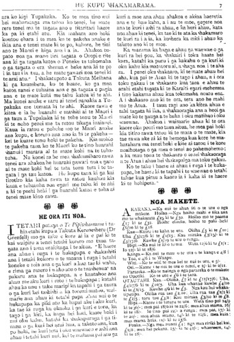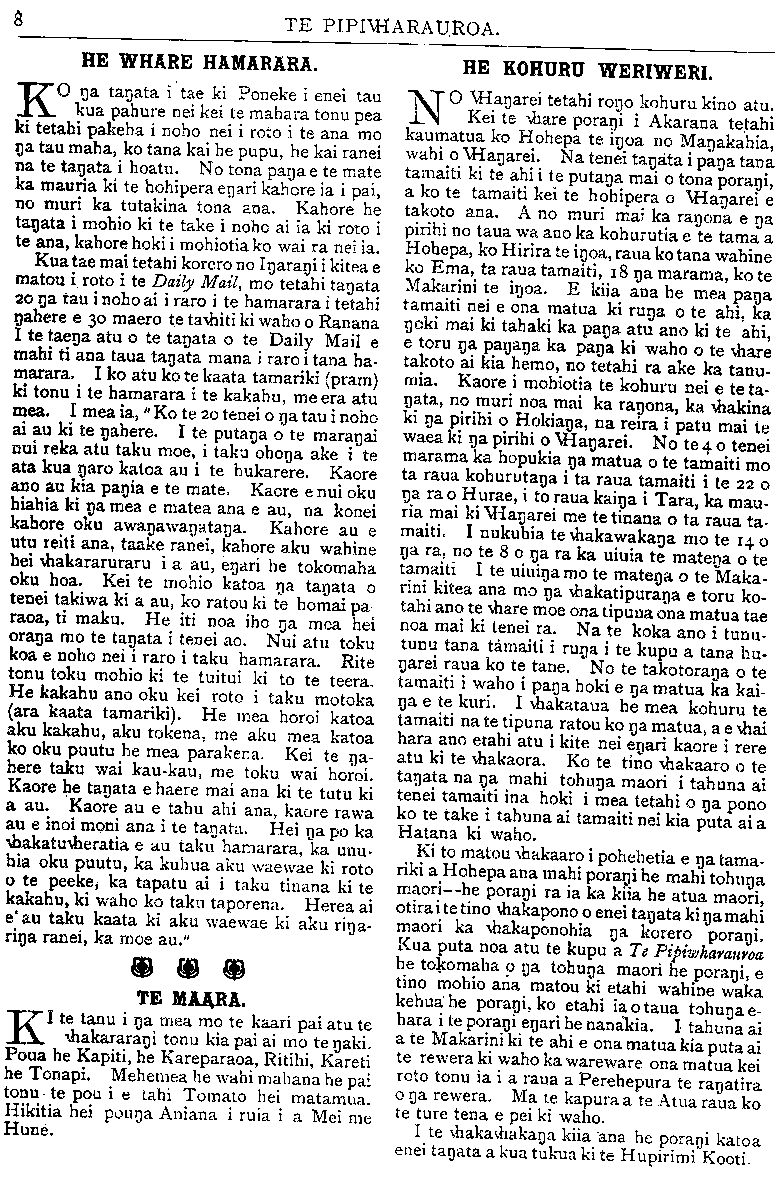 8 TE PIPIWHARAU.ROA. HE WHARE HAMARARA. KO nga tangata i tae ki Poneke i enei tau kua pahure nei kei te mahara tonu pea ki tetahi pakeha i noho nei i roto i te ana mo nga tau maha, ko tana kai he pupu, he kai ranei na te tangata i hoatu. No tona panga e te mate ka mauria ki te hohipera engari kahore ia i pai, no muri ka tutakina tona ana. Kahore he tangata i mohio ki te take i noho ai ia ki roto i te ana, kahore hoki i mohiotia ko wai ra nei ia. Kua tae mai tetahi korero no Ingarangi i kitea e matou i roto i te Daily Mail, mo tetahi tangata 20 nga tau i noho ai i raro i te hamarara i tetahi nahere e 30 maero te tawhiti ki waho o Ranana I te taenga atu o te tangata o te Daily Mail e mahi ti ana taua tangata mana i raro i tana ha- marara. I ko atu ko te kaata tamariki (pram) ki tonu i te hamarara i te kakahu, me era atu mea. I mea ia, " Ko te 20 tenei o nga tau i noho ai au ki te ngahere. I te putanga o te marangai nui reka atu taku moe, i taku ohonga ake i te ata kua ngaro katoa au i te hukarere. Kaore ano au kia pangia e te mate. Kaore e nui oku hiahia ki nga mea e matea ana e au, na konei kahore oku awangawangatanga. Kahore au e utu reiti ana, taake ranei, kahore aku wahine hei whakararuraru i a au, engari he tokomaha oku hoa. Kei te mohio katoa nga tangata o tenei takiwa ki a au, ko ratou ki te homai pa raoa, ti maku. He iti noa iho nga mea hei oranga mo te tangata i tenei ao. Nui atu toku koa e noho nei i raro i taku hamarara. Rite tonu toku mohio ki te tuitui ki to te teera. He kakahu ano oku kei roto i taku motoka (ara kaata tamariki). He mea horoi katoa aku kakahu, aku tokena, me aku mea katoa ko oku puutu he mea parakena. Kei te nga- here taku wai kau-kau, me toku wai horoi. Kaore he tangata e haere mai ana ki te tutu ki a au. Kaore au e tahu ahi ana, kaore rawa au e inoi moni ana i te tangata. Hei nga po ka whakatuwheratia e au taku hamarara, ka unu- hia oku puutu, ka kuhua aku waewae ki roto o te peeke, ka tapatu ai i taku tinana ki te kakahu, ki waho ko taku taporena. Herea ai e au taku kaata ki aku waewae ki aku ringa- ringa ranei, ka moe au." TE MAARA. KI te tanu i nga mea mo te kaari pai atu te whakararangi tonu kia pai ai mo te ngaki. Poua he Kapiti, he Kareparaoa, Ritihi, Kareti he Tonapi. Mehemea he wahi mahana he pai tonu te pou i e tahi Tomato hei matamua. Hikitia hei pounga Aniana i ruia i a Mei me Hune. HE KOHURU WERIWERI. NO Whangarei tetahi rongo kohuru kino atu. Kei te whare porangi i Akarana tetahi kaumatua ko Hohepa te ingoa no Mangakahia, wahi o Whangarei. Na tenei tangata i panga tana tamaiti ki te ahi i te putanga mai o tona porangi, a ko te tamaiti kei te hohipera o Whangarei e takoto ana. A no muri mai ka rangona e nga pirihi no taua wa ano ka kohurutia e te tama a Hohepa, ko Hirira te ingoa, raua ko tana wahine ko Ema, ta raua tamaiti, 18 nga marama, ko te Makarini te ingoa. E kiia ana he mea panga tamaiti nei e ona matua ki runga o te ahi, ka ngoki mai ki tahaki ka panga atu ano ki te ahi, e toru nga panganga ka panga ki waho o te whare takoto ai kia hemo, no tetahi ra ake ka tanu- mia. Kaore i mohiotia te kohuru nei e te ta- ngata, no muri noa mai ka rangona, ka whakina ki nga pirihi o Hokianga, na reira i patu mai te waea ki nga pirihi o Whangarei. No te 4 o tenei marama ka hopukia nga matua o te tamaiti mo ta raua kohurutanga i ta raua tamaiti i te 22 o nga rao Hurae, i to raua kainga i Tara, ka mau- ria mai ki Whangarei me te tinana o ta raua ta- maiti. I nukuhia te whakawakanga mo te 14 o nga ra, no te 8 o nga ra ka uiuia te matenga o te tamaiti I te muinga mo te matenga o te Maka- rini kitea ana mo nga whakatipuranga e toru ko- tahi ano te whare moe ona tipuna ona matua tae noa mai ki tenei ra. Na te koka ano i tunu- tunu tana tamaiti i runga i te kupu a tana hu- ngarei raua ko te tane. No te takotoranga o te tamaiti i waho i panga hoki e nga matua ka kai- nga e te kuri. I whakataua he mea kohuru te tamaiti na te tipuna ratou ko nga matua, a e whai hara ano etahi atu i kite nei engari kaore i rere atu ki te whakaora. Ko te tino whakaaro o te tangata na nga mahi tohunga maori i tahuna ai tenei tamaiti ina hoki i mea tetahi o nga pono ko te take i tahuna ai tamaiti nei kia puta ai a Hatana ki waho. Ki to matou whakaaro i pohehetia e nga tama- riki a Hohepa ana mahi porangi he mahi tohunga maori he porangi ra ia ka kiia he atua maori, otira i te tino whakapono o enei tangata ki nga mahi maori ka whakaponohia nga korero porangi. Kua puta noa atu te kupu a Te Pipiwharauroa he tokomaha o nga tohunga maori he porangi, e tino mohio ana matou ki etahi wahine waka kehua he porangi, ko etahi ia o taua tohunga e- hara i te porangi engari he nanakia. I tahuna ai a te Makarini ki te ahi e ona matua kia puta ai te rewera ki waho ka wareware ona matua kei roto tonu ia i a raua a Perehepura te rangatira o nga rewera. Ma te kapura a te Atua raua ko te ture tena e pei ki waho. I te whakawhakanga kiia ana he porangi katoa enei tangata a kua tukua ki te Hupirimi Kooti.