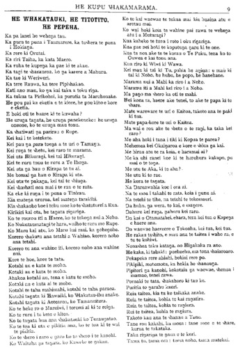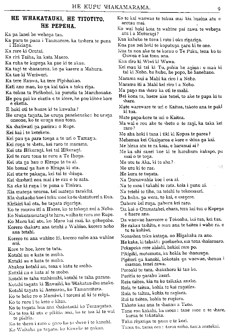 HE KUPU WHAKAMARAMA. HE WHAKATAUKI, HE TITOTITO, HE PEPEHA. Ka pa ianei he wehenga tau. Ka puru te puna i Taumarere, ka tuwhera te puna i Hokianga a. Ka rere ki Orutai. Ka riri Taiha, ka kata Maero. Ka ruha te kupenga ka pae ki te akau. Ka tangi te vharauroa, ko na karere a Mahuru. Ka tae ki Weriweri. Ka tere Rauwa, ka tere Pipiwhakao. Kati ano mau, ko na kai taka a toku rina. Ka tukua ta Pirikohoi, ka purutia ta Maruhouake. He pou pai ka eketia e te kiore, he pou kino e kore e eketia. E hoki oti te huare ki te kuwaha? He urunga tanata, he urunga panekeneke: he urunga oneone, ko te urunga mau tonu. Ka whatiwati nga parirau o Rupe. Kei kai i te ketekete. Kei pau nga para toenga a a te uri o Tamanu. Kei runa te whetu, kei raro te marama. Kei uta Hikurangi, kei tai Hikurangi. Kei te ruru tonu te ruru a Te Ihonga. Kei uta na hau o Rirapa te tu ai. Me homai nga hau o Rirapa ki uta. Kei uta te pakanga, kei tai te whiunga. Kei whawhati noa mai i te rau o te rata. Ka eke ki runa i te puna o Timrau. Kia matenga a ururoa, kei matenga tarakihi. Kia whakaoho koe i toku moe ko te whatuturei a Rua. Kirikiri kai ota, he tanata rinarina. Ko te rourou iti a Haere, ko te tokonga nui a Noho. Ko Nukutaumatangi te hara, waiho te raru mo Rupe. Ko Maru kai atu, ko Maru kai mai, ka ngohengohe. Korero whakatu ana tetahi a Wahiao, korero noho ana tetahi. Korero tu ana wahine iti, korero noho ana wahine nui. Kore te hoe, kore te tata. Kotahi au e kata te moho. Kotahi au e kata te moho. Ahakoa kotahi au, tena e katu te moho. Kotaki au e kata ai te moho. Kotahi te taha mahimahi, kotahi te taha paraoa. Kotahi tanata ki Hawaiki, ko whakatau-ihu anake. Kotahi tanata ki Aotearoa, ko Tamanuitera Ko te heke ro o Maruiwi, i toremi ai ki te reinga. Ko te ruru i te kete e kitea. Ko te tanata hua ana whakatauki ko Turaungatao Ku te toa ki uta e pikitia ana; , ku te toa ki te wai te pikitia. Ko te whero i raro e ngaro ko to whero i te kanohi. Ko Waitaha nga) tangata, ku Kaweke te ngakau . Ko te kai waewae te tukua mai kia huaina atu e arotau mai. Ko wai hoki koia te wahine pai rawa te wehenga atu i a Muturangi? Kua kaheko te tuna i roto i oku rinarina. Kua pae nei hoki te koputunga naru ki te one. Kua ta noa ake te te korau o Te Puku, tena ko to Ouwea e kai tonu ana. Kua riro ki Wiwi ki Wawa. Kei mau ki tai ki Tu, puhia he angina: e mau ki tai ki Noho, he huhu, he popo, he hanehane. Marama nui a Mahi ka riro i a Noho. Marama iti a Mahi kei riro i a Noho. Ma pan o ma whero ka oti te mahi. Hei kona ra, haere ake tenei, to ake te papa ki te whare. Mate wareware te uri o Kaitoa, takoto ana te paki ki tua. Mate papa-kore te uri o Kaitoa. Ma wai e rou ake te whetu o te rani, ka taka kei raro? Me aha hoki i tana i tiki ki Kopua te parea? Mehemea kei Okaingaroa e kore e whiua na kai. Me hirau atu te ra koia, e haramai ai? Me ka uhi ranei koe ki te huruhuru kakapo, pu mai o te tona. Me utu te Aka, ki te aha? Me utu ki to rae He kura te tangata. Na Ngaruawahia koe i ora ai. Na te moa i takahi te rata, koia i ngunu ai. Na tetehi te tihe, na tetehi te tokomauri. Nga huhu, na wera, to kai, e mangere Ngahuru kei runga, ngahuru kei raro. Oa kai o Otamatahei, ehara, tera kei tua o Kapenga e haere ana. Oa waewae haereere o Tokoahu, kei tua, kei tua. He rakau tawhito, e mau ana te taitea i waho ra, e tu te kohiwi. Nonawhea taku katanga, no Hingakaka ra ano. He kaka, ki tahaki: puehuehu, ma tona whaiaroaro. Pekapeka rere ahiahi, hokioi rere po. Pikipiki, motumotu, ka hokia he whanaunga. Pipitori na kanohi, kokotaia na waewae, whenua i mamao, tenei rawa. Poroaki tu tata, whakahoro ki tau ke. Puritia to ngarahu kauri. Ruia taitea, kia tu ko taikaka anake. Ruia te taitea, kohia te kai rangatira. Ruia te taitea, kohia te rangiura. Rui te taitea, kohia te rangiura. Takoto kau ana te whanau a Tane. Tane rou kakahi, ka moea: tane moe e te whare, kurua te takataka. Taku ringaringa te ngaua; e te kuri. Tama tu. tama; ora: tama noho. tama matekai.