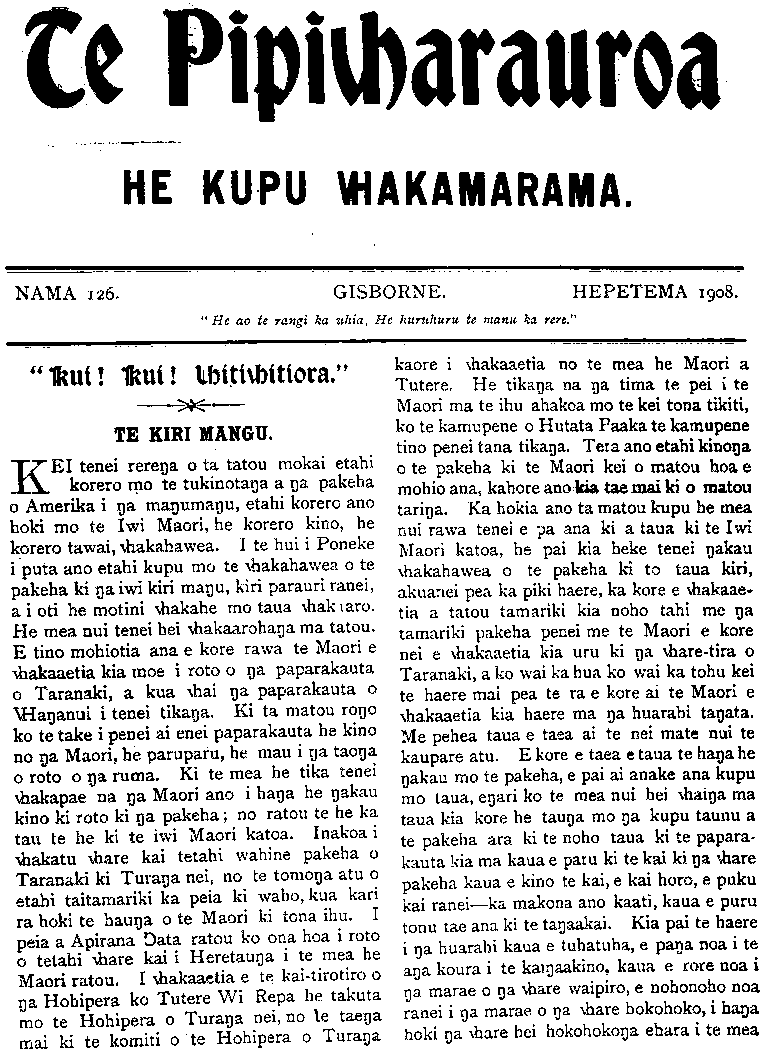 Pipiwharauroa HE KUPU WHAKAMARAMA. NAMA 126. GISBORNE. HEPETEMA 1908. " He ao te rangi ka uhia, He huruhuru te manu ka rere." kui! kui! whitiwhitiora. —— TE KIRI MANGU. KEI tenei rerenga o ta tatou mokai etahi korero mo te tukinotanga a nga pakeha o Amerika i nga mangumangu, etahi korero ano hoki mo te Iwi Maori, he korero kino, he korero tawai, whakahawea. I te hui i Poneke i puta ano etahi kupu mo te whakahawea o te pakeha ki nga iwi kiri mangu, kiri parauri ranei, a i oti he motini whakahe mo taua whakaaro. He mea nui tenei hei whakaarohanga ma tatou. E tino mohiotia ana e kore rawa te Maori e whakaaetia kia moe i roto o nga paparakauta o Taranaki, a kua whai nga paparakauta o Whanganui i tenei tikanga. Ki ta matou rongo ko te take i penei ai enei paparakauta he kino no nga Maori, he paruparu, he mau i nga taonga o roto o nga ruma. Ki te mea he tika tenei whakapae na nga Maori ano i hanga he ngakau kino ki roto ki nga pakeha; no ratou te he ka tau te he ki te iwi Maori katoa. Inakoa i whakatu whare kai tetahi wahine pakeha o Taranaki ki Turanga nei, no te tomonga atu o etahi taitamariki ka peia ki waho, kua kari ra hoki te haunga o te Maori ki tona ihu. I peia a Apirana Ngata ratou ko ona hoa i roto o tetahi whare kai i Heretaunga i te mea he Maori ratou. I whakaaetia e te, kai-tirotiro o nga Hohipera ko Tutere Wi Repa he takuta mo te Hohipera o Turanga nei, no Ie taenga mai ki te komiti o te Hohipera o Turanga kaore i whakaaetia no te mea he Maori a Tutere. He tikanga na nga tima te pei i te Maori ma te ihu ahakoa mo te kei tona tikiti, ko te kamupene o Hutata Paaka te kamupene tino penei tana tikanga. Tera ano etahi kinonga o te pakeha ki te Maori kei o matou hoa e mohio ana, kahore ano kia taemai ki o matou taringa. Ka hokia ano ta matou kupu he mea nui rawa tenei e pa ana ki a taua ki te Iwi Maori katoa, he pai kia heke tenei ngakau whakahawea o te pakeha ki to taua kiri, akuanei pea ka piki haere, ka kore e whakaae- tia a tatou tamariki kia noho tahi me nga tamariki pakeha penei me te Maori e kore nei e whakaaetia kia uru ki nga whare-tira o Taranaki, a ko wai ka hua ko wai ka tohu kei te haere mai pea te ra e kore ai te Maori e whakaaetia kia haere ma nga huarahi tangata. Me pehea taua e taea ai te nei mate nui te kaupare atu. E kore e taea e taua te hanga he ngakau mo te pakeha, e pai ai anake ana kupu mo taua, engari ko te mea nui hei whainga ma taua kia kore he taunga mo nga kupu taunu a te pakeha ara ki te noho taua ki te papara- kauta kia ma kaua e paru ki te kai ki nga whare pakeha kaua e kino te kai, e kai horo, e puku kai ranei—ka makona ano kaati, kaua e puru tonu tae ana ki te tangaakai. Kia pai te haere i nga huarahi kaua e tuhatuha, e panga noa i te anga koura i te kaingaakino, kaua e rore noa i nga marae o nga whare waipiro, e nohonoho noa ranei i nga marae o nga whare hokohoko, i hanga hoki nga whare hei hokohokonga ehara i te mea