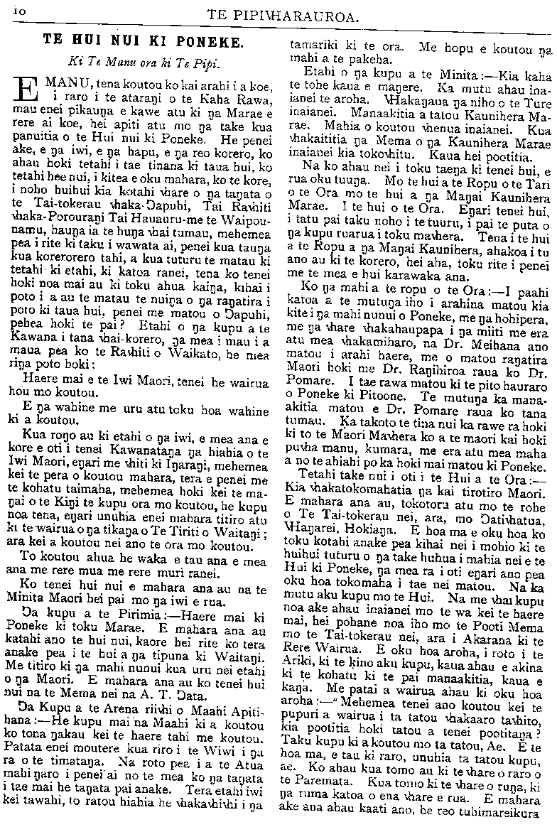 6 TE PIPIWHARAUROA. KA MAHITI A TUKORO. Ki U Etita o Te Pipiwharauroa HE panui hei whakakorikori i te manu ki ona marae tioro ai. Ngaehe ana nga rongo hau mai o te hui a te naahi Momona ka tu nei ki Hiruharama a nga ra e heke iho nei. Katahi tonu katakitaki mai nga kawainga o te ata ehara karawheta ana, he taka ruwha mo nita Mihinare ki roto ki te hinaki a te Momona. Ko Pakau Hokio ko te kai hautu tenei o roto i a Mikaera whare karakia e tu nei i Hiruharama. Taukuri e kua noho mokemoke te pa i ki nei i te tangata ka mahiti ia a tukoro he pae ke whakapakapa mai ai, e nunukuhia ana pea te aronga o taua hui mo te aro mahanatanga, he whakaaro kia pua te wai hai kopenutanga i te ihu o nehe taane ki roto ki te kopu o Makatote wai, ka tapa hoki pea he ingoa hou mo tukoro he ingoa purotu, ko tikoki ranei ko tahuri ranei mehemea hoki ko tona ingoa tahito tonu ko ta a te Haahi matua ingoa i tapa ai mona ko te Raanapia Pakau nei tonu engaringari kai te mau ano te haunga- unga o ta te Haahi matua tapa ingoa mo te tangata. Heoi nei, Na HOHEPA TE PIRI. Waipiro Bay, HUA O TE HUI KI PONEKE. HE mea karanga a Ngatiporou e Paratene Data, kia rongo i nga korero katoa o te Hui nui i tu nei ki Poneke, a ko nga aitua he mea hui ki te marae kotahi. I te mutunga o nga korero katoa ka mea a Paratene, e tika ana kia nui te hari me te koa o tatau katoa no naianei i tino marama ai to tatau ahua, ara, kua kitea tatau," He tangata ano," i raro i te ra, he pera ano me te pakeha, a i kitea hoki te hoanga o nga rangatira pakeha ki te Iwi Maori i roto i taua hui, ki te awhina i nga mahi o te hui me ona tini raruraru, me nga manaaki, korero, whakamanuhiri, me nga hakari ki te Iwi Maori, kaore i rikarika kua ara mai o tatau hoa pakeha ngakau tika, kua awhina mai i nga mahi hapai ake i te ora mo te Iwi Maori. E tika ana kia waiho tenei wa hei hurihanga tau, mo te wa tahito mo te wa hou o naianei a me huri atu nga tuara ki muri ko nga aroaro ki mua, ka haere maro, whakamua tonu te haere ma te huarahi kua tohungia e te whakapono, e kiia nei ko Ahuwhenua. He nui nga korero i puta i taua hui mo nga tikanga e ora ai te Iwi Maori, otira i kitea ano i reira ko te waipiro te tino hoa riri hei peehi i aua tikanga mo te Iwi Maori e ngaro ai ki te po, no reira he take nui tenei kia tino whakaarohia inaianei kia kaua e waiho ma te Ture anake e arai taua kai, engari ma tatau tonu ake, ma ia tangata, ma ia wahine, e whakaae kia whakarerea atu taua kai, na me whakaatu nga ropu tane, wahine, hei whakakaha haere i te tikanga kia pakari haere ai, ma aua ropu e kukume mai nga tangata e tino pehia ana e taua kai, engari ehara tenei i te mahi mama, otira me whakamatau, a me timata hou inaianei. I tahuri te hui ki te korero, ki te whiriwhiri. He nui nga kupu whakamihi a te hui i puta mo nga kai-whakahaere o taua hui nui i Poneke, mo te Minita Maori hoki nana i awhina te kotahi- tanga o nga Tamariki o Te Aute, a tae mai ki naianei kua nui ona whaihuatanga hei painga ki te Iwi Maori. Ko nga kupu i oti i tenei hui. 1. He tautoko i nga take katoa i oti i te hui nui i Poneke. 2. Kia pehia te kaha o te waipiro ara— (a). Me whakatu he ropu tane he ropu wahine o roto o ia Pariha, o ia Pa- riha, o roto o te takiwa Kaunihera o Horouta. (e). Me hanga he pukapuka haina ma ia tangata ma ia tangata o tona urunga ki te ropu, a me whakaingoa ano mo taua ropu, (ara me ata hanga he whaka- upoko mo taua pukapuka.) (i). Ko nga ropu tane hei kauhau ki nga tane hei kukume mai i te tini o te tangata, ko nga ropu wahine ki nga wa- hine a ki te kukume hoki i a ratou tane. (o). Me whakaae te tangata ki te whakarere i te waipiro, ka tuhi ai i tona ingoa ki te pukapuka o te ropu. (u). Me mahi tahi enei ropu, me nga Komiti Marae ki te peehi haere i te Waipiro i roto i o ratou rohe. 3. Me whakaara nga tikanga e ngahau ai te hapai i te whakapono. Ma nga hui a muri ake e whakatikatika nga tino tuturutanga mo enei take. Heoi. I te kauwhau a Pihopa Nerikena i Ranana ka mea ia ko etahi o nga pakeha o Niu Tireni kua Atua-kore, ara, kua kore e mohio ki te Atua. Nui atu te riri o nga pakeha o Akarana ki enei kupu.