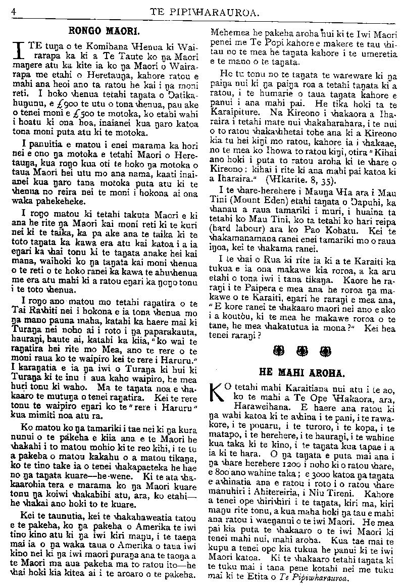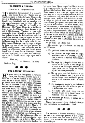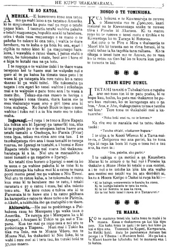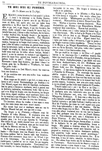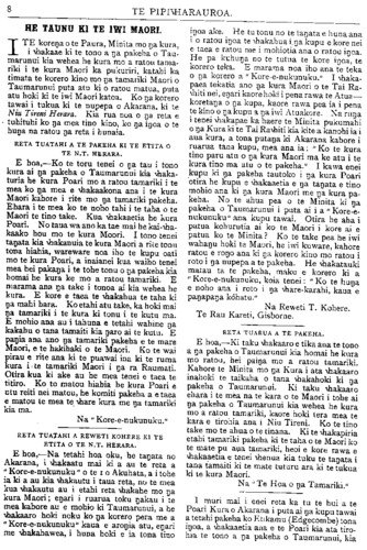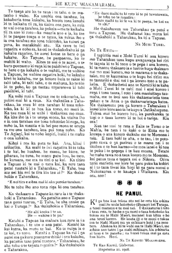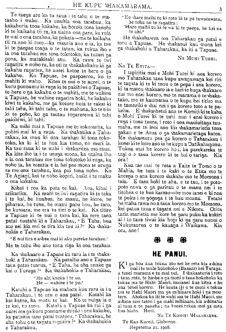 HE KUPU WHAKAMARAMA. Te taenga atu ka tu raua i te taha o te ma- taaho i waho. Ka unuhia ona tarahau, ka kakahuria tona kakahu, ka horoia tona kanohi ki te kaikaha tu ra, ka tiaina ona pare, ka ruia te wai o ona tarahau, ka pokaia—me te kaikaha tii ra ano ki roto—ka mauria ano e ia, ka tae ki te paepae toanga o te tatau, ka tukua iho e ia ona tarahau me tona tokotoko, ka tuturi nga pona, ka matakitaki atu. Ka rawe te iwi rangatira e noho ra, ka oti te whakakakahu ki nga kakahu rangatira, he aurei katoa te here o nga kakahu. Ko Tapuae, he paepaeroa, ko te mahiti ki waho. Kitea te nui o te aurei, o te kuru pounamu ki runga ki te pakihiwi o Tapuae, te here o nga kakahu o te mahiti, me te wahine a Tapuae, he wahine rangatira hoki, he kakahu kiwi te kakahu, me nga kotore huia te rakai ki tahi taha, ki tahi taha, o te mahuna, ko te tiki ki te poho, ko nga tautau tongarerewa ki tahi pakihiwi, ki tahi. Ka mihi mai a Tapuae me te tokomaha, ka pohiri mai ki a raua. Ka whakatika a Taha- rakau, ka mau ki ona tarahau ki tona toko- toko, ka ki ki te hoa kia tomo, no muri ia. Ka tau raua ki te wahi i whakaritea mo raua. Ka kite iho ia i te urunga mona, ka utaina iho e ia ona tarahau me tona tokotoko ki runga, ka noho ia, ka meatia e ia hei pae mona te urunga ra me ona tarahau, kua pai tona noho. Ko Te Angiangi, kei te noho kopiri, huiki i te maku o ona kakahu. Kihai i roa ka puta te kai. Ana, kihai i arikarika. Ka mahi te iwi rangatira ki te taka i te kai, he huahua, he manu, he kiore, he piharau, he tuna, he manu patu hou, he taro, he kumara, me era tu tini o te kai. Ka titiro a Tapuae ki te nui o tana kai, ka rere tana patai tuatahi ki a Taharakau, " E Taha, hua atu nei kia nui te tira kia tau ai?" Ka whaka- hokia e Taharakau, "E nui tira e awhea mai ki aku pureke tarahau." Me te tohu iho ano tona ringa ki ona tarahau. Ka whakaaro a Tapuae ka raru ia i te whaka- hoki a Taharakau. Ka pataitia ano e Tapuae tana patai tuarua, " E Taha, he aha anake nga kai o Turanga?" Ka whakahokia e Taharakau, " He ahi kouka i te ao, He — wahine i te po." Katahi a Tapuae ka mahara kua raru ia i a Taharakau, i te utu o ana patai. Katahi ka kai katoa, ka mutu te kai. Ko te nuinga ia o te kai, tu tonu. Katahi a Tapuae ka rui i nga aurei me nga kuru pounamu whitiki i ona kakahu, ka pataitia tana patai tuatoru," Taharakau he aha tohu o te tanata rangatira?" Ka whakahokia e Taharakau, " He whare maihi tu ki roto ki te pa tuwatawata, he tohu no te rangatira: whare maihi tu ki te wa ki te paenga, he kai na te ahi." He whakahawea mo Taharakau nga patai e toru a Tapuae. He whakanui kau mona kei nga whakahoki a Taharakau, ka iti a Tapuae. Na MOHI TUREI. Na TE ETITA— I tapiritia mai e Mohi Turei ki aua korero mo Taharakau tana kupu awangawanga kei riri te tangata ki te ki tonu o te pepa i ana korero, ki ta matou whakaaro ia e hari te hunga whakaaro nui mo enei korero, mo te marama o te whaka- tako, mo te kaumatua o te kupu hei titiro ma te tamariki e whai nei i nga korero toto a te pa- keha. E whakawhetai ana te Komiti ki te kaha o Mohi Turei ki te tuhi mai i enei korero i runga i tona tuara, i roto i ona mauiuitanga tau- maha, me te inoi ano kia whakamarietia tona ngakau e te Atua o nga whakamarietanga katoa. Me whakamutu pea nga korero o Taharakau i konei ki te kore ano ia he kupu a Ngatikahungunu. Tukua mai he korero hou, ka parekareka t.e tangi o a taua korero ki te hoi o taringa. Kia ora! Kua tae mai te reta a Taite te Tomo o te Mahia, he tata i te kaki o te Etita mo te korenga o ana korero whakahe mo te Momona i taia. E taea hoki te aha, e te tau, i te poto- poto rawa o nga parirau o te manu nei i te titohea o te hua kareao—he moa ianei e ki noa te puku i te ngongonga i te hau moana. Tetahi he maha rawa no a taua korero mo te Momona, kei patua taua e tangata nei e Nikora. Otira taria marietia me kore he ngaru puku ka kokiri ai i to taua tiwai kia hongi ki nga ngaru nunui o Nukutaurua o te kauanga i Waikawa. Kia ora, ano! HE PANUI. KI na hoa kua tukua atu nei he reta kia awhina mai i te mahi hokohoko (Bazaar) kei Turanga, a tenei marama e tu mai nei. I whakaaturia i roto i taua reta, te hawhe o na moni o tana hokohoko ka tukua ma te Hahi Maori, inaianei kua kitea e he ana tenei korero. He koata (¼) o te moni e tukua ma te Hahi Maori ma nga mihinare hoki i oa mou- tere. Ahakoa ka iti te wahi ma te Hahi Maori, me awhina ano tatou i na mahi mihinare, kia awhinatia ai taua e te pakeha; na konei tukua mai na mea kua hiato. Heoi. Na TE KOMITI WHAKAHAERE. Te Kau Kareti; Gisborne. Hepetema 21. 1908