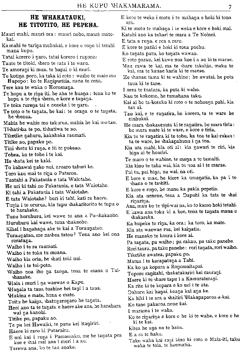 HE KUPU WHAKAMARAMA. HE WHAKATAUKI, HE TITOTITO, HE PEPEHA. Mauri mahi, mauri ora mauri noho, mauri mate- kai. Kamahi te taringa a muhukai, e kore e rongo ki tetahi mana kupu. Tatai korero i naro, tatai korero i rangona: Taute te titoki, whero te rata i te waru. Te amorangi ki mua, te hapai o ki muri. Te kotinga poro, ka taka ki roto: waiho te mate mo Hapopo: ko te Rangipuritia, nana te rena. Tere kau te waka o Horomanga. Te hopu a te rina iti, he aha te huanga: tena ko te hopu a te ringa whero, e kore e tan an a. Te toka rurer) a tai e neneke i te naru. Te toto o te tanata, he kai: te orar) a o te tangata, he whenua. Mahia he wahie mo takurua, mahia he kai mo tau. Tiwhatiwha te po, tivhatiwa te ao. Tiketike ngahuru, hakahaka raumati. Titike ao, papaku po. Tini whetu ki runa, e iti te pokeao. Tohea, ko te tohe i te kai. He whata kei te kaki. To kahawai ngako nui, aroaro tahuri ke. Toro kau mai te ringa o Pataroa. Tuatahi a Pakatauia e tata Waiotahe. He uri ki tahi no Pakatauia, e tata Waiotahe. Ki tahi a Pakatauia i tata Waiotahe. E tata Waiotahe? huri ki tahi, kati ra haere. Tungia i te ururua, kia tupu whakaritorito te tupu o te harakeke. Tunu huruhuru, kei wawe tu ana a Pu-whakaoho. Huruhuru kai wavve, tuna whakaoho. Kihai i hanahana ake te kai a Turaungatao. Turaungatao, me nawhea tatou? Tena ano kei ona roratanga. Waiho i te ra raumati. Waiho i te toka tu moana. Waiho kia oria, he whati toki nui. Waiho i te toi-poto. Waiho noa iho na taonga, tena te mana o Tai- whanake. Whaia i muri i na waewae o Kapu. Whangaia ta taua tuahine hei tangi i a taua. Whakina e mate, huna e mate. Toitu he kainga, whatungarongaro he tangata. Heoi ano ta te tanata e haere ake ana, he harahara wai na kanohi. Titike po, papaku ao. Te pu kei Hawaiki, te puna kei Rangiriri. Haere ki raro ki Putaraira. E nui kai i runga i Pamamaku, me he tangata pea koe e whai mai ana i muri i a au, Tarewa ana, ko te tau anake. E kore te weka i motu i te mahanga e hoki ki tona ara. Ki te motu te mahanga i te weka e kore e hoki mai. Katahi ano ka tukari te mara a Te Noinoi. E tata a runga, e roa a raro. E kore te patiki e hoki ki tona puehu. Ko tangata patu, ko tangata wawao. E roto parau, kei kawe noa koe i a au ki te marae. Mau rawa te kai, ma te whare takahia, maku te kai, ma te kauae karia ki te marae. He whanau tama ki te wahine; he awatai, he puta taua ki te tane. I orea te tuatara, ka puta ki waho. Nau te kokomo, he tumahana taku. Kai ai he ta-kotuku ki roto o te nohoanga pahi, kia tau ai. Tau kai, e te rangatira, he korero, ta te ware he muhukai. He mara whakautuutu ki te rangatira, he mara tiria: he mara mate ki te vvare, e kore e tina, Kia tu te rangatira ki te tohu, ka toa te kai-rakau: ta te ware, he whakapahunu i na toa. Kia ata mahi, kia oti ai: kia ngawari te riri, kia hina ai te hoariri. Te maro o te wahine, te mana a te tamaiti. Kia kino te taha wai, kia tu noa ai i te marae. Pai tu, pai hinga, na wai, na oti. E kore e mau, he kiore ka umangatia, ka pa i te whana o te tawhiti. E kore e rongo, he manu ka pakia pepetia. Kia ata nenene, tena a Ngapuhi ka tata te whai ringaringa. Ana, mau ko te tipi-wai na, ko to kamo hoki tetahi. E kawa ana toku ki a koe, tena te tanata mana e whakareka. Ka hupeke te nga, ka ora; ka toro, ka mate. Kia ata waewae roa, kei kaingatia. He manako te koura i kore ai. Pa tanata, pa waiho; pa rakau, pa taku panehe. Rori taura, pa taku panehe rori tanata, rori waiho. Tiketike awatea, papaku po. Matua i te karapatanga a Tahi. Ka ko nga kopara a Rongomaitapui. Tupore rangitahi, whakatakariri kei raurangi. Haere ki te whare tapu i a Kamuraterangi. Ka rite ki te kopara e ko nei i te ata. Ngahuru kai hangai, koanga kai ana ke. Ka hiki i te ara a whaitiri Whakapaparoa-a-kai Ko tane pakuroa none kai. I marama i te waha. Ko te ringaringa e kore e he ki te waha, e kore e he ki te kai. Kitea he ana na te haku. E a ra te haku. Taku waha kai rangi) i kino ki roto o Maia-iti, taku waka te toia, te haumatia.