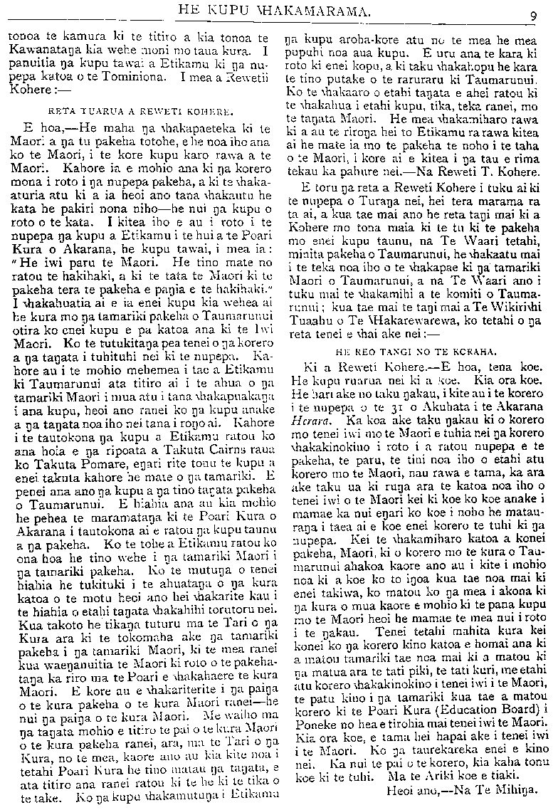 8 TE PIPIWHARAUROA. HE TAUNU KI TE IWI MAORI. ITE korenga o te Paura, Minita mo nga kura, i whakaae ki te tono a nga pakeha o Tau- marunui kia wehea he kura mo a ratou tama- riki i te kura Maori ka pukuriri, katahi ka timata te korero kino mo nga tamariki Maori o Taumarunui puta atu ki o ratou matua, puta atu hoki ki te iwi Maori katoa. Ko nga korero tawai i tukua ki te nupepa o Akarana, ki te Niu Tireni Herara. Kia rua noa o nga reta e tuhituhi ko nga mea tino kino, ko nga ingoa o te hunga na ratou nga reta i hunaia. RETA TUATAHI A TE PAKEHA KI TE ETITA O TE N.T. HERARA. E hoa,—Ko te toru tenei o nga tau i tono kura ai nga pakeha o Taumarunui kia whaka- turia he kura Poari mo a ratou tamariki i te mea ko nga mea e whakaakona ana i te kura Maori kahore i rite mo nga tamariki pakeha. Ehara i te mea ko te noho tahi i te taha o te Maori te tino take. Kua whakaaetia he kura Poari. No taua wa ano ka tae mai he kai-wha- kaako hou mo te kura Moori. I tono tenei tangata kia whakanuia te kura Maori a rite tonu tona hiahia, wareware noa iho te kupu oati mo te kura Poari, a inaianei kua waiho tenei mea hei pakanga i te tohe tonu o nga pakeha kia homai he kura ke mo a ratou tamariki. E marama ana nga take i tonoa ai kia wehea he kura. E kore e taea te whakahua te taha ki nga mahi hara. Ko etahi atu take, ka hoki mai nga tamariki i te kura ki tonu i te kutu ma. E mohio ana au i tahuna e tetahi wahine nga kakahu o tana tamaiti kia ngaro ai te kutu. E pangia ana ano nga tamariki pakeha e te mare Maori, e te hakihaki o te Maori. Ko te wai pirau e rite ana ki te puawai ina ki te ruma kura i te tamariki Maori i nga ra Raumati. Otira kua ki ake au he mea tenei e taea te titiro. Ko to matou hiahia he kura Poari e utu reiti nei matou, he komiti pakeha a e taea e matou te mea te whare kura me nga tamariki kia ma. Na " Kore-e-nukunuku." ingoa ake. He tu tonu no te tangata e huna ana i o ratou ingoa te whakahua i.nga kupu e kore nei e taea e ratou me i mohiotia ana o ratou ingoa. He pa kuhunga no te tutua te kore ingoa, te korero teka. E marama noa iho ana te teka o nga korero a " Kore-e-nukunuku." I whaka- paea tekatia ano nga kura Maori o te Tai Ra- whiti nei, engari kaore hoki i pena rawa te Atua— koretanga o nga kupa, kaore rawa pea ia i pena te kino o nga kupu a nga iwi Atuakore. Na runga i tenei whakapae ka haere te Minita pukumahi o nga Kura ki te Tai Rawhiti kia kite a kanohi ia i aua kura, a tona putanga ki Akarana kahore i ruarua tana kupu, mea ana ia " Ko te kura tino paru atu o nga kura Maori ma ke atu i te kura tino ma atu o te pakeha." I kawa enei kupu ki nga pakeha tautoko i nga kura Poari otira he kupu e whakaaetia e nga tangata e tino mohio ana ki nga kura Maori me nga kura pa- keha. No te ahua pea o te Minita ki nga pakeha o Taumarunui i puta ai i a " Kore-e- nukunuku" ana kupu tawai. Otira he aha i patua kohurutia ai ko te Maori i kore ai e patua ko te Minita? Ko te take pea he iwi wahangu hoki te Maori, he iwi kuware, kahore ratou e rongo ana ki nga korero kino mo ratou i roto i nga nupepa a te pakeha. He whakatauki matau ta te pakeha, maku e korero ki a " Kore-e-nukunuku, koia tenei " Ko te hunga e noho ana i roto i nga whare-karahi, kaua e pangapanga kohatu." Na Reweti T. Kohere. Te Rau Kareti, Gisborne. RETA TUATAHI A REWETI KOHERE KI TE ETITA O TE N.T. HERARA. E hoa,—Na tetahi hoa oku, he tangata no Akarana, i whakaatu mai ki a au te reta a " Kore-e-nukunuku " o te 1 o Akuhata, a i tohe ia ki a au kia whakautu i taua reta, no te mea kua whakautu au i etahi reta whakahe mo nga kura Maori; engari i ruarua toku ngakau i te mea kahore au e mohio ki Taumarunui, a he whakaaro hoki noku ko nga korero pera me a " Kore-e-nukunuku" kaua e arongia atu, engari me whakahawea, i huna hoki e ia tona tino RETA TUARUA A TE PAKEHA. E hoa,—Ki taku whakaaro e tika ana te tono a nga pakeha o Taumarunui kia homai he kura mo ratou, hei painga mo a ratou tamariki. Kahore te Minita mo nga Kura i ata whakaaro inahoki te taikaha o tana whakahoki ki nga pakeha o Taumarunui. Ki taku whakaaro ehara i te mea na te kara o te Maori i tohe ai nga pakeha o Taumarunui kia wehea he kura mo a ratou tamariki, kaore hoki tera mea te kara e tirohia ana i Niu Tireni. Ko te tino take mo te ahua o te tinana. Ki te whakapiria etahi tamariki pakeha ki te taha o te Maori ko te mate pu aua tamariki, heoi e kore rawa e whakaaetia e tenei whenua kia tuku te tangata i tana tamaiti ki te mate tuturu ara ki te tukua ki te kura Maori. Na " Te Hoa o nga Tamariki." I muri mai i enei reta ka tu te hui a te Poari Kura o Akarana i puta ai nga kupu tawai a tetahi pakeha ko Etikamu (Edgecombe) tona ingoa, a whakaaetia ana e te Poari kia ata tiro- hia te tono a nga pakeha o Taumarunui, kia