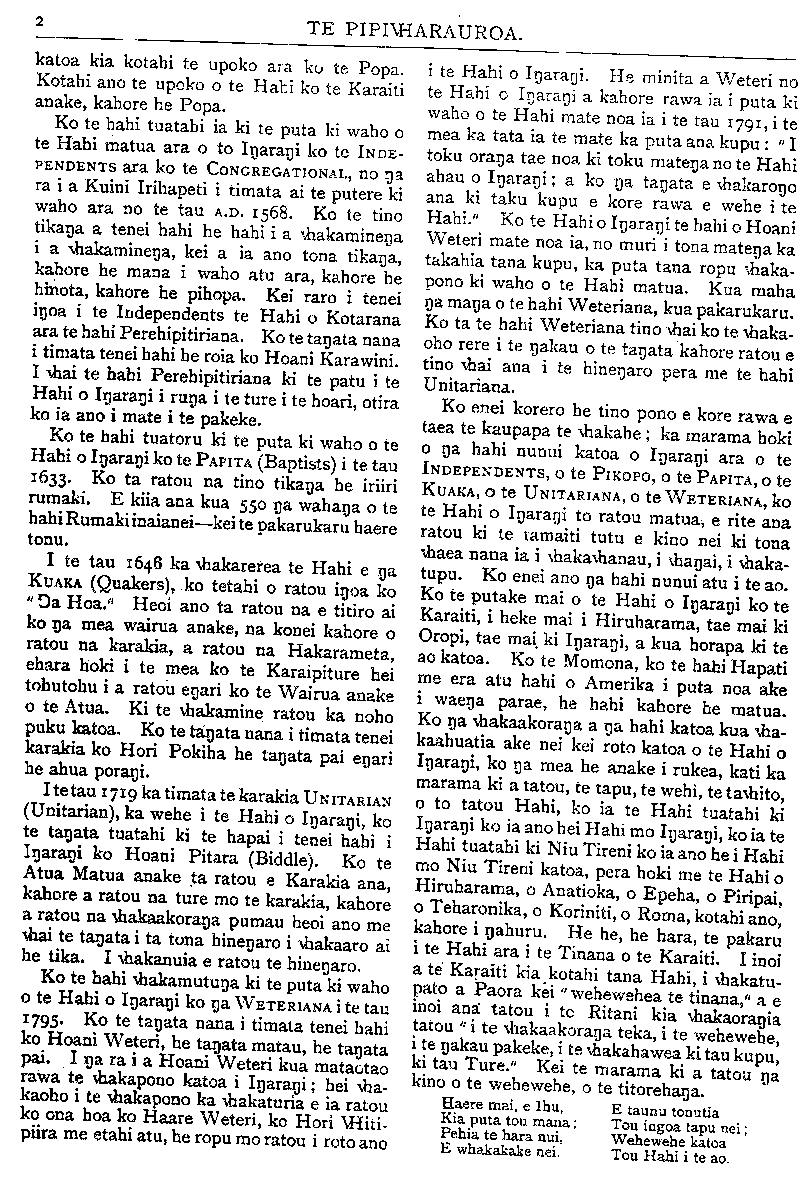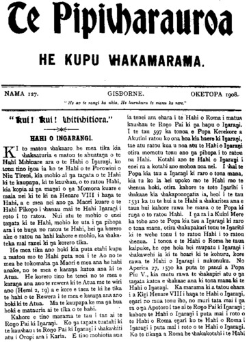 Te Pipiwharauroa HE KUPU WHAKAMARAMA. NAMA 127. GISBORNE. " He ao te rangi ka uhia, He huruhuru te manu ka rere." OKETOPA 1908.. "Kui! Kui! Whitiwhitiora." HAHI O INGARANGI. KI to matou whakaaro he mea tika kia whakaaturia e matou te ahuatanga o te Hahi Mihinare ara o te Hahi o Ingarangi, ko tona tino ingoa ia ko te Hahi o te Porowini o Niu Tireni, kia mohio ai nga tangata o te Hahi ki te kaupapa, ki te kauwhau, o to ratou Hahi, kia kopia ai nga mangai o nga Momona kuare e maia nei ki te ki na Henare VIII i hanga te Hahi, a e mea nei ano nga Maori kuare o te Hahi Pikopo i whanau mai te Hahi Ingarangi i roto i to ratou. Nui atu te mohio o enei tangata ki te Hahi, mohio ke uta i nga pihopa ara i te hunga no ratou te Hahi, hei nga korero ake o ratou na hahi kahore e mohio, ka whaka- teka mai ranei ki nga korero tika. He mea tika ano hoki kia puta etahi kupu a matou mo te Hahi puta noa i te Ao no te mea he tokomaha nga Maori e mea ana he hahi anake, no te mea e karanga katoa ana ki te Atua. He korero tino he tenei no te mea e karanga ana ano te rewera ki te Atua me te wiri ano (Hemi 2, 19) a e kore e taea te ki he tika te hahi o te Rewera i te mea e karanga ana ano hoki ki te Atua. Ma te kaupapa ke ma nga hua hoki e matauria ai te tika o te hahi. Kahore e tino marama te tau i tae ai te Rongo Pai ki Ingarangi. Ko nga tangata tuatahi ki te kauwhau i te Rongo Pai ki Ingarangi i whakawhiti atu i Oropi ara i Karia. E tino mohiotia ana ia tenei ara ehara i te Hahi o Roma i matua kauwhau te Rongo Pai ki nga hapu o Ingarangi. I te tau 597 ka tonoa e Popa Kerekere a Akutini ratou ko ona hoa kia haere ki Ingarangi, tae atu ratou kua u noa atu te Hahi o Ingarangi otira momotu tonu ano nga pihopa i to ratou na Hahi. Kotahi ano te Hahi o Ingarangi i enei ra a kotahi ano mohoa noa nei. I whai te Popa kia tau a Ingarangi ki raro o tona mana, kia tu ko ia hei upoko mo te Hahi mo te whenua hoki, otira kahore te toto Ingarihi i whakaae kia whakaponongatia ia, heoi i te tau 1531 ka tu te hui a te Hahi a whakaritea ana e taua hui kahore rawa he mana o te Popa ki runga o to ratou Hahi. I nga ra i a Kuini Mere ka tohe ano te Popa kia tau a Ingarangi ki raro o tona mana, otira whakapakari tonu te Ingarihi ki te wehe tonu i to ratou Hahi i to ratou whenua. I tonoa e te Hahi o Roma he taua kaipuke, he ope hoia hei raupatu i Ingarangi i whakawehi ia ki te hoari ki te kohuru, kore rawa te Hahi o Ingarangi i nukunuku. No Aperira 27, 1570 ka puta te panui a Popa Piu V., kia mutu rawa te whakapiri atu o nga tangata katoa e whakaae ana ki tona mana ki te Hahi o Ingarangi. Ka marama ki a tatou ehara i a Kingi Henare VIII i hanga te Hahi o Ingarangi, engari no mua tonu iho, no muri tata mai i nga ra o nga Apotoro i tae ai te Rongo Pai ki Ingarangi; kahore te Hahi o Ingarangi i puta mai i roto o te Hahi o Roma engari ko te Hahi o Roma i Ingarangi i puta mai i roto o te Hahi o Ingarangi. Ko te tikanga a Roma he whakakotahi i te Hahi