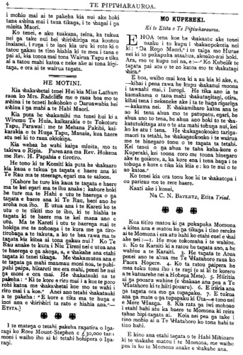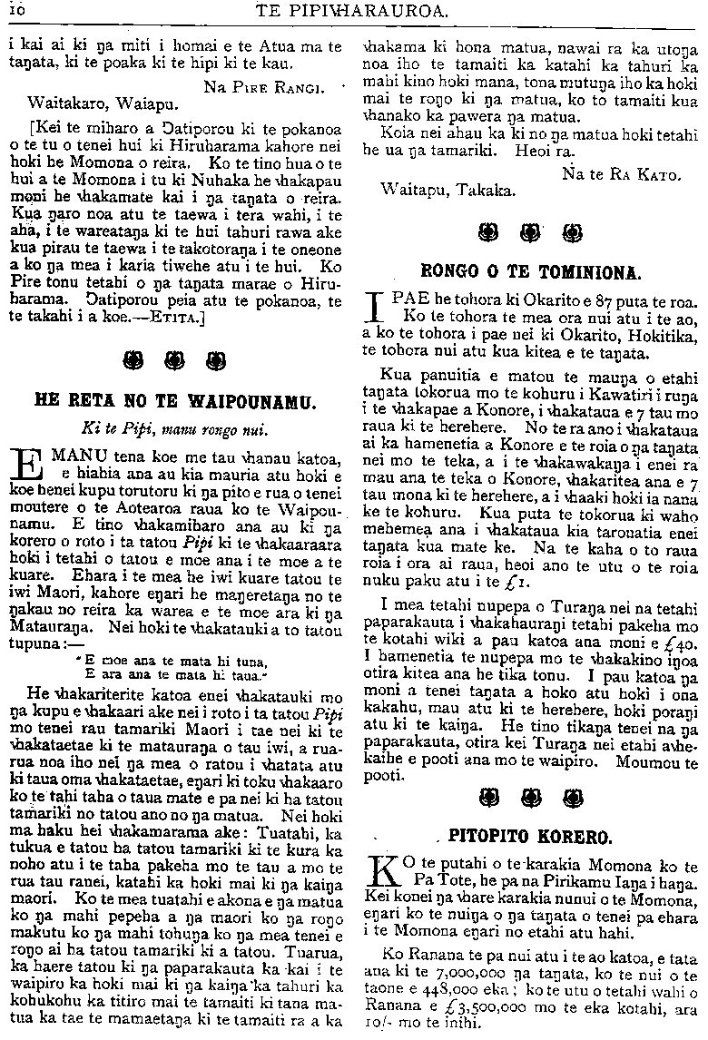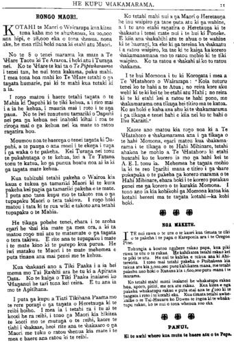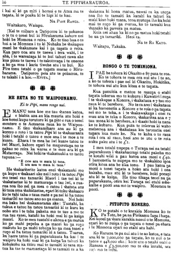 IO TE PIPIWHARAUROA. i kai ai ki nga miti i homai e te Atua ma te tangata, ki te poaka ki te hipi ki te kau. Na PIRE RANGI. Waitakaro, Waiapu. [Kei te miharo a Ngatiporou ki te pokanoa o te tu o tenei hui ki Hiruharama kahore nei hoki he Momona o reira. Ko te tino hua o te hui a te Momona i tu ki Nuhaka he whakapau moni he whakamate kai i nga tangata o reira. Kua ngaro noa atu te taewa i tera wahi, i te aha, i te wareatanga ki te hui tahuri rawa ake kua pirau te taewa i te takotoranga i te oneone a ko nga mea i karia tiwehe atu i te hui. Ko Pire tonu tetahi o nga tangata marae o Hiru- harama. Ngatiporou peia atu te pokanoa, te te takahi i a koe.—ETITA.] HE RETA NO TE WAIPOUNAMU. Ki te Pipi, manu rongo nui E MAN U tena koe me tau whanau katoa, e hiahia ana au kia mauria atu hoki e koe henei kupu torutoru ki nga pito e rua o tenei moutere o te Aotearoa raua ko te Waipou- namu. E tino whakamiharo ana au ki nga korero o roto i ta tatou Pipi ki te whakaaraara hoki i tetahi o tatou e moe ana i te moe a te kuare. Ehara i te mea he iwi kuare tatou te iwi Maori, kahore engari he mangeretanga no te ngakau no reira ka warea e te moe ara ki nga Matauranga. Nei hoki te whakatauki a to tatou tupuna— E moe ana te mata hi tuna, E ara ana te mata hi taua." He whakariterite katoa enei whakatauki mo nga kupu e whakaari ake nei i roto i ta tatou Pipi mo tenei rau tamariki Maori i tae nei ki te whakataetae ki te matauranga o tau iwi, a rua- rua noa iho nei nga mea o ratou i whatata atu ki taua oma whakataetae, engari ki toku whakaaro ko te tahi taha o taua mate e pa nei ki ha tatou tamariki no tatou ano no nga matua. Nei hoki ma haku hei whakamarama ake Tuatahi, ka tukua e tatou ha tatou tamariki ki te kura ka noho atu i te taha pakeha mo te tau a mo te rua tau ranei, katahi ka hoki mai ki nga kainga maori. Ko te mea tuatahi e akona e nga matua ko nga mahi pepeha a nga maori ko nga rongo makutu ko nga mahi tohunga ko nga mea tenei e rongo ai ha tatou tamariki ki a tatou. Tuarua, ka haere tatou ki nga paparakauta ka kai i te waipiro ka hoki mai ki nga kainga ka tahuri ka kohukohu ka titiro mai te tamaiti ki tana ma- tua ka tae te mamaetanga ki te tamaiti ra a ka whakama ki hona matua, nawai ra ka utonga noa iho te tamaiti ka katahi ka tahuri ka mahi kino hoki mana, tona mutunga iho ka hoki mai te rongo ki nga matua, ko to tamaiti kua whanako ka pawera nga matua. Koia nei ahau ka ki no nga matua hoki tetahi he ua nga tamariki. Heoi ra. Na te RA KATO. Waitapu, Takaka. RONGO O TE TOMINIONA. I PAE he tohora ki Okarito e 87 puta te roa. Ko te tohora te mea ora nui atu i te ao, a ko te tohora i pae nei ki Okarito, Hokitika, te tohora nui atu kua kitea e te tangata. Kua panuitia e matou te maunga o etahi tangata tokorua mo te kohuru i Kawatiri i runga i te whakapae a Konore, i whakataua e 7 tau mo raua ki te herehere. No te ra ano i whakataua ai ka hamenetia a Konore e te roia o nga tangata nei mo te teka, a i te whakawakanga i enei ra mau ana te teka o Konore, whakaritea ana e 7 tau mona ki te herehere, a i whaaki hoki ia nana ke te kohuru. Kua puta te tokorua ki waho mehemea ana i whakataua kia taronatia enei tangata kua mate ke. Na te kaha o to raua roia i ora ai raua, heoi ano te utu o te roia nuku paku atu i te £1. I mea tetahi nupepa o Turanga nei na tetahi paparakauta i whakahaurangi tetahi pakeha mo te kotahi wiki a pau katoa ana moni e £40. I hamenetia te nupepa mo te whakakino ingoa otira kitea ana he tika tonu. I pau katoa nga moni a tenei tangata a hoko atu hoki i ona kakahu, mau atu ki te herehere, hoki porangi atu ki te kainga. He tino tikanga tenei na nga paparakauta, otira kei Turanga nei etahi awhe- kaihe e pooti ana mo te waipiro. Moumou te pooti. PITOPITO KORERO. KO te putahi o te karakia Momona ko te Pa Tote, he pa na Pirikamu langa i hanga. Kei konei nga whare karakia nunui o te Momona, engari ko te nuinga o nga tangata o tenei pa ehara i te Momona engari no etahi atu hahi. Ko Ranana te pa nui atu i te ao katoa, e tata ana ki te 7, 000, 000 nga tangata, ko te nui o te taone e 448,000 eka; ko te utu o tetahi wahi o Ranana e £3, 500, 000 mo te eka kotahi, ara 10/- mo te inihi.